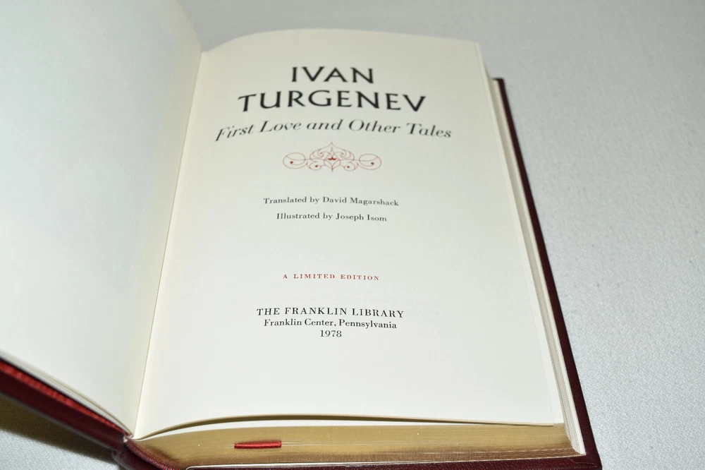 From the Franklin Library World's Greatest Writers Collection... First Love and Other Stories by Ivan Turgenev Illustrated by Joseph Isom Copyright 1978 by The Franklin Library Premium Full Leather Binding This volume contains all of these classic Franklin Library trimmings: Premium Leather Binding Silk Moire Endleaves Distinctive Cover Design Hubbed Spine, Accented in Gold Satin Ribbon Page Marker Gilded Page Edges Long-lasting, High Quality Acid-neutral Paper Beautiful Illustrations A very scarce title in any condition, this 1978 edition is in Fine condition. The front and back covers are in terrific condition and the gilded page edges show hardly any wear (see pictures of all sides). There are no markings, bookplates, or other signs of prior ownership in this book. This World's Greatest Writers Edition was published by The Franklin Library and would be a beautiful addition to your Franklin Library book collection. Overall, this copy is a grade collector's book. This book is very elusive in this superior condition, as only a limited number of them were ever published, so now is the time to act. Hopefully you can add this book to your collection and enjoy it in the years to come... Please Email Me With Any Questions You Might Have! Shipping Info: Buyer to Pay Shipping and Handling International Bidders Pay Extra Shipping Seller Not Responsible For Uninsured Items Lost or Damaged in Mail Forms of Payment Accepted: Paypal Good luck and happy bidding! Powered by eBay Turbo Lister The free listing tool. List your items fast and easy and manage your active items.