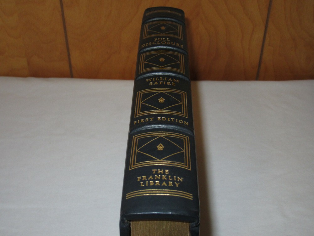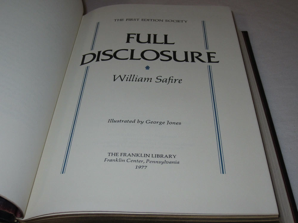From the Franklin Library First Edition Society Collection... Full Disclosure by William Safire Illustrated by George H. Jones Copyright 1977 by The Franklin Library Premium Full Leather Binding This volume contains all of these classic Franklin Library trimmings: Premium Full-Leather Binding Silk Moire Endleaves Distinctive Cover Design Hubbed Spine, Acccented in Gold Satin Ribbon Page Marker Gilded Page Edges Long-lasting, High Quality Acid-neutral Paper Beautiful Illustrations A very scarce title in any condition, this copy is in Fine condition. The front and back covers are in near perfect condition and the gilded page edges show hardly any wear (see pictures). There are no markings, bookplates, or other signs of prior ownership in this book. This book is part of First Edition Society Collection published by The Franklin Library. It would be a beautiful addition to your Franklin Library book collection. Hopefully you can add this book to your collection and enjoy it in the years to come... Please Email Me With Any Questions You Might Have! Shipping Info: Buyer to Pay Shipping and Handling International Bidders Pay Extra Shipping Seller Not Responsible For Uninsured Items Lost or Damaged in Mail Forms of Payment Accepted: Paypal Good luck and happy bidding! Powered by eBay Turbo Lister The free listing tool. List your items fast and easy and manage your active items.