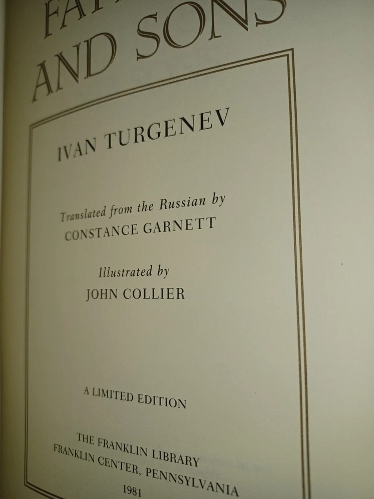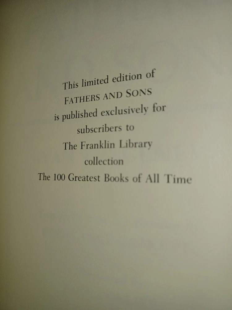This exquisite book from Franklin Library is a limited edition of Fathers and Sons by Ivan Turgenev. The leather binding adds a touch of luxury to the book, making it a collector's item for book enthusiasts. The book is in pristine condition and has never been read, ensuring that the pages are crisp and untouched. It was printed in 1981, making it a vintage masterpiece that is perfect for literature enthusiasts. The book is a great addition to any personal library and is an ideal gift for anyone who loves literature.