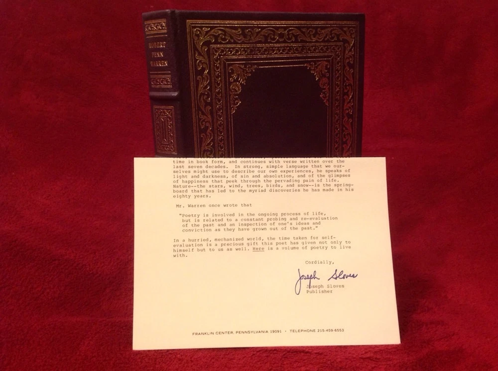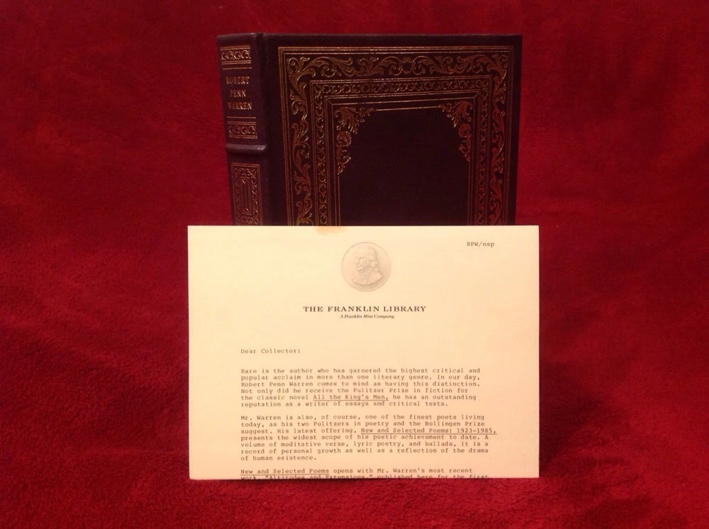 Absolutely stunning! The Franklin Library’s first edition of *New & Selected Poems* by Robert Penn Warren is a true collector’s gem. The premium leather binding feels luxurious, and the signed authenticity adds incredible value. As part of the exclusive Signed First Edition Society, this piece is both rare and beautifully crafted—perfect for literary enthusiasts. Pristine condition, classic elegance, and a must-have for any serious poetry lover. Highly recommend!