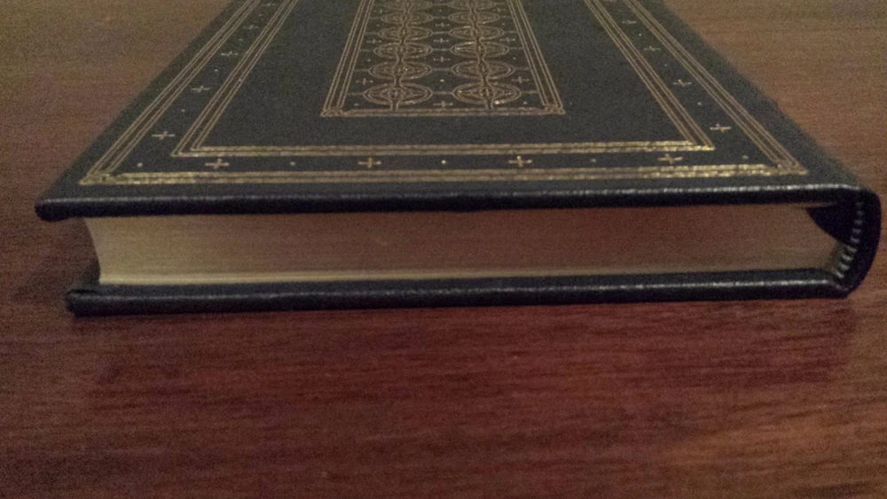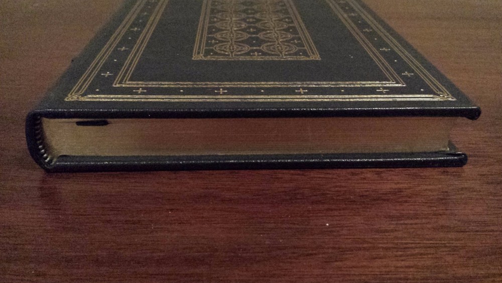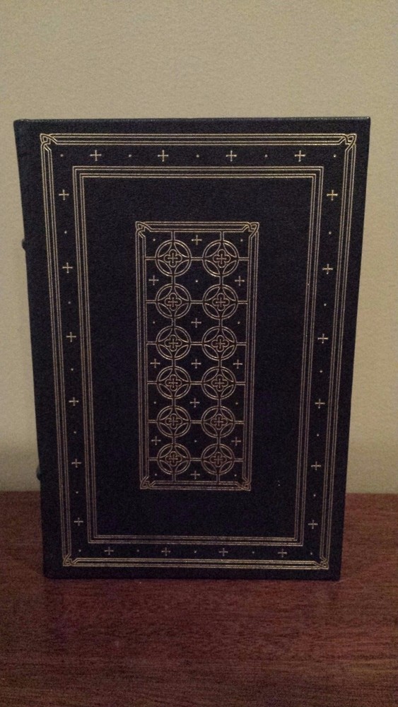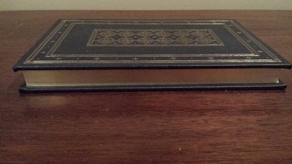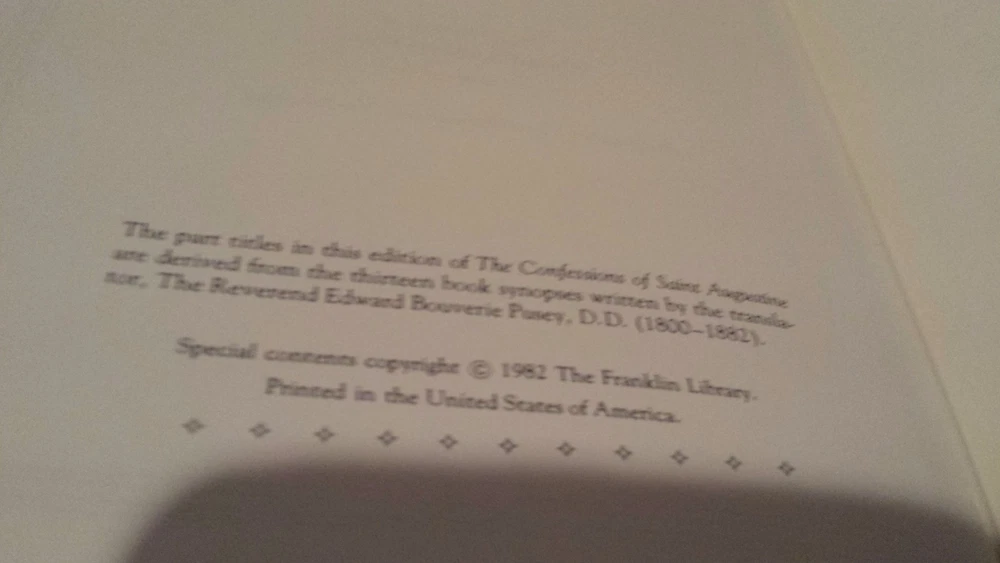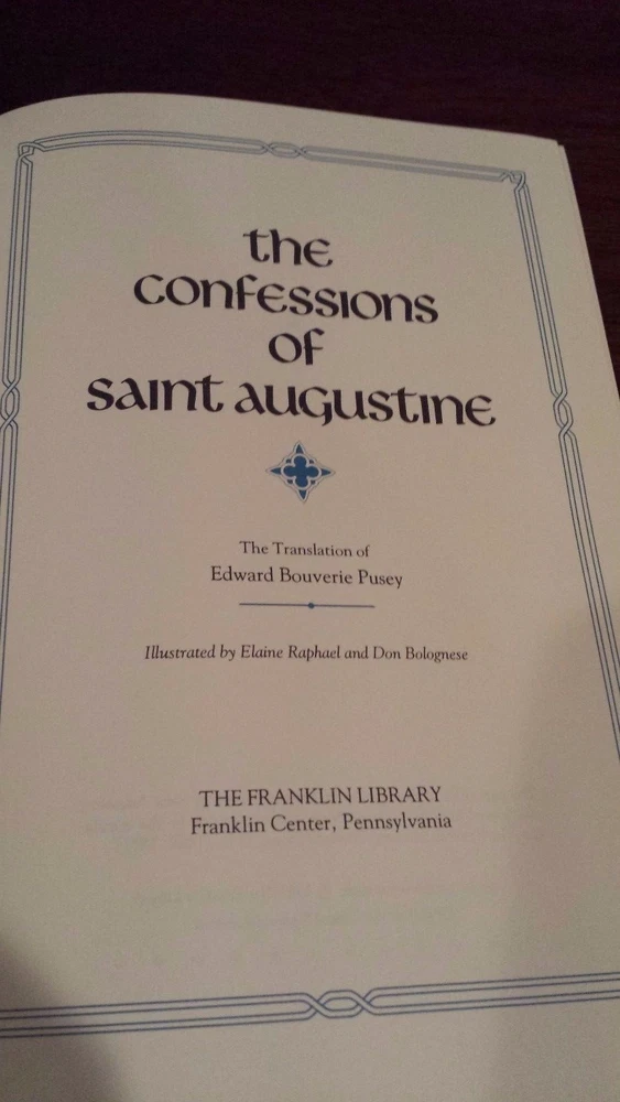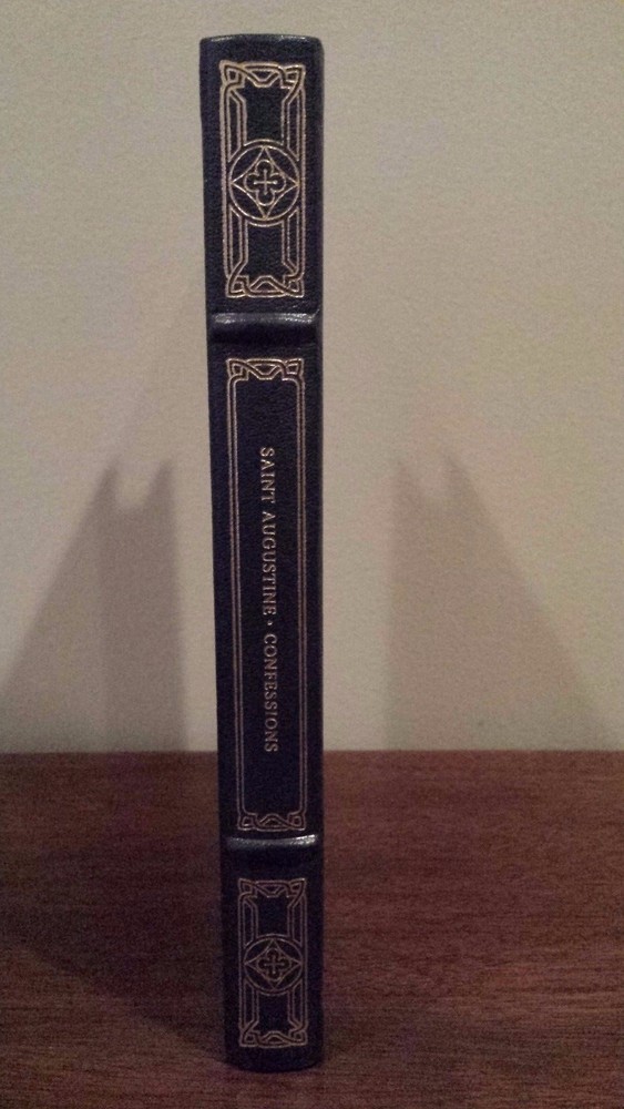 Gorgeous Franklin Library Confessions by Saint Augustine (1982). This gorgeous book is in FINE condition. It is full leather with a VERY RARE COVER! It is my understanding that it is a first edition first printing, a first run printing prior to being designated a title in a Franklin series. End pages are decorative marbled paper. Satin sewn-in bookmark. Steel blue and gold full leather binding, raised hubs, and gold gilt edges. 8vo - roughly 9" x 6". 312 pages. Translation by Edward Bouverie Pusey. Illustrated by Elaine Raphael and Don Bolognese. Please note that those are shadows from my camera on the title and other interior page pictures, not stains, blemishes or watermarks. No returns and sold AS IS, but am happy to answer any questions of provide additional pictures. I want you to be completely happy with your purchase. Payment is expected within 48 hours of auction end unless other arrangements have been made in advance, and item will ship within 1-3 business days of payment verification.