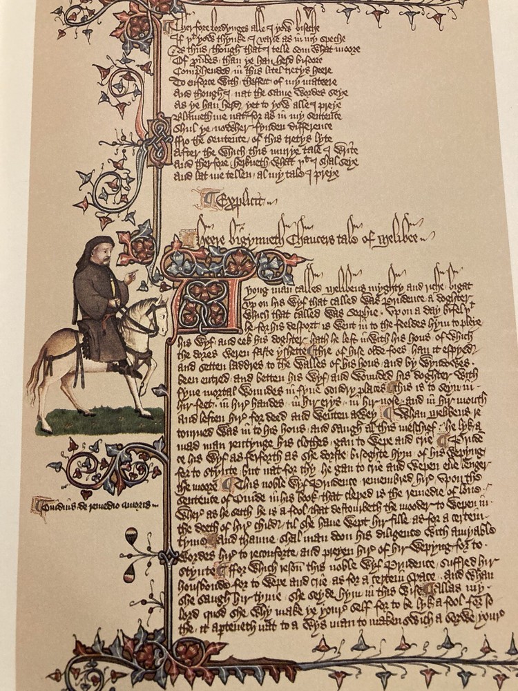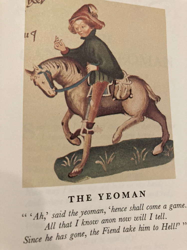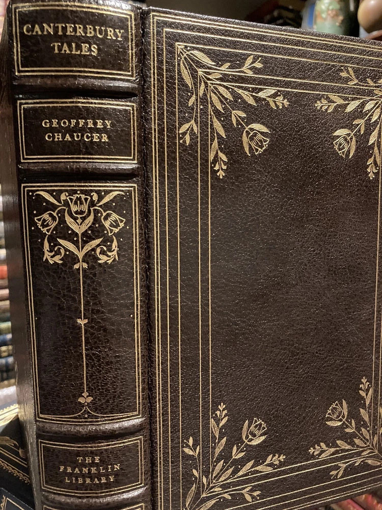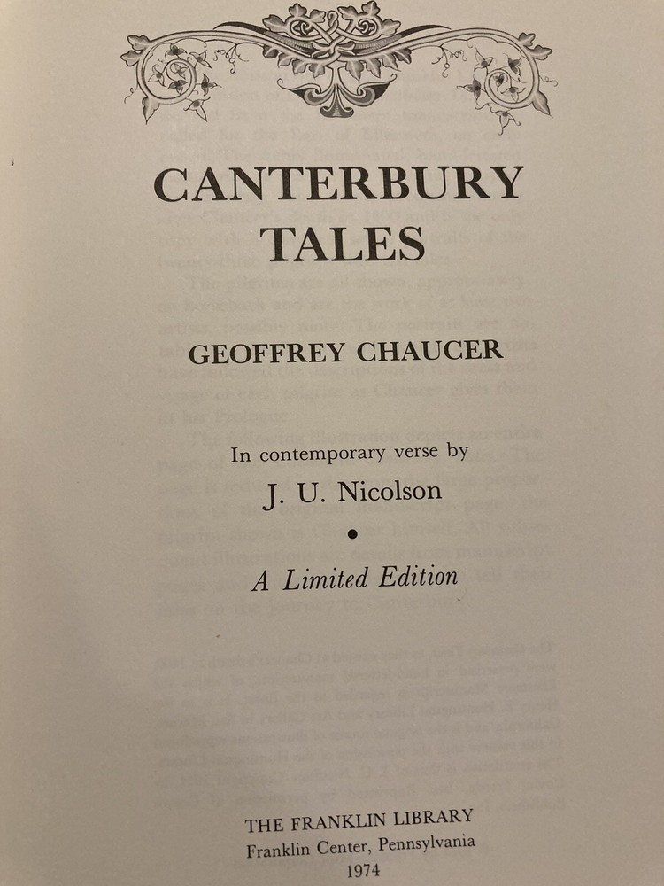 Franklin Library leather edition of Geoffrey Chaucer's "Canterbury Tales," In contemporary verse by J.U. Nicholaon, Illustrated with hand-lettered Ellesmere Manuscript as they existed in 1400, a Limited edition, one of the 100 GREATEST BOOKS OF ALL TIME series, published in 1974. Bound in hunter green leather, the book has orange French moire silk end leaves, acid-free paper, Symth-sewn binding, hubbed spine, a satin book marker, gold gilding on three edges--in near FINE condition. Geoffrey Chaucer, who lived from 1345-1400, the son of John Chaucer, was married Philippa and lived around nobility all his life. When he died, he was buried in Westminister Abbey, the first POET in what is now known as the "Poet's corner." "The Canterbury Tales" is a collection of over 20 stories written in Middle English. The tales are presented as part of a story-telling contest by a group of pilgrims as they travel together on a journey from the Southwark Inn in London to the shrine of Saint Thomas Becket at Canterbury Cathedral. [Beckett was murdered in 1170 inside the Cathedral.] Chaucer uses the tales and the descriptions of its characters to paint an ironic and critical portrait of English society at the time, and particularly of the Church. The reader will meet the memorable characters: The Monk, the Friar, the busy lawyer---or "so he seems," Nuns, the Summoner, the Squire---who has returned from the Holy Land while serving his father---the noble Knight; the Oxford clerk--or student---more interested in books and literature than horses, clothes, or fine food; his motto is: "gladly would he learn and gladly would he teach; the Cook---who is working for the 'Guildsmen,'---the weaver, the dyer, the carpenter, the haberdasher, and the candle maker; the Miller---who grinds corn and cheats with his 'wicked thumb' on the scales; his filthy tale of sexual indulgences and revenge begins a series of "love or sexual tales"; the 'greedy' Pardoner---who misuses his position by selling " sexual indulgences" and fake artifacts such as cloth he claims came from Christ's; the Wife of Bath---who joyfully admits she likes sex, has been married five times and enjoys going on holidays to visit Christian shrines---she has the men laughing and enjoying her prologue about what "women want most"; she blames her sexy nature on her star: Venus and her mean streak on Mars; the Reeve, the Merchant, the wealthy Franklin; the physician---who is more interested in his 'fee' than in healing his patients, the Prioress---prim and proper but somewhat a fake, especially with her fake French accent; the Monk, the lowly Parson---a fine man who visits all his parish---poor as well as rich; and the Knight---a fine man who has returned from fighting the 'infidels' in the Holy Land---all the classes of English society of the fourteenth century---except the nobility. 634 pages. I offer Combined shipping.