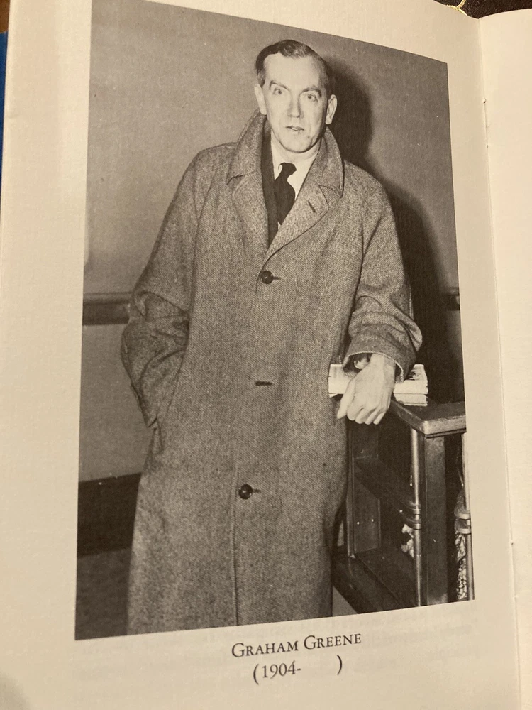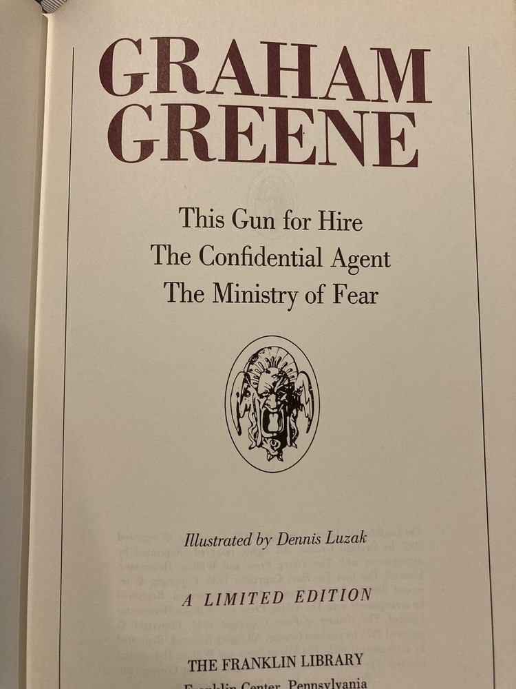 Franklin Library leather edition of Graham Greene's "This Gun for Hire, The Confidential Agent, and The Ministry of Fear," a Limited edition, illustrated by Dennis Lizak, Frontispiece portrait of Graham Greene, one of the COLLECTED STORIES OF THE WORLD'S GREATEST WRITERS series, published in 1978. Bound in gray leather, the book has matching French moire silk end leaves, acid-free paper, Symth-sewn binding, a satin book marker, hubbed spine, and gold gilding on three edges---in Very Good/near FINE condition---except for 'moderate' imperfection to top gilt. Graham Greene was born in 1904 in Berkhampsted, England, the son of a school headmaster. He graduated from OXFORD, and settled into journalism. Greene was 6 3" tall, lanky and frail with arresting blue eye and a thick hairy chest. At age 26, he became a Catholic and married Vivien. Written earlier in his career, these volumes are set in LONDON between 1930 and 1945, years of uncertain peace, mounting premonition, and finally, the horrors of the German blitz. With fast-paced action, the terror of pursuer and pursued, unforgettable characters in authentically seedy settings---the novels are nail biters. 722 pages. I offer Combined shipping.