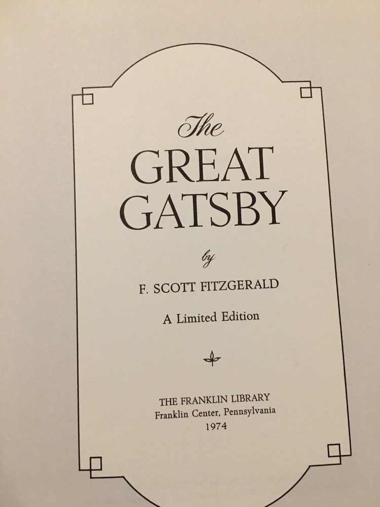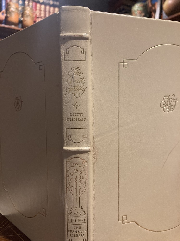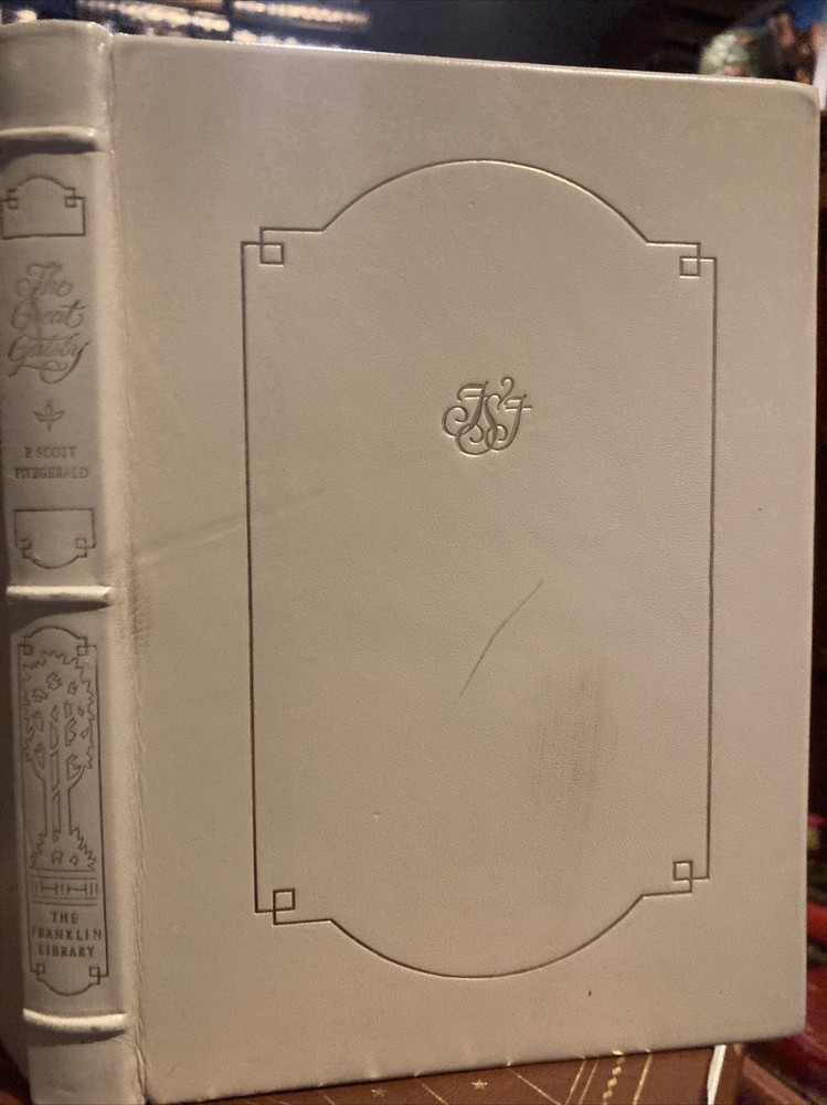 Franklin Library leather edition of F. Scott Fitzgerald's "The Great Gatsby," a Limited edition, one of the 100 GREATEST BOOKS OF ALL TIME series, published in 1974. Bound in white leather, the book has brown silk end leaves, a satin book marker, acid-free paper, Symth-sewn binding, hubbed spine, gold gilding on three edges---in near FINE condition. F. Scott Fitzgerald, who lived from 1896-1940, was born in St. Paul, MINNESOTA. He married Zelda Sayre, an Alabama beauty, and they lived in Europe and were part of the group that Gertrude Stein called the "lost generation." " The Great Gatsby," published in 1925, follows a cast of characters living in the fictional town of WEST EGG on prosperous LONG ISLAND in the summer of 1922. The story concerns the young and mysterious millionaire, JAY GATSY, and his quixotic passion and obsession for the beautiful former debutante, DAISY BUCHANAN. The novel explores themes of decadence, idealism, resistance to change, social upheaval and excess, creating a portrait of the Jazz Age or the Roaring Twenties that has been described as a cautionary tale regarding the American Dream. 178 pages. I offer Combined shipping.