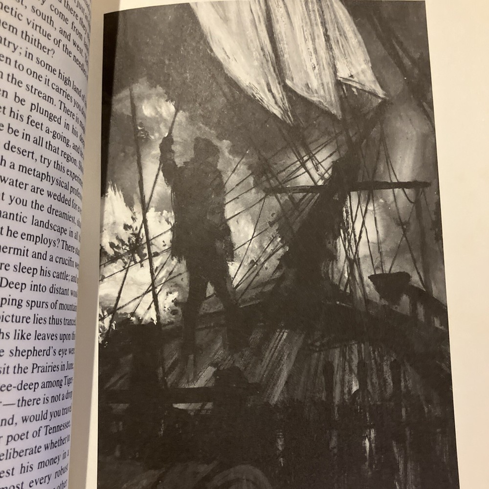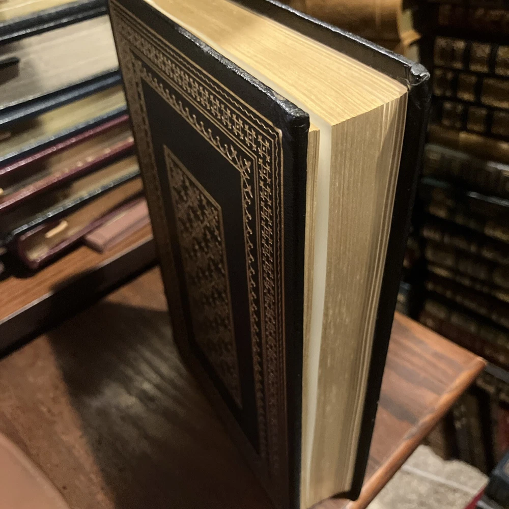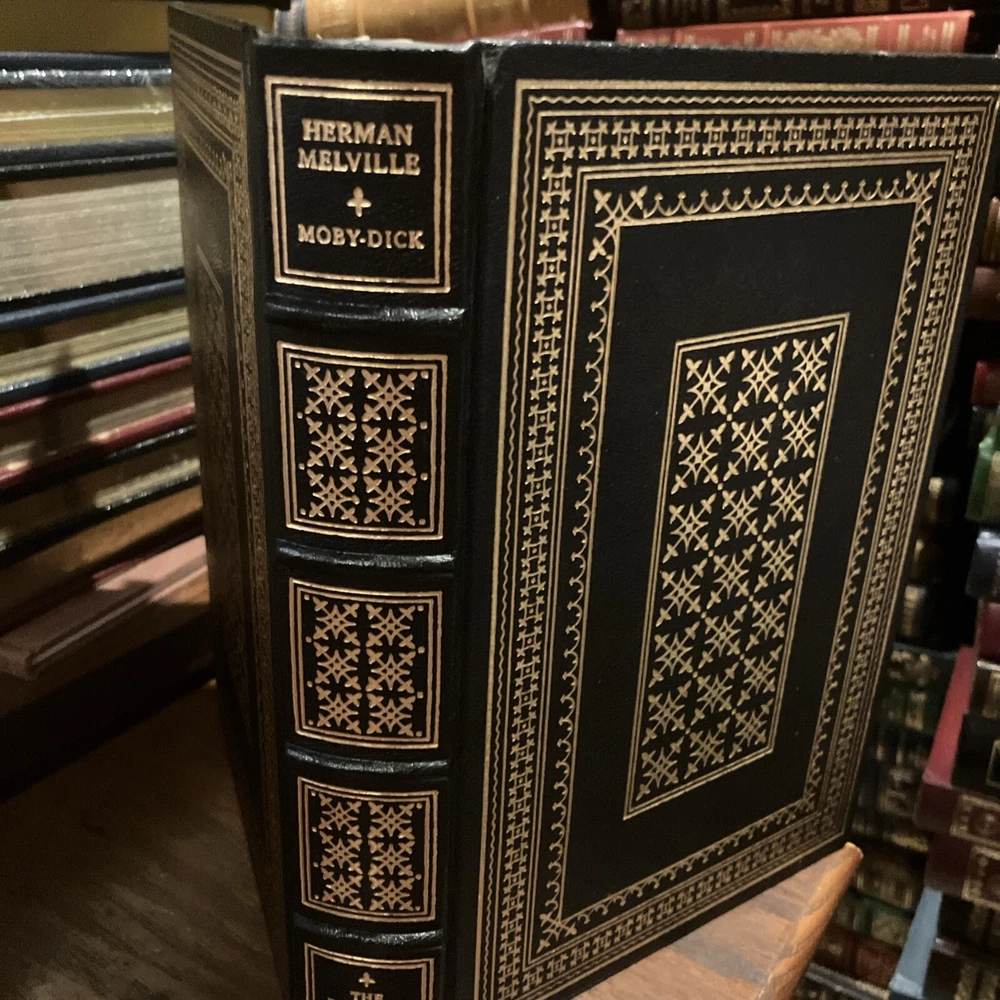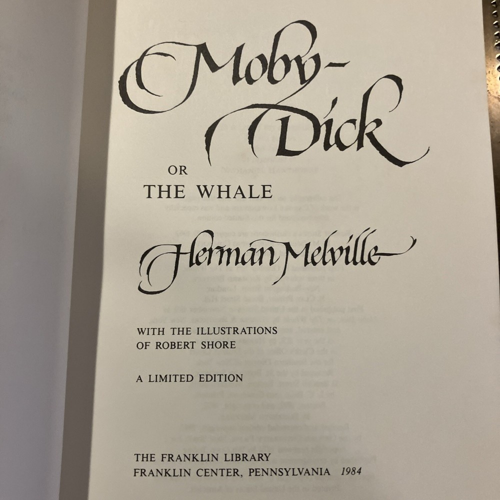 Franklin Library leather edition of Herman Melville's "Moby Dick or the Whale," a Limited edition, published in 1984. Bound in hunter green leather, the book has French moire silk end leaves, acid-free paper, Symth-sewn binding, a satin book marker, hubbed spine, gold gilding on three edges---in near FINE condition---except for 'moderate' fading on edges of moire silk and minor imperfection to gilt on fore edge. Herman Melville, who lived from 1819-1891, was born in New York City, the son of a cultivated gentleman who went bankrupt. Young Herman's schooling ended when he was 15, and after clerking in a NY bank, farming and teaching, he shipped as a cabin-boy to Liverpool in 1839. Later he sailed on the ACUSHNET for the SOUTH SEA, and this 18-month voyage provided a factual basis for "Moby Dick." Having completed his education in what he later termed "the only HARVARD and YALE" that were open to me, he began writing. "Moby Dick" opens with classic line: "Call me Ishmael. . . Whenever I find myself growing grim about the mouth; whenever it is a damp drizzly November in my soul. . .I count it high time to get to sea as soon as I can. This is my substitute for pistol and ball." "What of it, if some old hunks of a sea-captain orders me to get a broom and sweep down the decks? What does that indignity amount to, weighed, I mean, in the scales of the new Testament?" Ishmael goes to NEW BEDFORD where he signs for a voyage on the whaler PEQUOD, drawing as his roommate QUEEQUEP, a Polynesian prince. The two become comrades. After hearing a symbolic sermon by FATHER MAPPLE, they join their ship, which leaves NANTUCKET on Christmas Day. The captain, AHAB, is a monomaniac whose one purpose is to capture the fierce, cunning white whale, MOBY DICK, which had torn away his leg during their last encounter. Others in the crew included: Fedallah, the American Indian harpooner, Tashtego; the African, Daggoo, the Negro cabin boy, Pip. The voyage carries the Pequod nearly around the world. "The ship, like Satan, would not sink to hell till she had dragged a living part of heaven along with her, and helmeted herself with it. . ." Ishmael---like Yossarian in Joseph Heller's "Catch 22"--- survives! The Epilogue quotes Job: "And I only am escaped alone to tell thee." 527 pages. I offer Combined shipping.