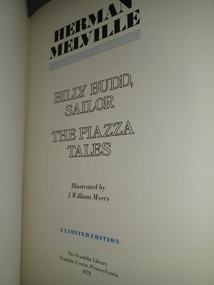This is a limited edition leather-bound book by Herman Melville, published by Franklin Library in 1978. The book includes two of Melville's works, Billy Budd Sailor and Piazza Tales, and has never been read before. It is a great addition to any collection of literature, especially for fans of Melville's writing. The book is in excellent condition and is a true collector's item, perfect for anyone who enjoys literature and is looking for a unique piece to add to their collection. The pages are clean and crisp, and the binding is tight and sturdy. This is a must-have for any serious book collector.