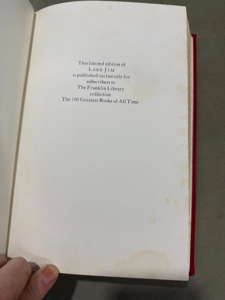 Lord Jim by Joseph Conrad Franklin Library 100 Greatest Books Series Very Good Plus Condition ! New Books get listed daily !!! 100s of Easton Press and Franklin Library books available!! All books get cleaned with a leather cleaner to remove any dust, odor and restore the beauty of leather!! Combined Shipping Discount: USA buyers - every book $1 off International combined shipping: 1 or 2 books - $45 3 or 4 books - $75 5 + books $17 per book 10+ books $13 per book WE SHIP DAILY!! RETURNS: Hassle-Free 30-days return policy and we pay for a return !! Check our Inventory (Link to eBay Store): http://stores.ebay.com/EastonFranklinBooks