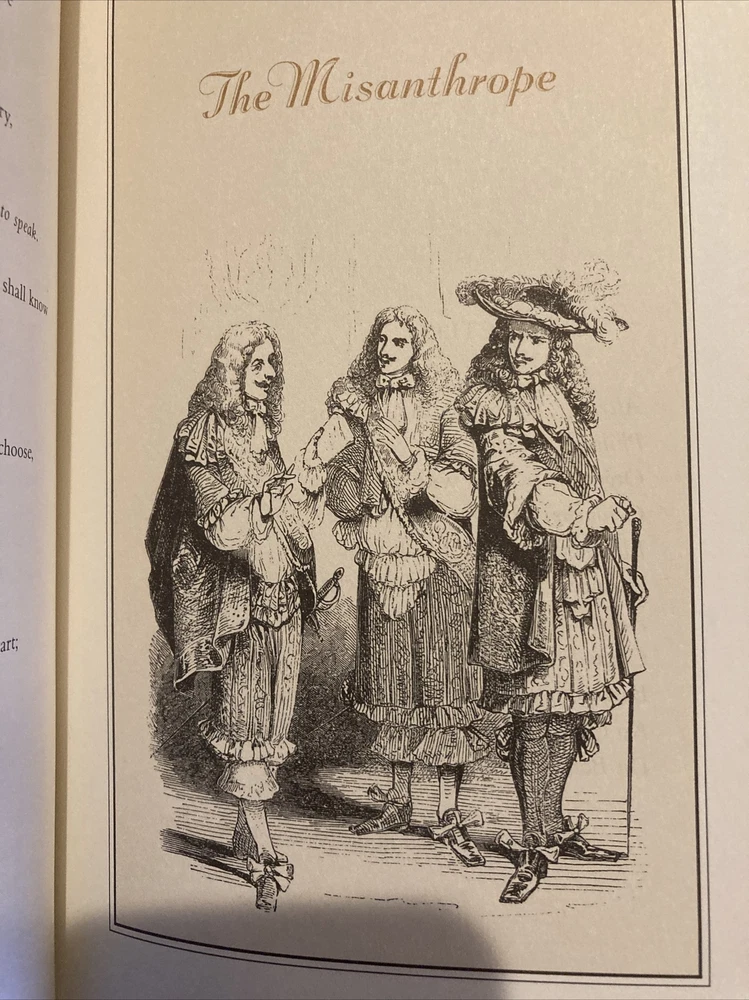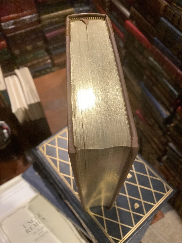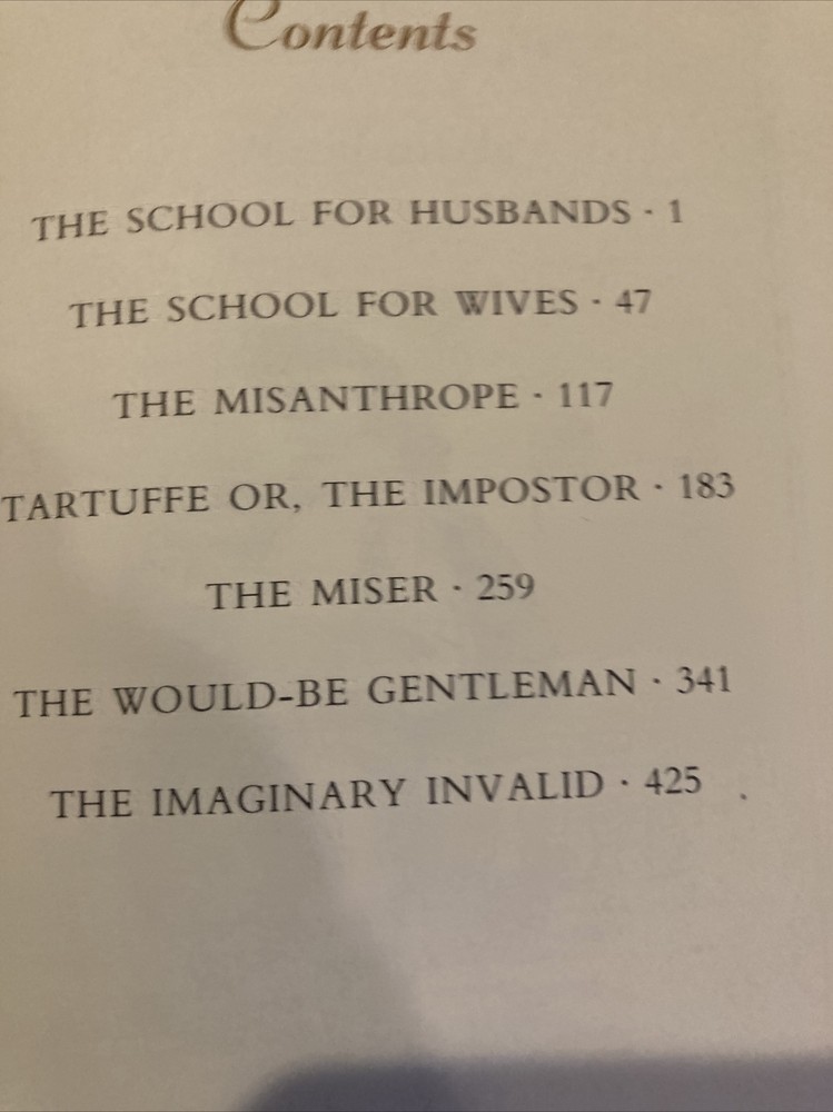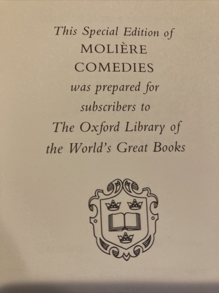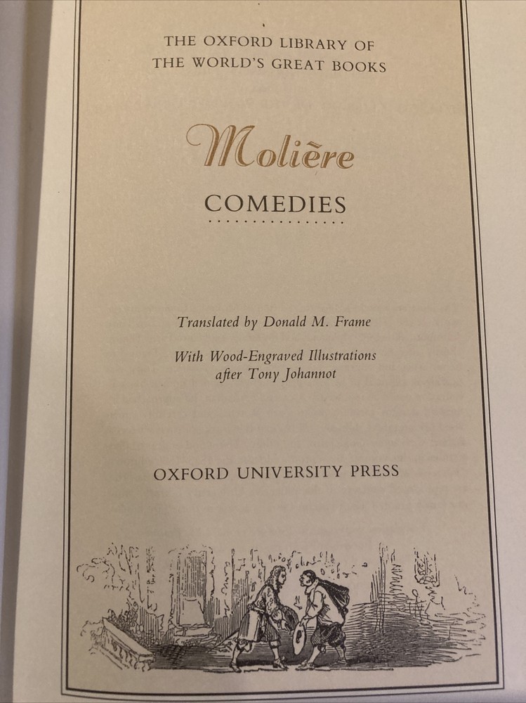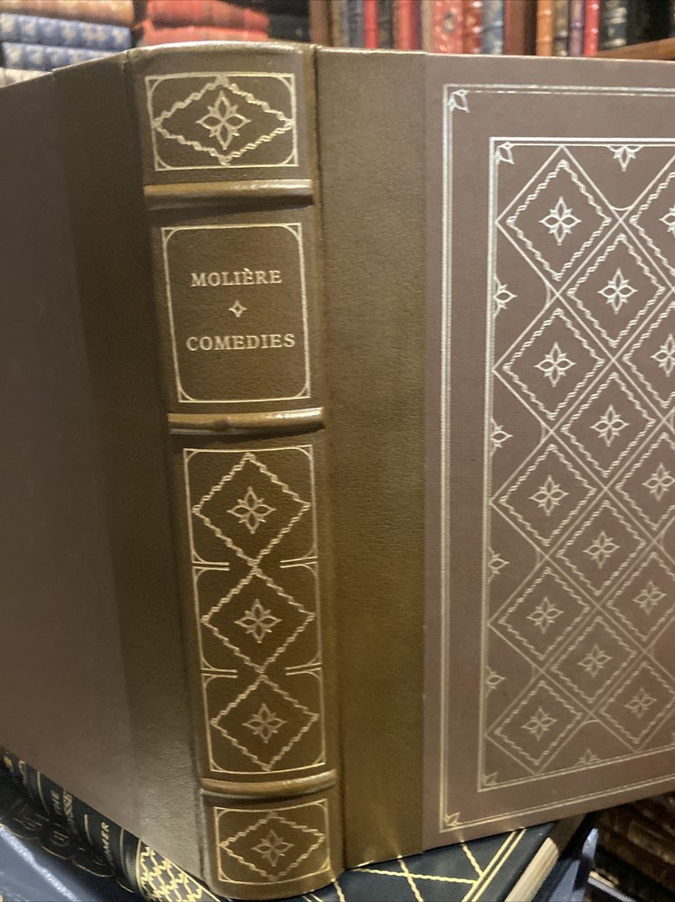 Franklin Library leather spine edition of Moliere's "Comedies," a Limited edition, Translated by Donald M. Frame, Illustrated with Wood-Engraved illustrations after Tony Johannot, one of the OXFORD LIBRARY OF THE WORLD'S GREAT BOOKS series, published in 1985. Bound in brown leather on the spine, the book has marbled paper end leaves, acid-free paper, Symth-sewn binding, a satin book marker, hubbed spine, gold gilding on three edges---in near FINE condition---except for 'tiny' imperfection to top gilt---mentioned for accuracy. Moliere, the named assumed by Jean Baptiste Poquelin, lived from 1622-1673. "Seven Plays" include: "The School for Husbands," "The School for Wives," "The Misanthrope," "Tartuffe Or, the Imposter," "The Miser," "The Would-Be Gentleman," and "The Imaginary Invalid." Moliere introduced ridicule of actual French society, with it various types of folly, oddity, pedantry and vice. "Tartuffe" was the most banned play of the 17th century and the all-time most popular play in France. 503 pages. I offer Combined shipping.