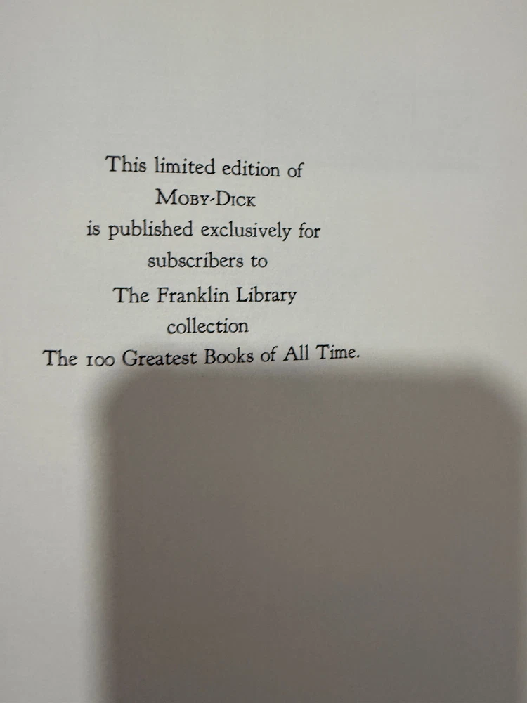 Moby Dick by Herman Melville Franklin Library 100 Greatest Books Series Very Good Plus Condition ! New Books get listed daily !!! 100s of Easton Press and Franklin Library books available!! All books get cleaned with a leather cleaner to remove any dust, odor and restore the beauty of leather!! Combined Shipping Discount: USA buyers - every book $1 off International combined shipping: 1 or 2 books - $45 3 or 4 books - $75 5 + books $17 per book 10+ books $13 per book WE SHIP DAILY!! RETURNS: Hassle-Free 30-days return policy and we pay for a return !! Check our Inventory (Link to eBay Store): http://stores.ebay.com/EastonFranklinBooks
