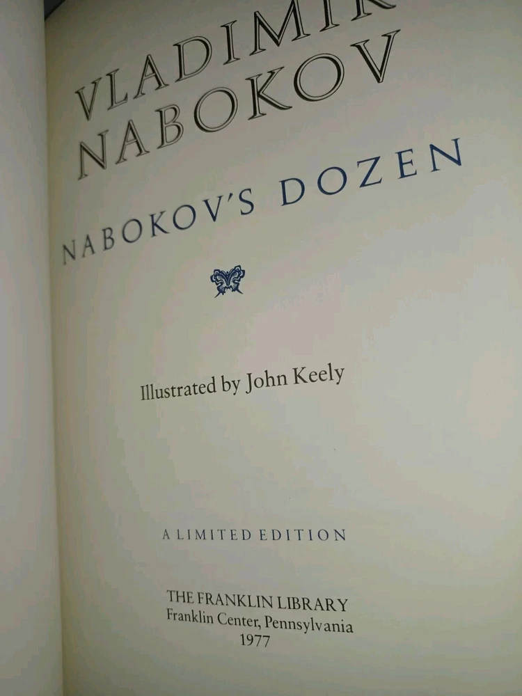 The product is a limited edition book set by Vladimir Nabokov, specifically the "Nabokov Dozen," published by Franklin Library in 1977. The set includes leather-bound books that are new and unread, making them highly collectible for fans of literature and fiction. The books are written in English and are part of a special release by Franklin Library, known for producing high-quality and exclusive editions of classic works. This set would be a valuable addition to any book collector's library.