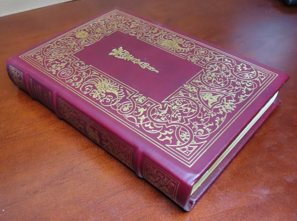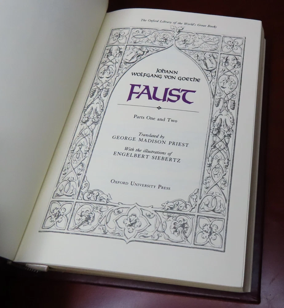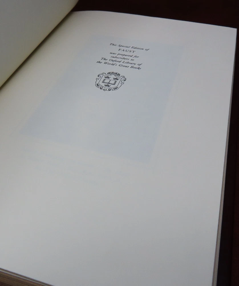 A rare luxury edition of FAUST by Johann Wolfgang von Goethe in near fine condition. Part of the gorgeous and ultra-rare Oxford Library of The World's Great Books collection, this book was printed in 1984 by the Franklin Library and published in conjunction with the Oxford University Press. This full-leather Oxford series was the pinnacle of the Franklin Library's publishing crafts. These books are now difficult to obtain. Features/condition of this specific volume include: No bookplates, ex libris, or any signs of previous owners No bumps or dings to covers/binding. Bottom cover edges show shelf wear. Gold text block gilding is excellent. Some gilding loss on top block. Binding is tight and solid. Please see photos to best assess for yourself the exact condition of the book. Let me know if you have any questions or need further information. Thank you! Your purchase will be carefully wrapped, boxed, and shipped with USPS Media Mail.