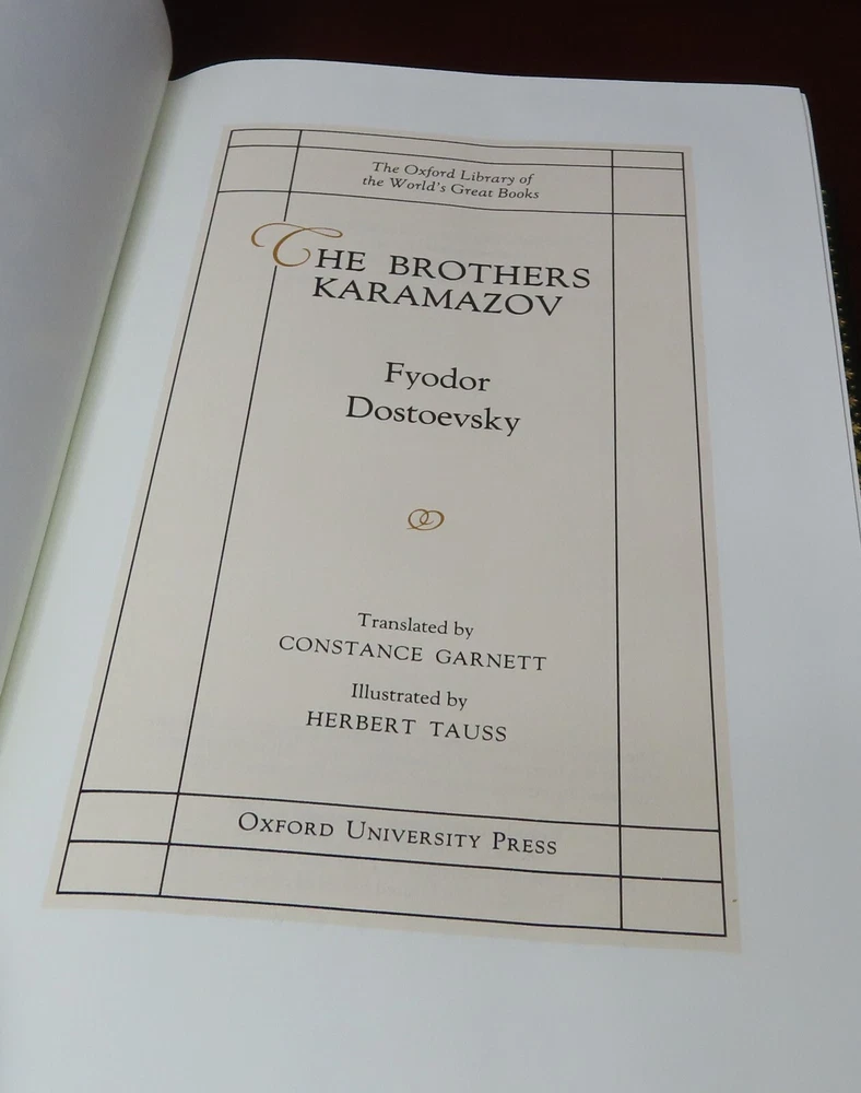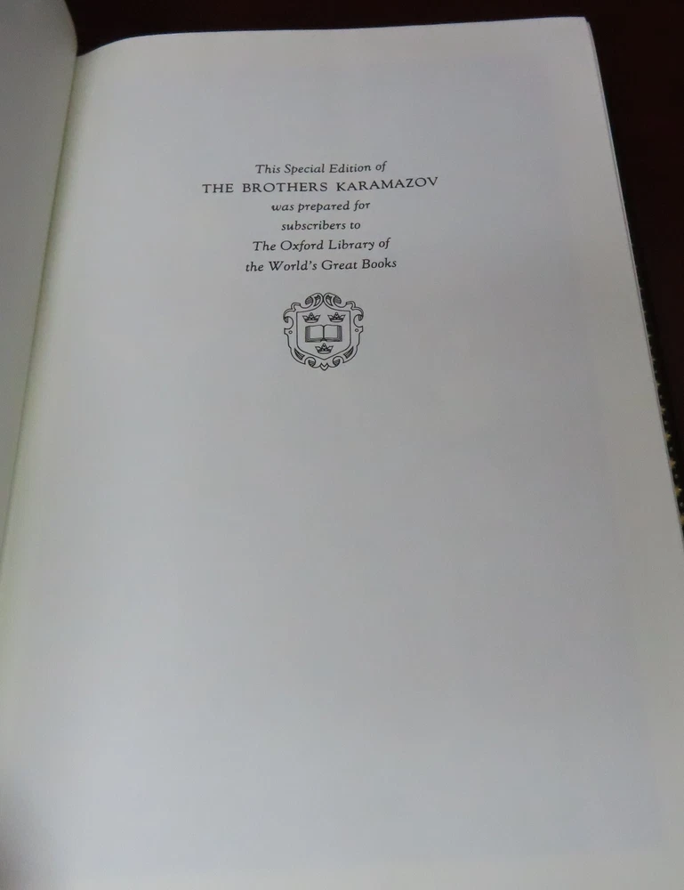 A rare luxury edition of THE BROTHERS KARAMAZOV by Fyodor Dostoevsky in near fine condition. Part of the gorgeous and ultra-rare Oxford Library of The World's Great Books collection, this book was printed in 1984 by the Franklin Library and published in conjunction with the Oxford University Press. This full-leather Oxford series was the pinnacle of the Franklin Library's publishing crafts. These books are now difficult to obtain. Features/condition of this specific volume include: No bookplates, ex libris, or any signs of previous owners No bumps or dings to covers/binding. Bottom cover edge has minor bump. Gold text block gilding is excellent. Binding is tight and solid. Please see photos to best assess for yourself the exact condition of the book. Let me know if you have any questions or need further information. Thank you! Your purchase will be carefully wrapped, boxed, and shipped with USPS Media Mail.