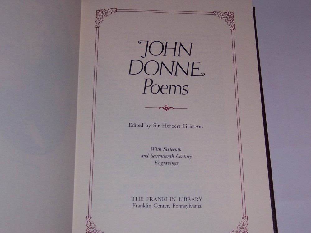 Books from Franklin Library Bound in premium leathers, distinctive cover design, hubbed spine accented in 22-karat gold Endsheets of rich marble paper, permanent satin ribbon page marker Thread sewn pages for strength and durability, gilded page edges for beauty and protection Handsome readable typefaces, beautiful illustrations, archival-quality acid-neutral paper TITLE POEMS AUTHOR John Donne MORE DETAILS A Limited Edition Edited by Sir Herbert Grierson, with sixteenth and seventeenth century engravings DESCRIPTION Like new condition, unread, clean inside, tight hardcover binding SHIPPING Books will be packed safely, and shipped via USPS Media Mail with tracking number.