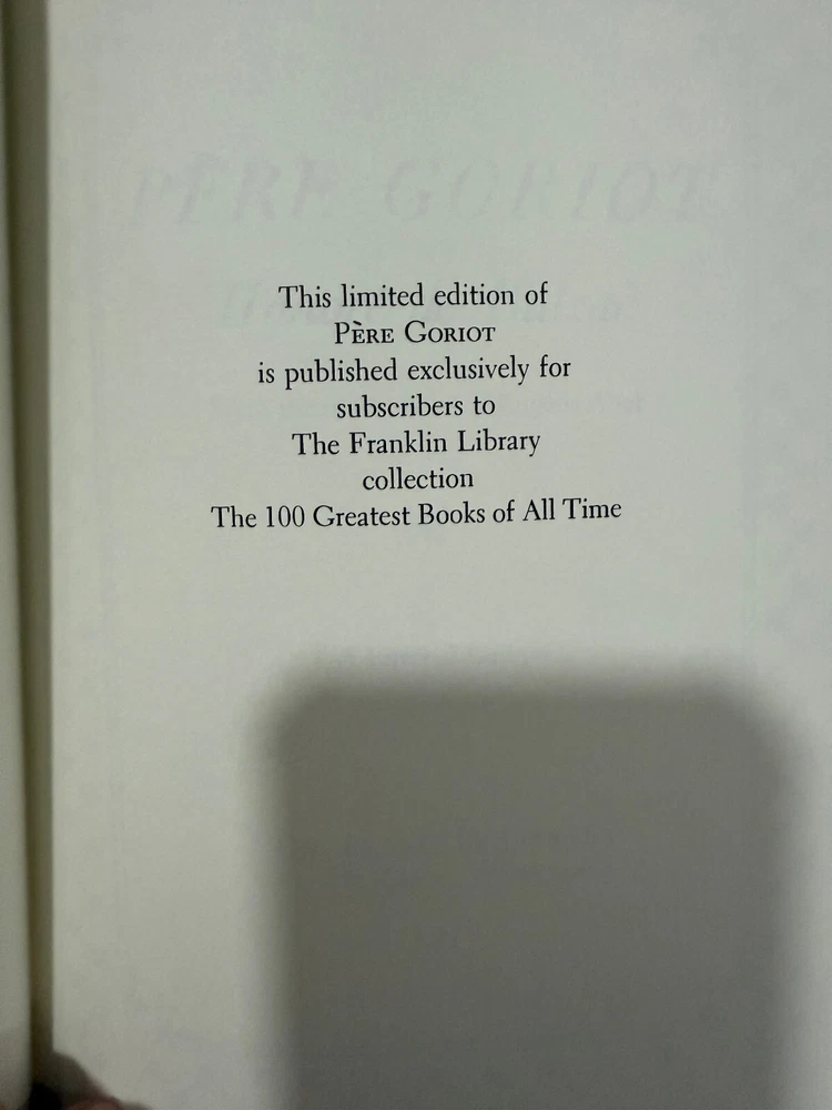 Pere Goriot - Honore De Balzac Franklin Library 100 Greatest Books Series Very Good Plus Condition ! New Books get listed daily !!! 100s of Easton Press and Franklin Library books available!! All books get cleaned with a leather cleaner to remove any dust, odor and restore the beauty of leather!! Combined Shipping Discount: USA buyers - every book $1 off International combined shipping: 1 or 2 books - $45 3 or 4 books - $75 5 + books $17 per book 10+ books $13 per book WE SHIP DAILY!! RETURNS: Hassle-Free 30-days return policy and we pay for a return !! Check our Inventory (Link to eBay Store): http://stores.ebay.com/EastonFranklinBooks