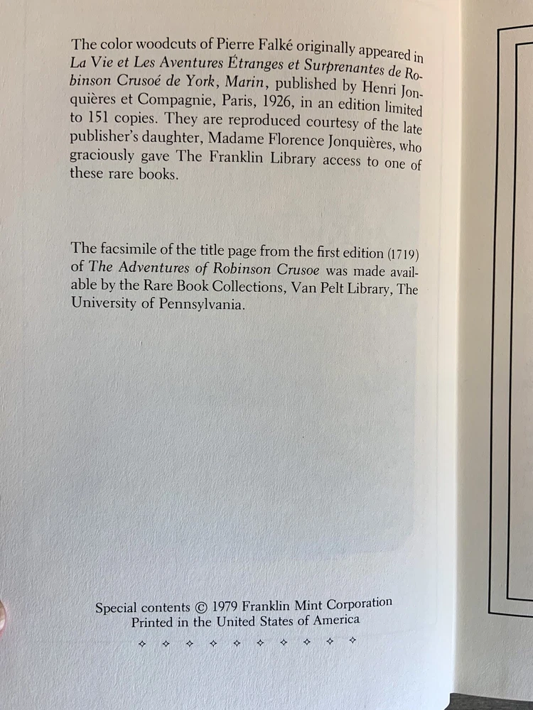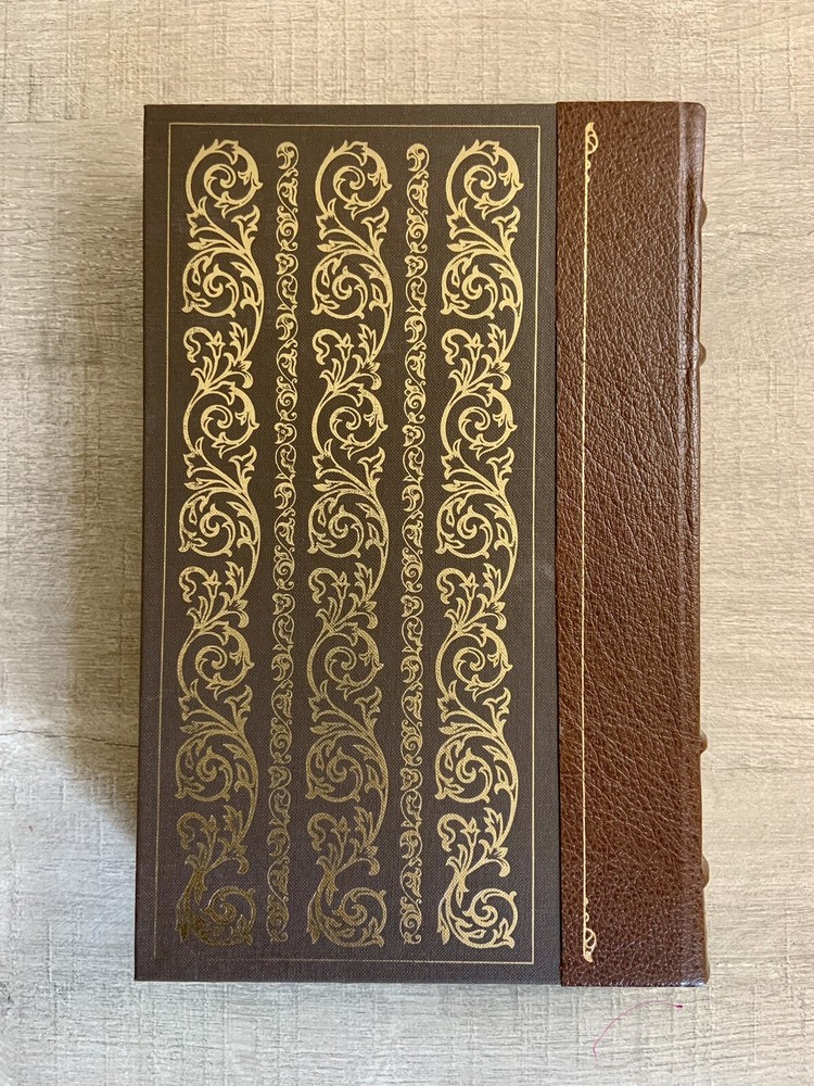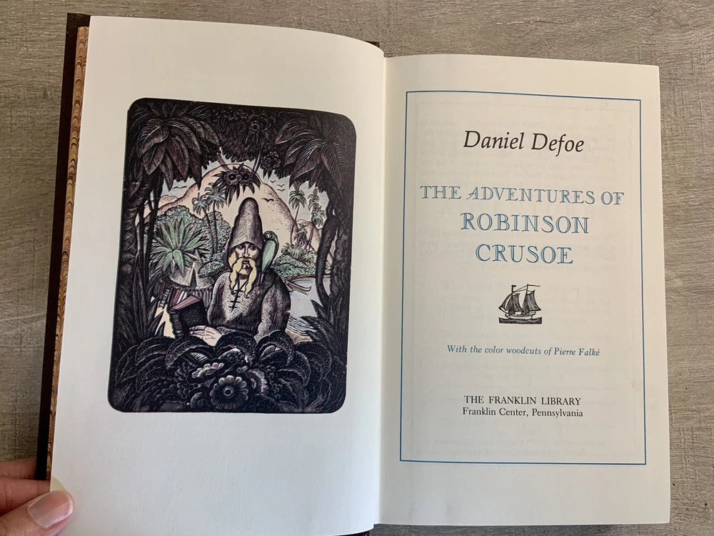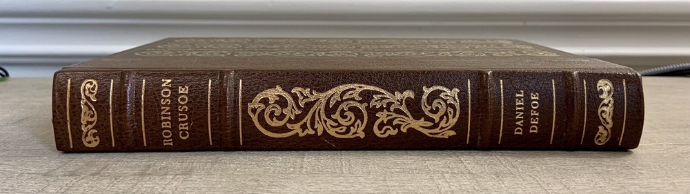 Franklin Library Robinson Crusoe- Daniel Defoe-Heirloom Series 1/4 Leather 1979 is a beautiful hardcover in very good condition with tight binding, clean pages, and minimal shelf wear. Part of a 50 book limited edition published by the Franklin Library in The Heirloom Library of the World's Greatest Books. This series was published as quarter bound leather editions only. There is an Heirloom Book Plate on the inside front cover with the previous owner's name on it (Photo). Otherwise, I see no damage. Books features: quarter bound in fine genuine leather with 22 karat gold decorations all page edges gilded with 22 karat gold raised spine hubs sewn-in satin ribbon bookmarks high-quality paper decorative paper endpapers sewn pages for strength and durability ~~ Please look at all photos as they are the best depiction of the item~~ ~This item has always been in a non smoking, pet free home. ~Packed with care and shipped to prevent damage within 24 hrs. of payment with USPS Media Mail. Thank you for looking!!