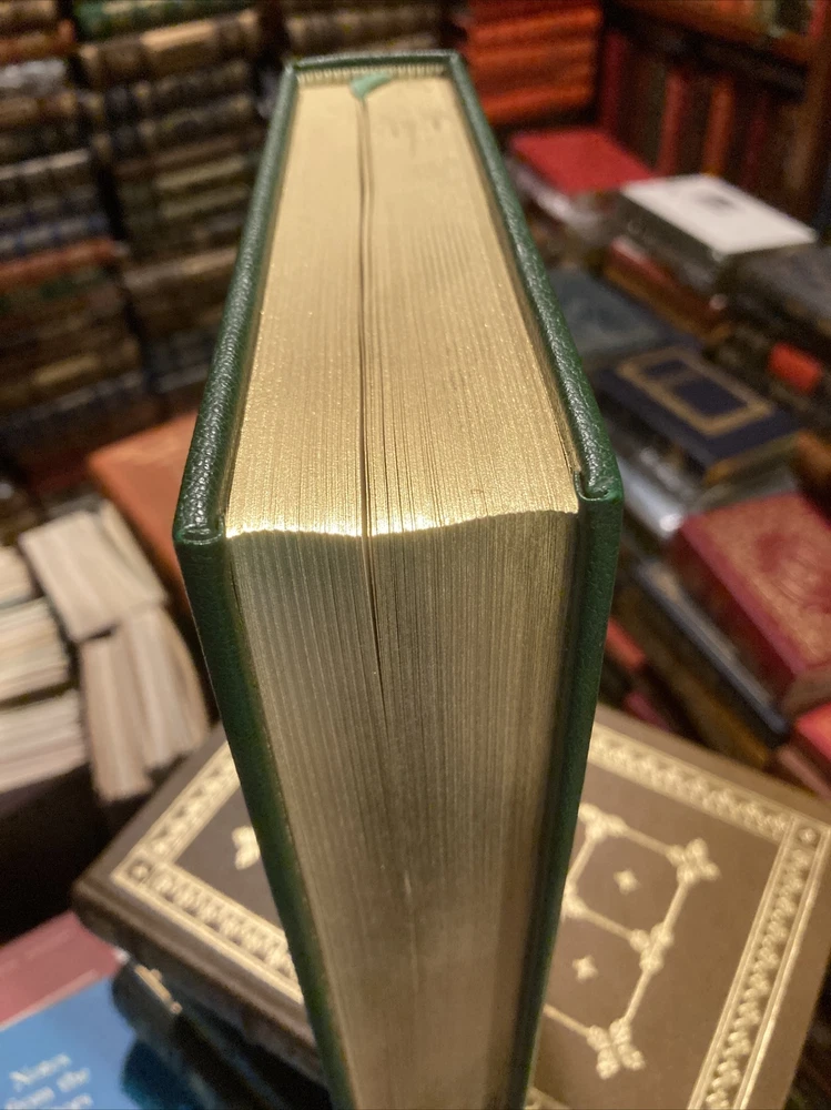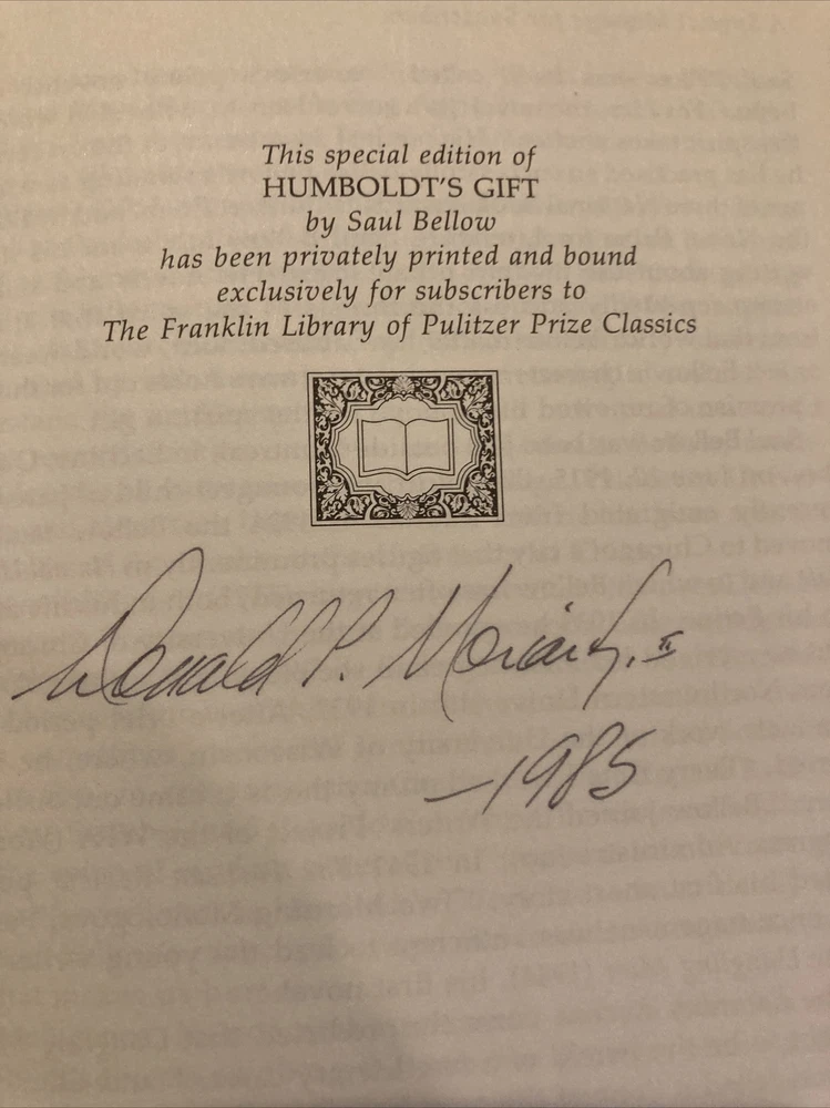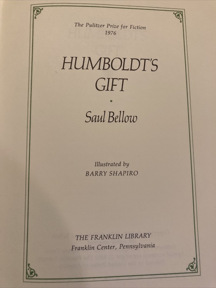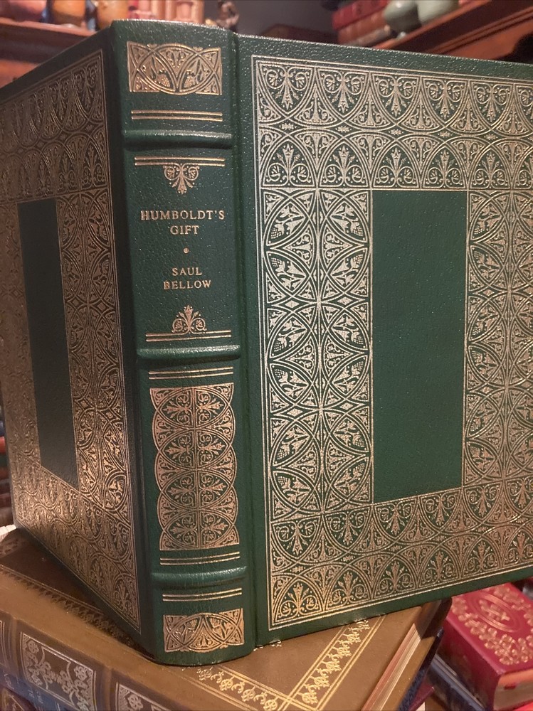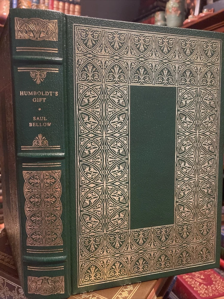 Franklin Library leather edition of Saul Bellow's "Humboldt's Gift," a Limited edition, Illustrated by Alam Daniel, one of the PULITZER PRIZE CLASSICS series, published in 1983. Bound in pea green leather, the book has marbled paper end leaves, acid-free paper, Symth-sewn binding, hubbed spine, satin book marker, gold gilding on three edges---in near FINE condition---except for previous owner's name and date written on third page. Saul Bellow, who lived from 1915-2005, was an American novelist and one of the best known American Jewish authors of the 20th century. Bellow was born in Quebec of parents who had come from Russia two years earlier. His family moved to Chicago when he was eleven; his early childhood had been spent in a Montreal slum. He was raised in a Jewish home, and the fluent Yiddish he learned there had a noticeable influence on his English style. After graduating from Northwestern University he taught at various colleges and universities, but his real vocation was writing. "Humboldt's Gift" is not basically a Jewish novel even though its protagonist, CHARLIE CITRINE, is a Jewish author from Chicago. Instead, the book deals with Charlie's attempts to cope with a life style and a career that are turning sour. Bellow is the only author to win the National Book Award three times. He also was awarded both the PULITZER and NOBEL PRIZES in 1976. 462 pages. I offer Combined shipping.