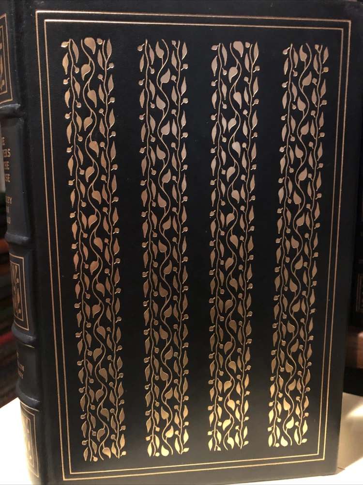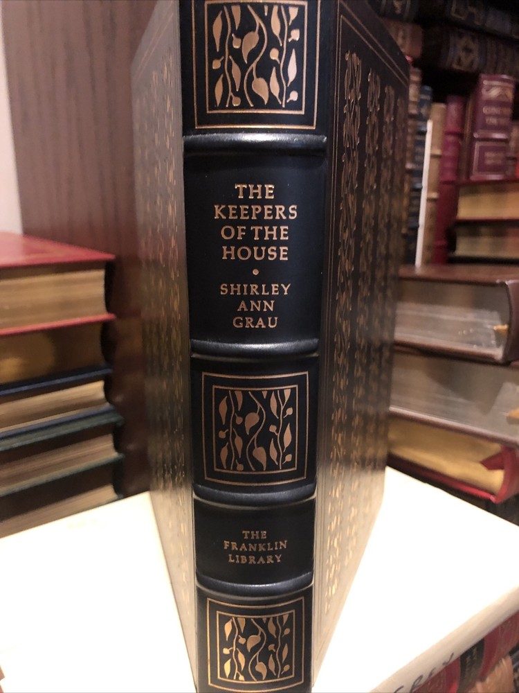 Franklin Library leather edition of Shirley Ann Grau's "The Keepers of the House," a Limited edition, Illustrated by Muriel Wood, one of the PULITZER PRIZE series, published in 1977. Bound in hunter green leather, the book has gold French moire silk end leaves, acid-free paper, Symth-sewn binding, a satin book marker, hubbed spine, gold gilding on three edges---in FINE condition. Shirley Ann Grau, who lived from 1929---2020, was an American writer who was born in NEW ORLEANS and educated at NEWCOMB COLLEGE, the women's coordinate college of Tulane University. Her stories usually explore issues of race and gender. "The Keepers of the House" is about the descendants of a Southern Plantation owner and his two wives, one white, the other black. 327 pages. Combined shipping is available