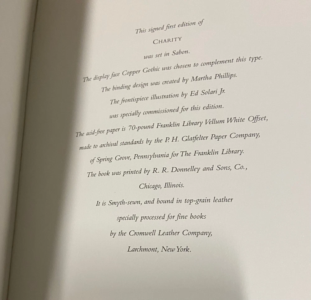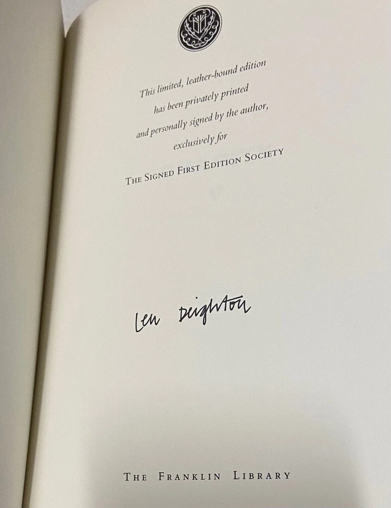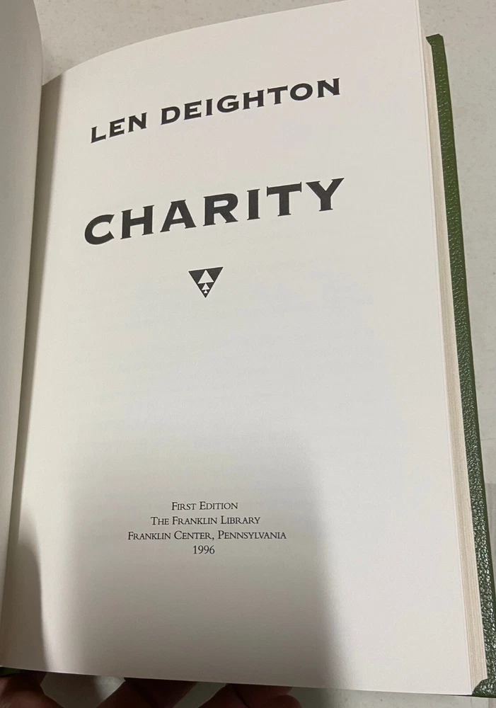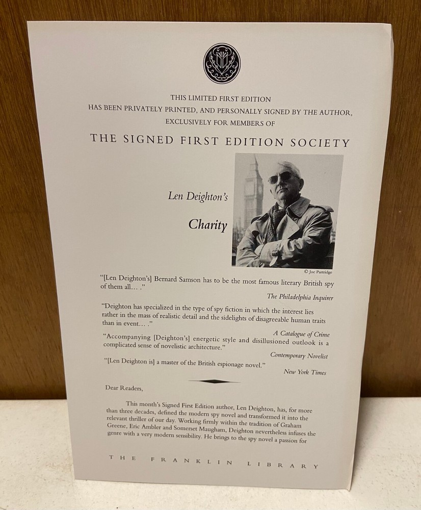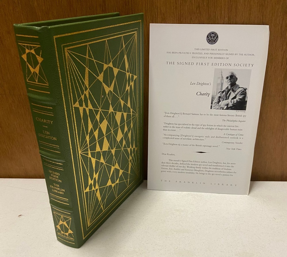 Franklin Library: SIGNED 1st Charity by Len Deighton Leatherbound This Len Deighton 1st Edition Franklin Library book features the following: Will be shipped inside box. Fully bound genuine leather. 22kt gold deeply inlaid on the "hubbed" spine. Superbly printed on acid-neutral paper that lasts for generations. Sewn pages. Satin-ribbon page marker. Gilded page ends.