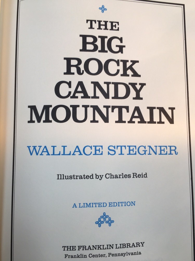 Franklin Library leather edition of Wallace Stegner's "The Big Rock Candy Mountain," Illustrated by Charles Reid, a Limited edition, one of the SIGNED 60 series, PERSONALLY SIGNED by WALLACE STEGNER, signature protected by tissue paper, published in 1978. Bound in camel tan leather, the book has bright orange moire silk end leaves, acid-free paper, Symth-sewn binding, hubbed spine, satin book marker, gold gilding on three edges---in near FINE condition. Wallace Stegner, who lived from 1909-1993, was born in IOWA. Stegner was the founder and a distinguished Creative Writing professor at Stanford University in California. The semi-autobiographical, "The Big Rock Candy Mountain," follows the life of the Mason family---Bo and Elsa with their sons Chester and Bruce--during the early 20th Century in the United States and Canada. The novel spans a wide variety of settings. The book is structured in ten sections. The fictional family, like Stegner's family during his childhood, frequently moves to different cities in pursuit of various financial schemes that never work out. The novel also matches Stegner's family history in some of the specific locations lived, including Saskatchewan and Salt Lake City. The novel is named after the folk song "Big Rock Candy Mountain," a mythical paradise. 733 pages. Combined shipping is available.
