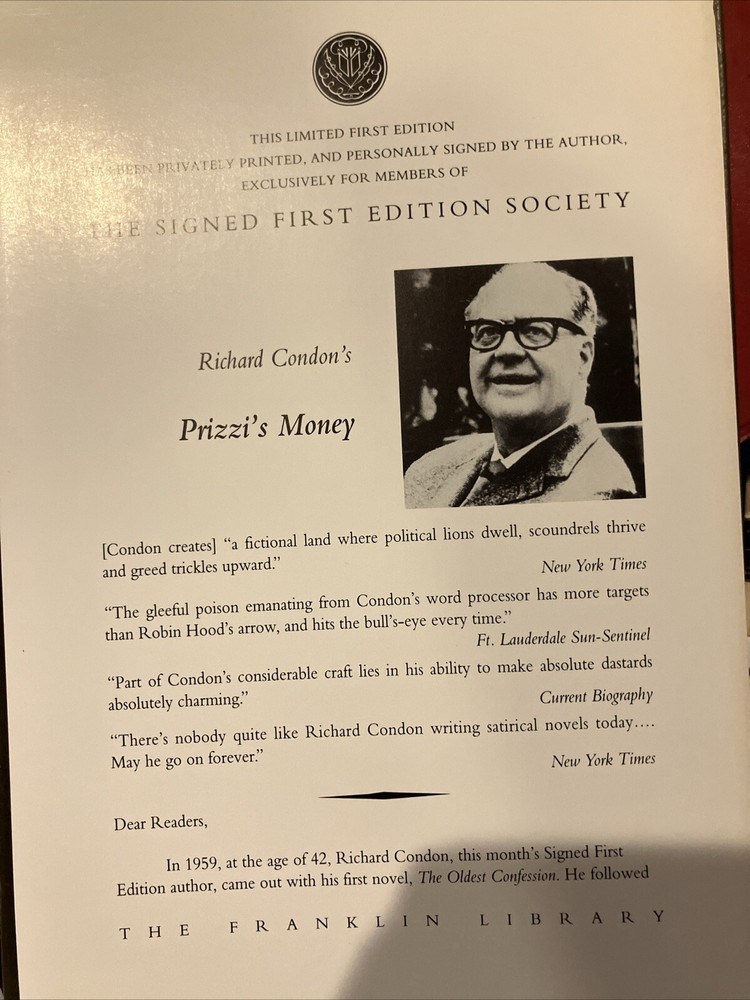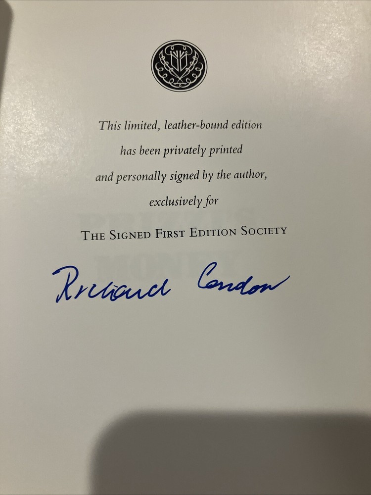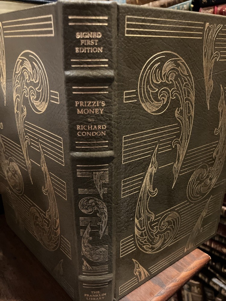 Franklin Library leather edition of Richard Condon's "Prizzi's Money," a Limited edition, one of the SIGNED First Edition series, Personally signed by RICHARD CONDON, Frontispiece by Gary Kelley, published in 1994. Bound in hunter green Smyth-sewn leather, the book has marbled end leaves, acid-free paper, hubbed spine, satin book marker, gold gilding on three edge--in FINE condition. COLLECTOR'S Notes is included. Richard Condon, who lived from 1915-1996, wrote satires. The novel begins with the kidnapping of HENRY GEORGE ASBURY, "an advisor to Presidents," a vastly wealthy conglomerateur, a direct descendant of the first Methodist bishop in the U.S., an art patron, and a philanthropist who has been in the Prizzi's pocket since his beginnings. But he has a wife who must be reckoned with so the Prizzis face a struggle. He once said that every book he had written was about the abuse of power. The New York Times said: "Condon creates a fictional land where political lions dwell, scoundrels thrive and greed trickles upward." The Ft. Lauderdale Sun-Sentinel wrote: "The gleeful poison emanating from Condon's word processor has more targets than Robin Hood's arrows and hits the bull's eye every time." The New York Times wrote: "There's nobody quite like Richard Condon writing satirical novels today. . .May he go on forever." 241 pages. I offer Combined shipping.