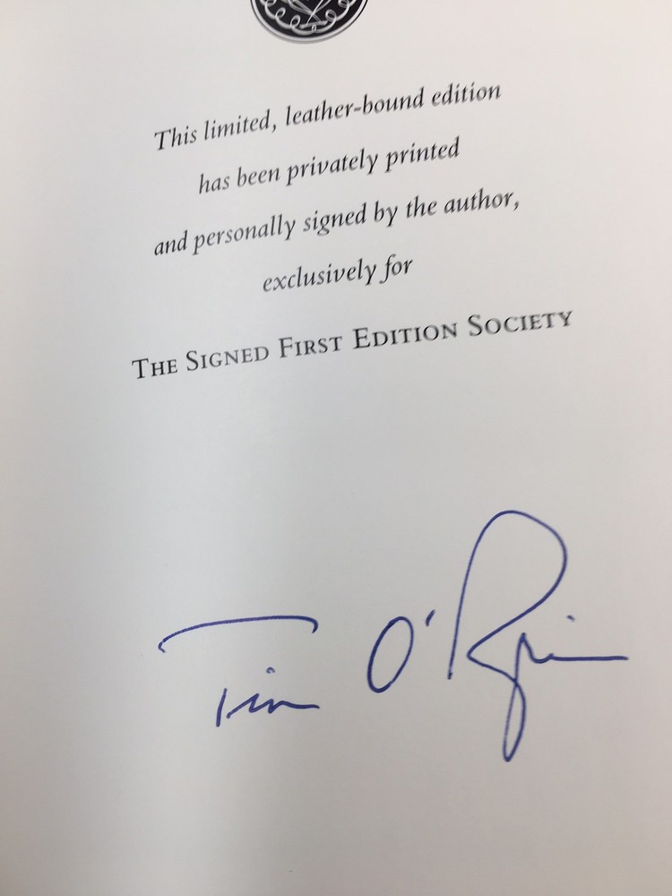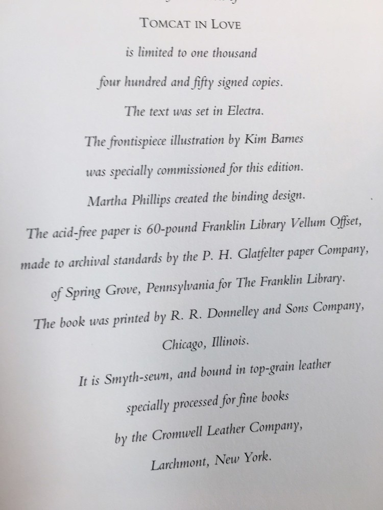 Franklin library leather edition of Tim O'Brien's "Tomcat in Love," a First edition, Frontispiece by Kim Barnes, PERSONALLY SIGNED by TIM O'BRIEN, one of the SIGNED FIRST EDITION SOCIETY series, published in 1998. Bound in pea green leather, the book has decorative paper end leaves, acid-free paper, Symth-sewn binding, a satin book marker, gold gilding on three edges---in FINE condition---SHRINK WRAPPED. William Timothy "Tim" O'Brien, who born in1946, is an American novelist and the author of interrelated short stories inspired by his experiences in the Vietnam War. O'Brien, who was born in Minnesota, earned his BA in Political Science from Macalester College in 1968 and that same year was drafted into the U.S. Army and sent to Vietnam where he served from 1969-70. After the service, he attended HARVARD. "Tomcat in Love" is partly about his irrational reaction to the end of his marriage. Thomas Chippering returns to his (fictitious) home town, Owago, Minnesota. Emotionally spent, he trespasses on the backyard of the house where he grew up. The current resident, Mrs. Robert (Donna) Kooshof, finds him but is surprisingly attracted to him. Donna rashly agrees to participate in Tom's madcap scheme of revenge against his ex-wife, Lorna Sue, her brother, Herbie, and her new husband, known only as "the tycoon." Tom, Lorna Sue and Herbie have been close friends — or at least companions — since childhood. The proximate cause of Lorna Sue leaving Tom was that Herbie revealed to her that Tom has been keeping a lifelong record of his infatuations and dalliances. While planning his revenge, Tom also maintains his position as a faculty member at the University of Minnesota. As in years past, Tom eagerly assists his female students with their writing projects, but at this point, one of these students decides to accuse Tom of sexual harassment. Tom loses his job and returns to Owago to live with Donna. Tom finds a job as an instructor at the Owago Community Day Care Center and starts teaching Shakespeare to four-year-olds. Tom's revenge involves trying to break up Lorna Sue's new marriage by innuendo. When this goes awry, Tom plans to burn down the Zylstra's house in Owago. Tom gathers mason jars, gasoline and firecrackers to this end. But the resolution to the plot occurs when Lorna Sue steals Tom's bombs and threatens burn down her own house. Tom is able to get over his dependence on Lorna Sue. At the end, Tom and Donna move to a Caribbean island and live comfortably together. Tom's flirtatious nature, while not reformed, is kept in check. O'Brien has held an endowed chair at the Texas State University where he has taught every other year since 2004. In June 2013, he was awarded the $100,000 Pritzker Military Library Literature Award. I offer Combined shipping.