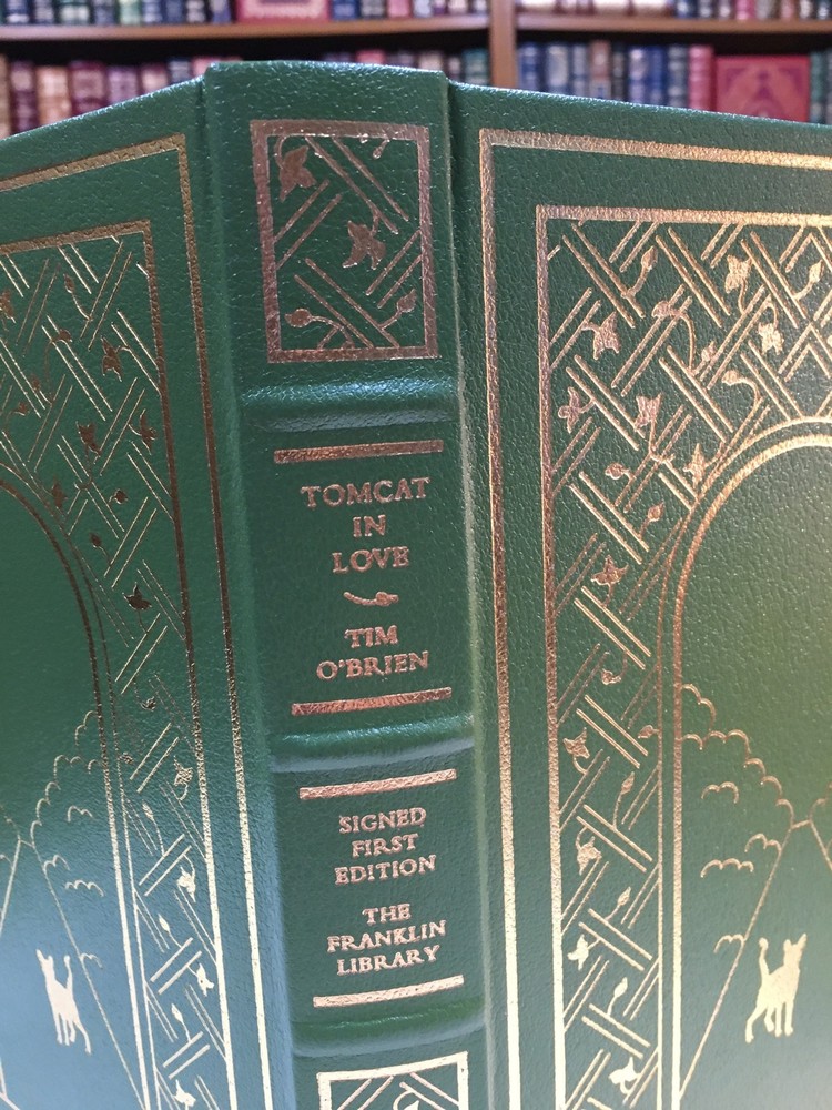 This stunning Franklin Library edition of Tim O'Brien's *Tomcat in Love* is a true collector's gem! The pea-green leather binding, gold gilding, and Smyth-sewn craftsmanship feel luxurious. A rare signed first edition, shrink-wrapped and in flawless condition—perfect for any literary enthusiast. Tim O'Brien's signature adds incredible value to this already exquisite Vietnam-era novel. A must-have for fans and collectors!