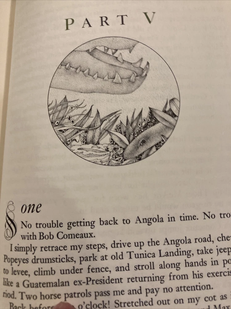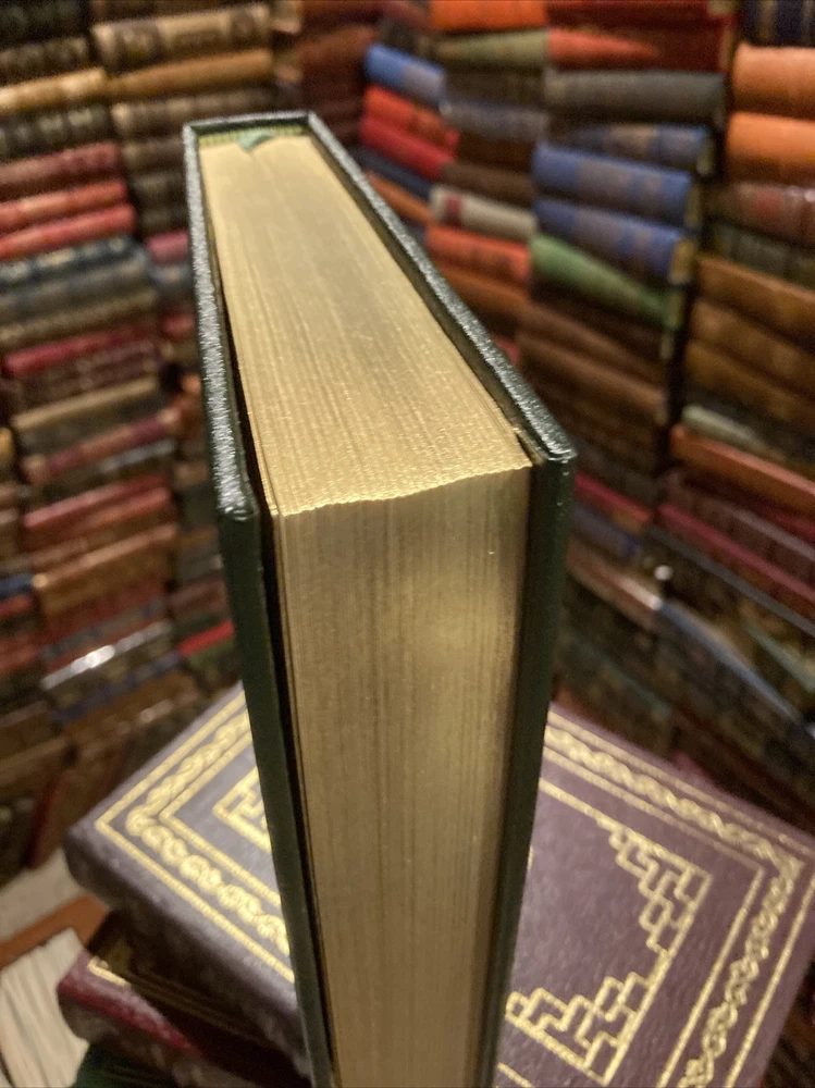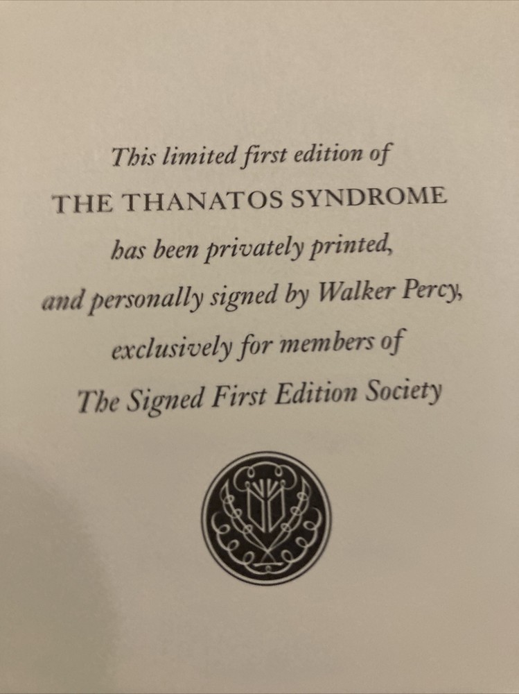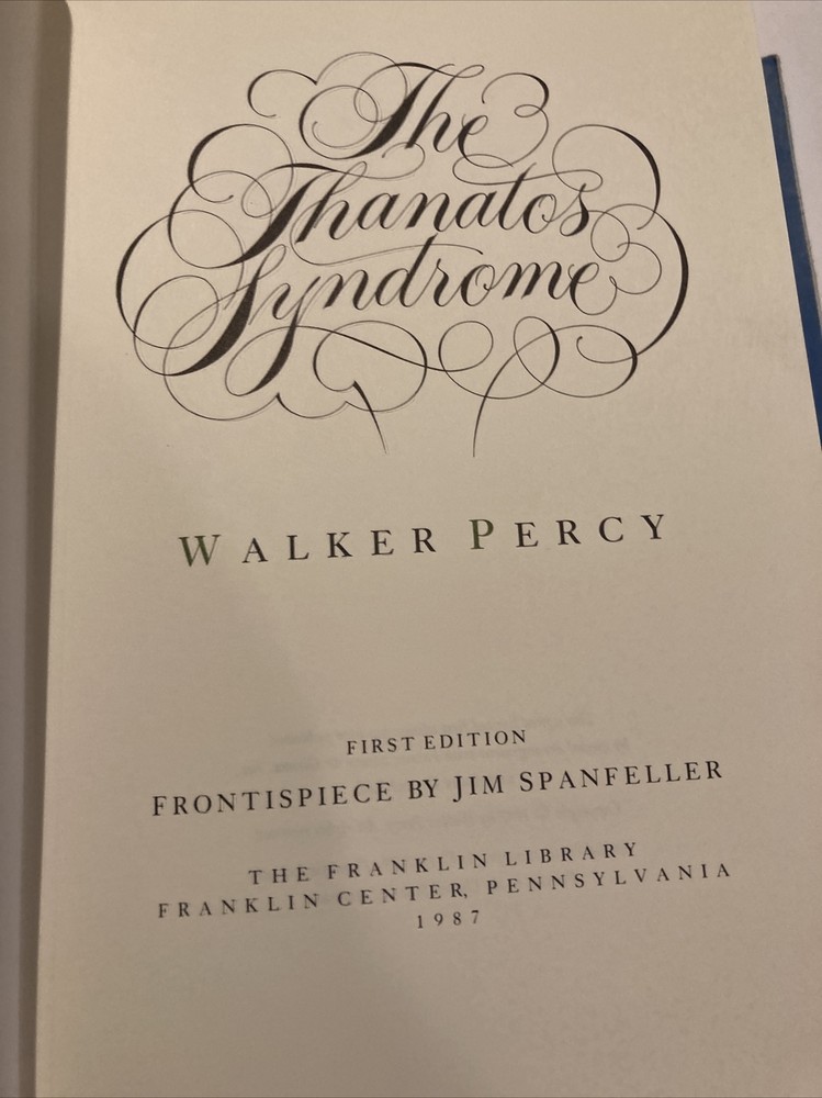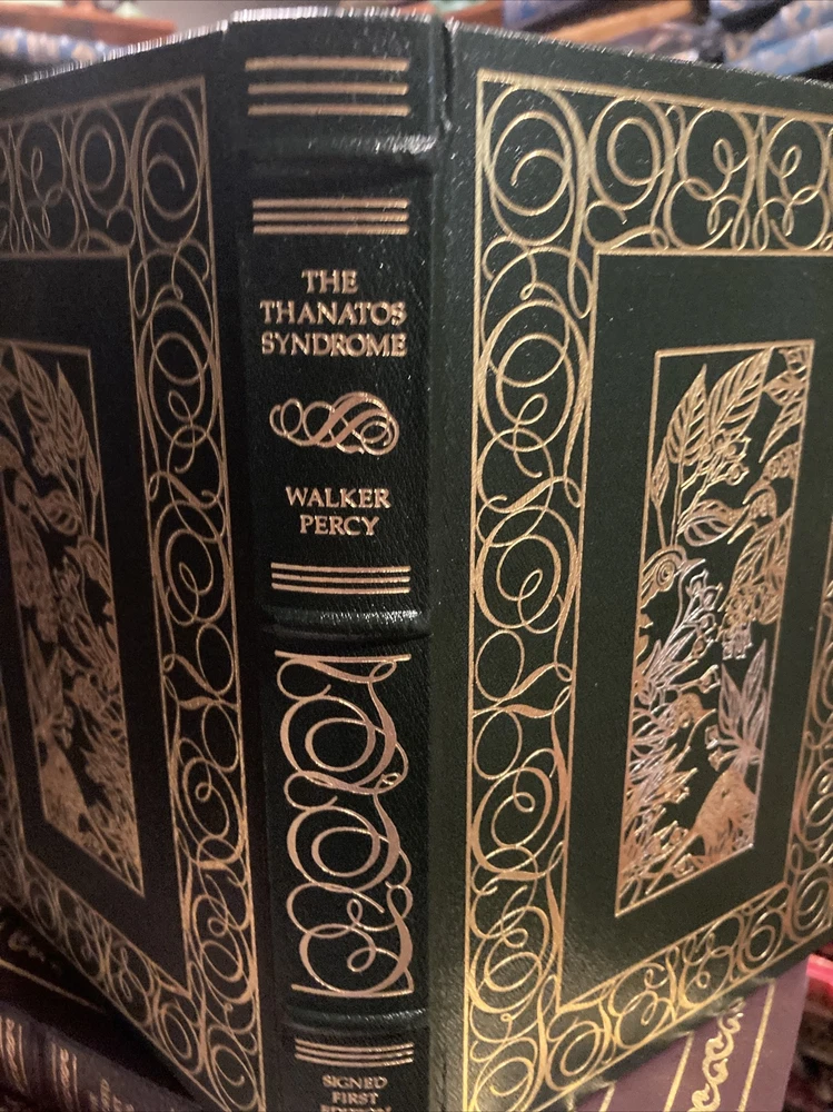Franklin library leather edition of Walker Percy's "The Thanatos Syndrome," a Limited edition, Frontispiece by Jim Spanfeller, one of the SIGNED FIRST EDITION series, PERSONALLY SIGNED by Walker Percy, published in 1987. Bound in hunter green leather, the book has marbled paper end leaves, acid-free paper, hubbed spine, satin book marker, gold gilt on three edges---in near FINE condition. Walker Percy, who lived from 1916-1990, was born in Birmingham, Alabama. After his father's suicide when Walker was 13, and his mother's accidental death two years later, he and his brothers were reared by Will Percy, a bachelor cousin and the author of "Lanterns on the Levee." Percy attended Greenville, Mississippi, High School where his best friend was SHELBY FOOTE, later a noted Civil War historian. They both attended the University of North Carolina---Chapel Hill. In 1941, Percy graduated from medical school at COLUMBIA but became a writer after catching tuberculosis. "The Thanatos Syndrome was Percy's last novel and is a sequel to "Love in the Ruins." Set in the near future in Feliciana, the novel tells the story of an imprisoned psychiatrist, TOM MORE, who is freed and returns to his town with the active members demonstrating new mysterious behaviors. He suspects that something or someone is making everyone in his town crazy and reversing them to be like primitive apes. Tom is a lapsed Catholic, and when he comes home, his practice and marriage are in near collapse. Tom teams up with his cousin, LUCY, an epidemiologist, and they discover that the authorities, a consortium of scientists, have been running secret trials on the population of the town by "poisoning" the water supply. This has affected the citizens memory and their sexual appetite. Tom has hit rock bottom and involves a Catholic priest, Father Smith, in hope of relief. Dr. Tom is a "far cry from the saint," drinks too much, and watches reruns on MASH, but he cares. Father Smith, the priest, is equally fallible. Percy may be suggesting that Western medicine cannot cure the ills of its citizens. 372 pages. I offer combines shipping.
