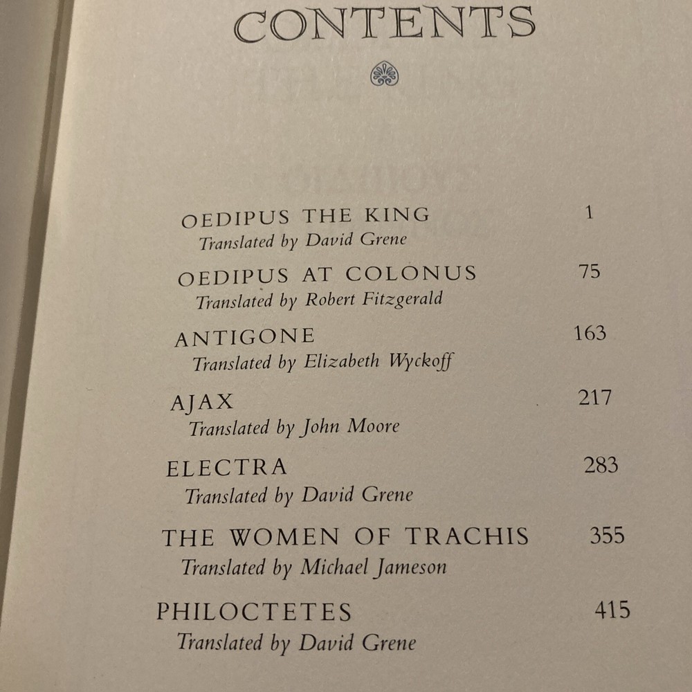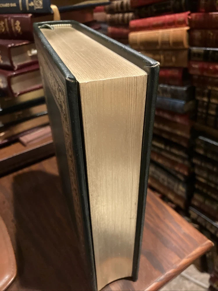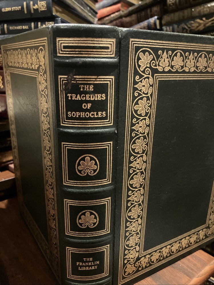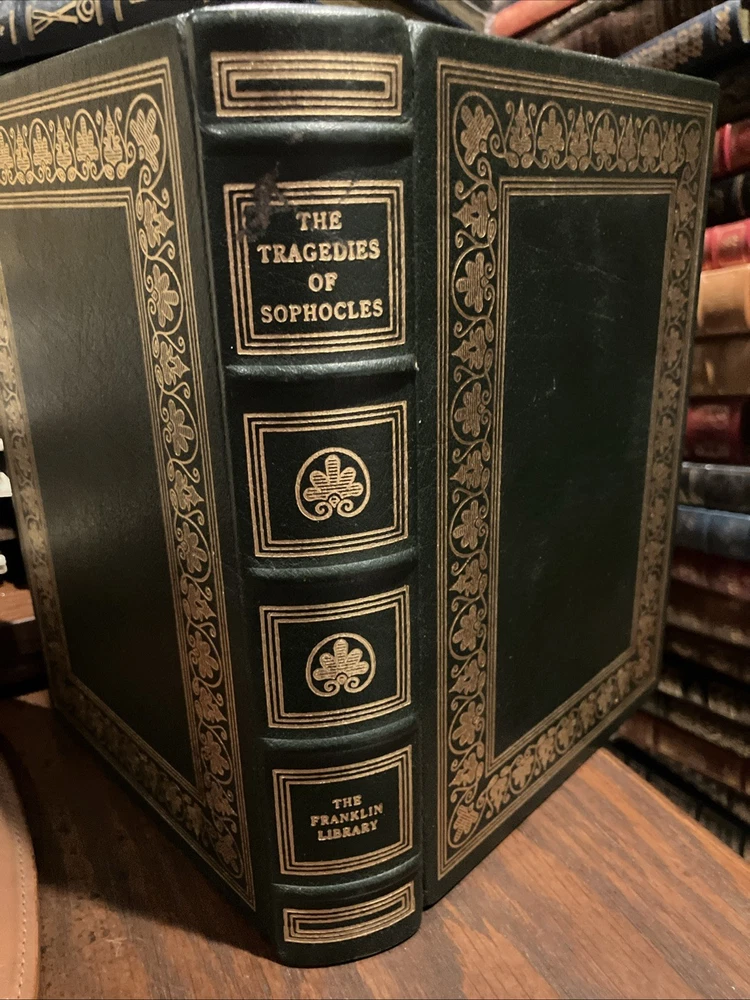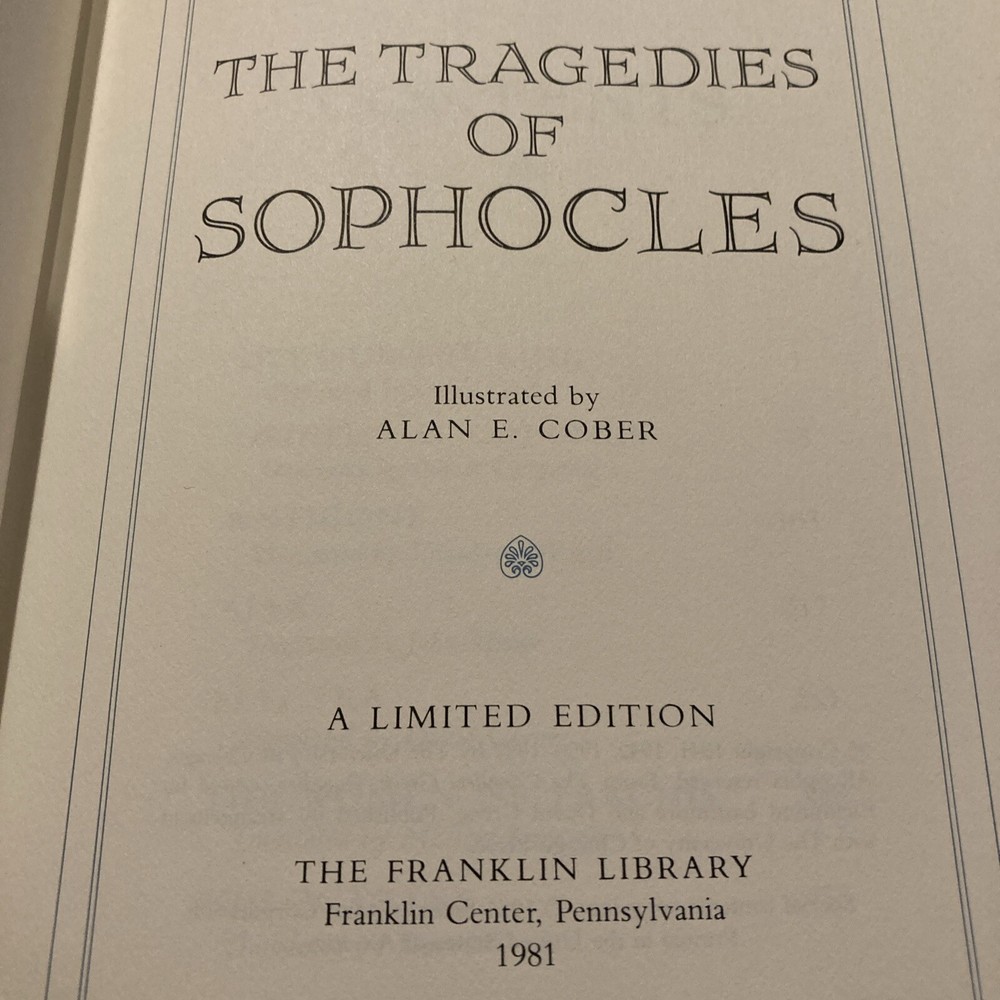 Franklin Library leather edition of "The Tragedies of Sophocles," a Limited edition, Illustrated by Alan E. Cober, one of the 100 GREATEST BOOKS OF ALL TIME series, published in 1981. Bound in deep hunter green leather, the book has hunter green moire silk end leaves, satin book marker, acid-free paper, Symth-sewn binding, hubbed spine, gold gilding on three edges---in near FINE condition---except for 'minor rub' on spine. Sophocles, who lived from 496 – 406 BC, was a tragedian of classical Athens. His tragedies are more human, less heroic than those of Aeschylus. HIs first victory as a tragic poet was in 468 B.C. when he won the prize against Aeschylus. This volume includes: 'Oedipus the King," "Oedipus at Colonus," "Antigone," "Ajax," "Electra," "The Women of Trachis," and "Philoctetes." 484 pages. I offer Combined shipping.