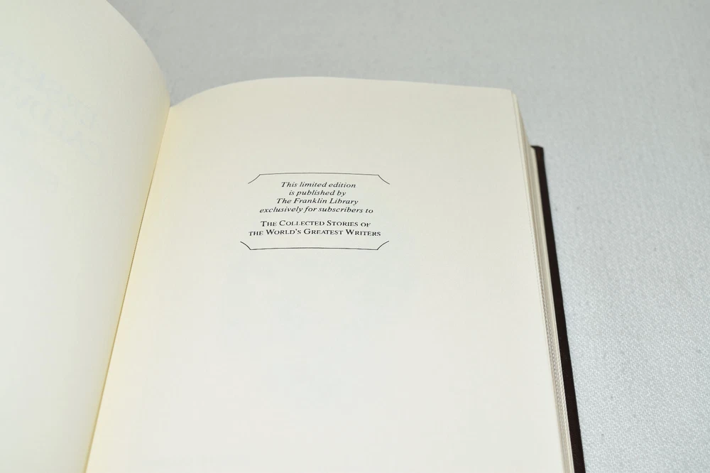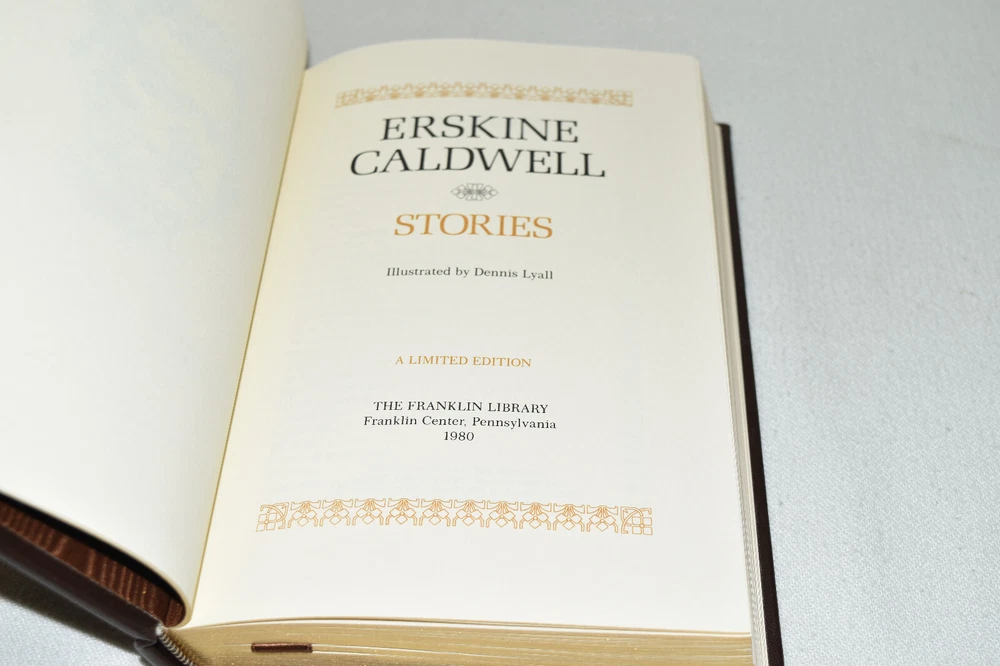 From the Franklin Library World's Greatest Writers Collection... Stories by Erskine Caldwell Illustrated by Dennis Lyall Copyright 1980 by The Franklin Library Premium Full Leather Binding This volume contains all of these classic Franklin Library trimmings: Premium Leather Binding Silk Moire Endleaves Distinctive Cover Design Hubbed Spine, Accented in Gold Satin Ribbon Page Marker Gilded Page Edges Long-lasting, High Quality Acid-neutral Paper Beautiful Illustrations A very scarce title in any condition, this 1980 edition is in Fine condition. The front and back covers are in terrific condition and the gilded page edges show hardly any wear (see pictures of all sides). There are no markings, bookplates, or other signs of prior ownership in this book. This World's Greatest Writers Edition was published by The Franklin Library and would be a beautiful addition to your Franklin Library book collection. Overall, this copy is a grade collector's book. This book is very elusive in this superior condition, as only a limited number of them were ever published, so now is the time to act. Hopefully you can add this book to your collection and enjoy it in the years to come... Please Email Me With Any Questions You Might Have! Shipping Info: Buyer to Pay Shipping and Handling International Bidders Pay Extra Shipping Seller Not Responsible For Uninsured Items Lost or Damaged in Mail Forms of Payment Accepted: Paypal Good luck and happy bidding! Powered by eBay Turbo Lister The free listing tool. List your items fast and easy and manage your active items.