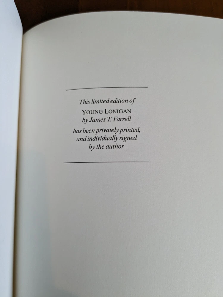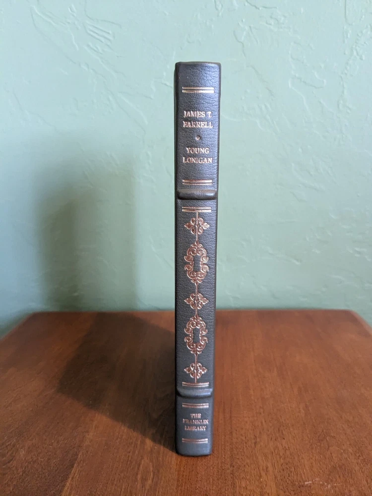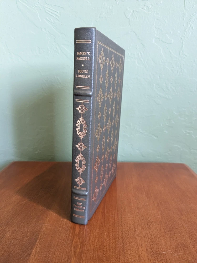 Young Lonigan by James T. Farrell for Franklin Library's Signed 60 collection. Beautifully hand signed by author. Full leather bound with gold gilt page ends, silk moire end pages and silk marker ribbon. Book is in excellent condition. See pictures for details.