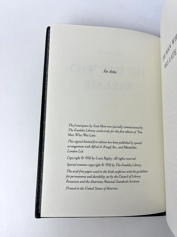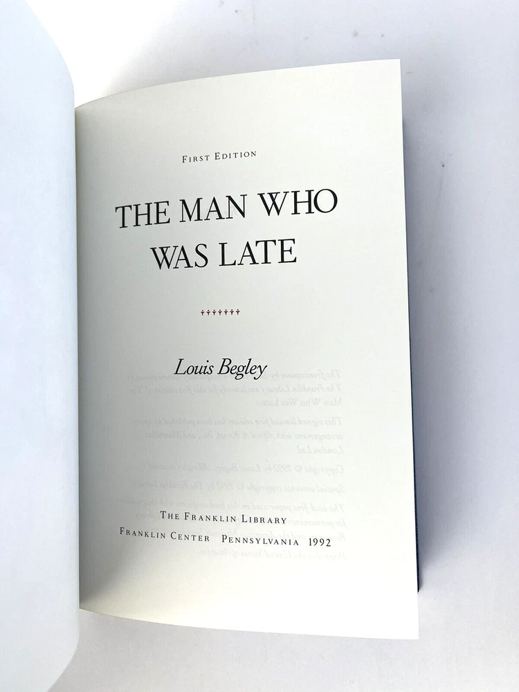 The Man Who Was Late by Louis Begley. PA: The Franklin Library, 1992. 243 pages. Thank you for looking at this interesting item. Please take a look at all of the photos. We will always try to highlight any condition issues (if there are any). We take pride in our careful rigid packaging and prompt shipping. Please follow our store as we post new items including bargain auctions nearly everyday. Have a great day!