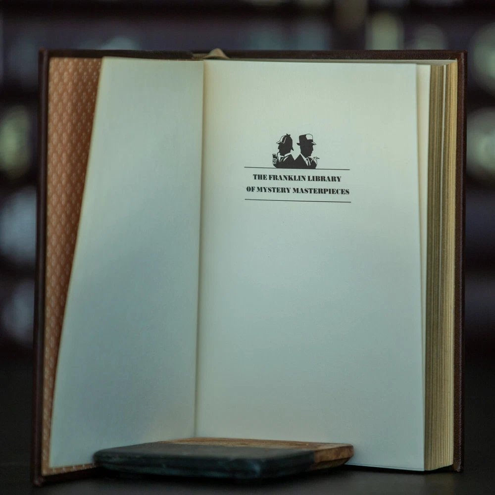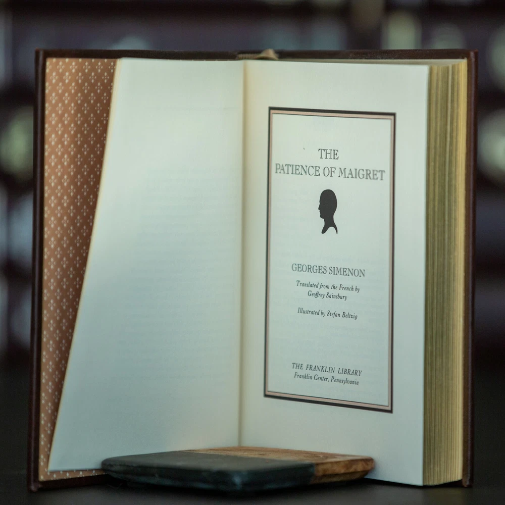 This is a real leather edition of The Patience of Maigret by Georges Simenon. This book has the silk ribbon bookmark and should not be mistaken for the lower quality leatherette version of this title. This book was published by Franklin Library as a part of The Franklin Library of Mystery Masterpieces. This book is in very fine condition. There are no owner's marks, writing, etc. in the book. The book carries no scent from smoking, pets, etc. This book appears to have never been read and is a gorgeous copy of this title. There are a few very light scratches/marks on the gold gilt page edges. There is also a very small spot on the front edge of the bottom pages with missing gold gilt. See the photos for the actual condition of the book and please message us with any questions about the condition of this title. Thanks for looking! We have multiple listings of Franklin Library and Easton Press books and we can combine shipping on multiple books.