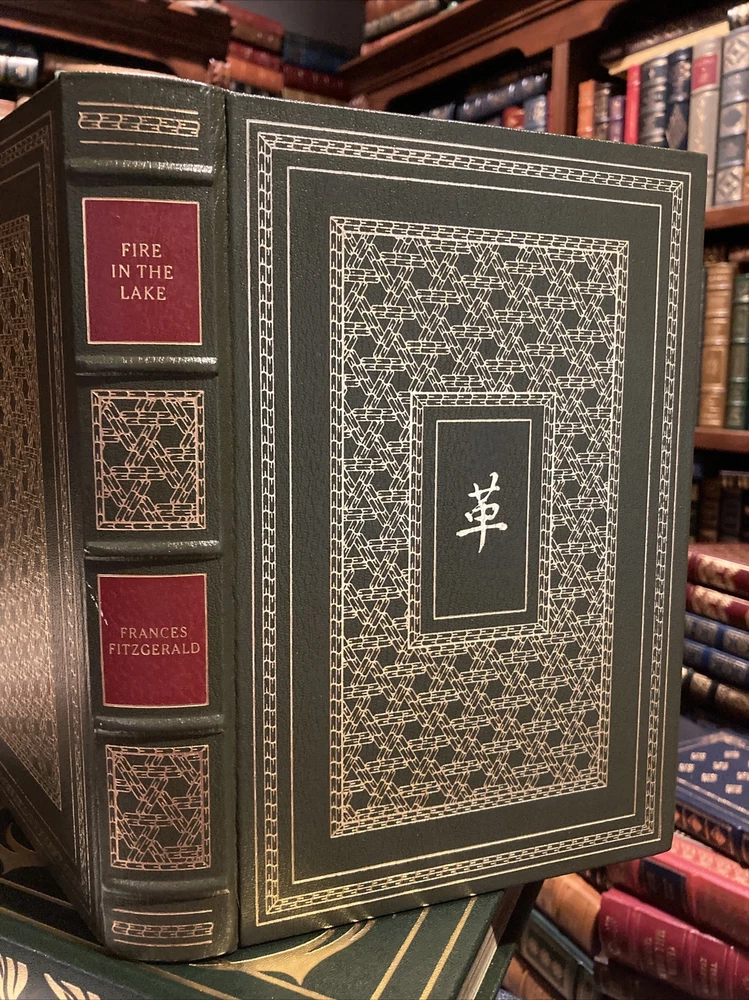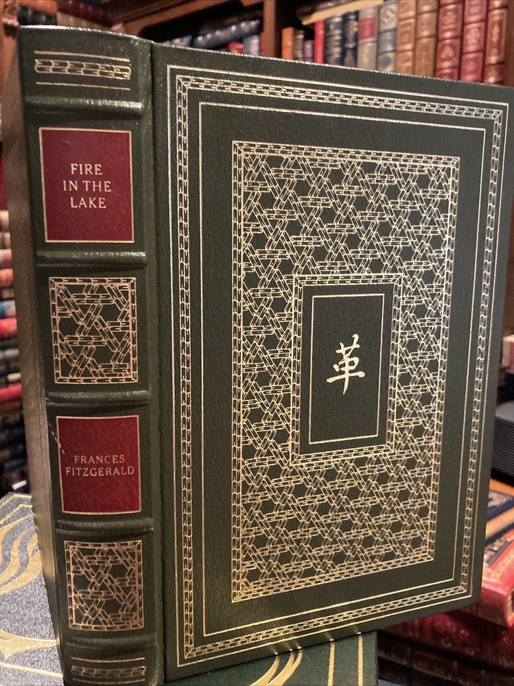 Franklin Library leather edition of Francis Fitzgerald's "Fire in the Lake: The Vietnamese and the Americans in Vietnam," With Maps from the First Edition, one of the PULITZER PRIZE CLASSICS series, published in 1984. Bound in brown leather, the book has paper end leaves, satin book marker, gold gilt on three edges---in near FINE condition. Francis Fitzgerald, who was born in 1940, wrote the first major book by an American on Vietnam, its history and the United States activities there. Originally published in 1972, historians ranked the book as one of the best books of the year and it was on the New York Times bestsellers list for more than 10 weeks, won the Pulitzer Prize, the Bancroft Prize for history and the National Book Award. FitzGerald said it was a "first draft of history." She explored thousands of years of the history and culture of Vietnam, showing how these affected the relations of its peoples with their encounter with the United States. She says that the US understood little about the country and its leaders, reacting to the threat of communism rather than recognizing the nation's long struggle to gain and keep its independence from foreign invaders. She argued that American values of freedom, democracy, optimism, and technological progress were inconsistent with Vietnam's values, culture, agrarian economy, and long history of warfare with France and China, making the Vietnam War effort doomed from the start. The Vietnamese sense of government, history, politics, and war is completely different from the American one. They have had a cultural tradition of ancestor worship and a different belief in what constitutes effective government (the Mandate of Heaven . The US government's failure to acknowledge these differences led to its failure in waging war there against the North Vietnamese and insurgents. FitzGerald wrote, "But the American officials in supporting the Saigon government insisted that they were defending 'freedom and democracy' in Asia. They left the GIs to discover that the Vietnamese did not fit into their experience of either 'communist' or 'democrats.' She continued, "Whatever strategy the American government uses to carry on the war, it will only be delaying the inevitable." The book discusses the US government's ignorance of Vietnam's history, especially their determination to rid themselves of foreign invaders. They fought against Chinese domination for 1000 years, despite the latter's vastly superior population and resources. Many of the people considered United States forces to be another wave of foreign invaders. The book covers the history in depth and reaches the Tet Offensive 90% of the way through the narrative. It explores the Cao Dai monotheist religious sect in Tay Ninh , the corrupt regime of Ngo Dinh Diem , and "Nixon's War." The book is one of the first to explore the Vietnamese shanty towns that developed around US bases. They were centers of laundry services, bars and food, and prostitution. 491 pages, including an Index. I offer combined shipping.