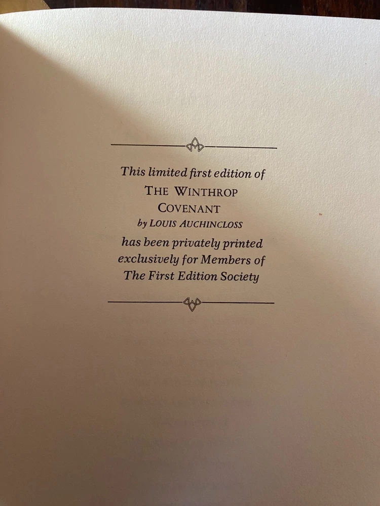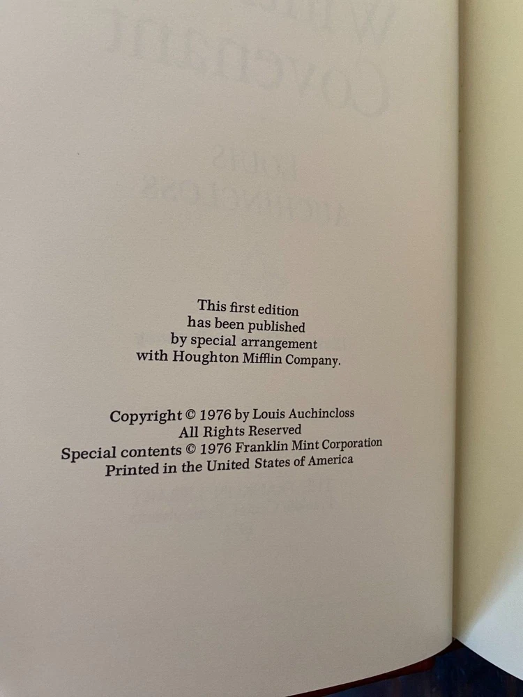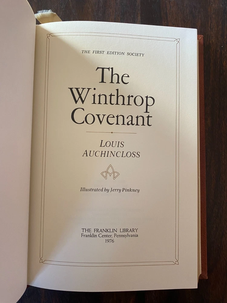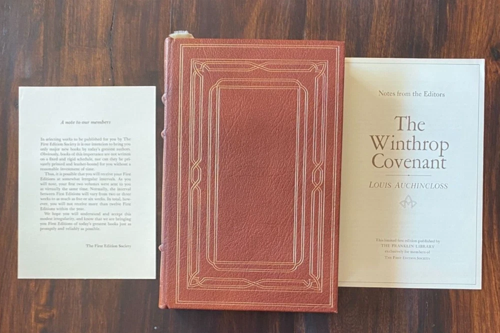 Franklin Library The Winthrop Covenant By Auchincloss 1976, First edition, 1st Edition Society, C-2 Genuine leather with 22 karat gold decorations, all page edges gilded with 22 karat gold, sewn-in satin ribbon bookmarks, silk moire fabric endpapers. Please see photos as they are the most accurate depiction of wear. If there is an angle/view that you do not see and would like more clarification please notify us and we would be more than happy to comply. SHIPPING & HANDLING Mailing Address - We will ONLY ship to the address on file with eBay. Before making a purchase, please ensure that your address is correct! We may otherwise cancel the sale. Calculated Shipping - Our shipping fees are calculated based on weight and dimensions. Combined Invoices - We will combine shipping if purchases can be safely combined.