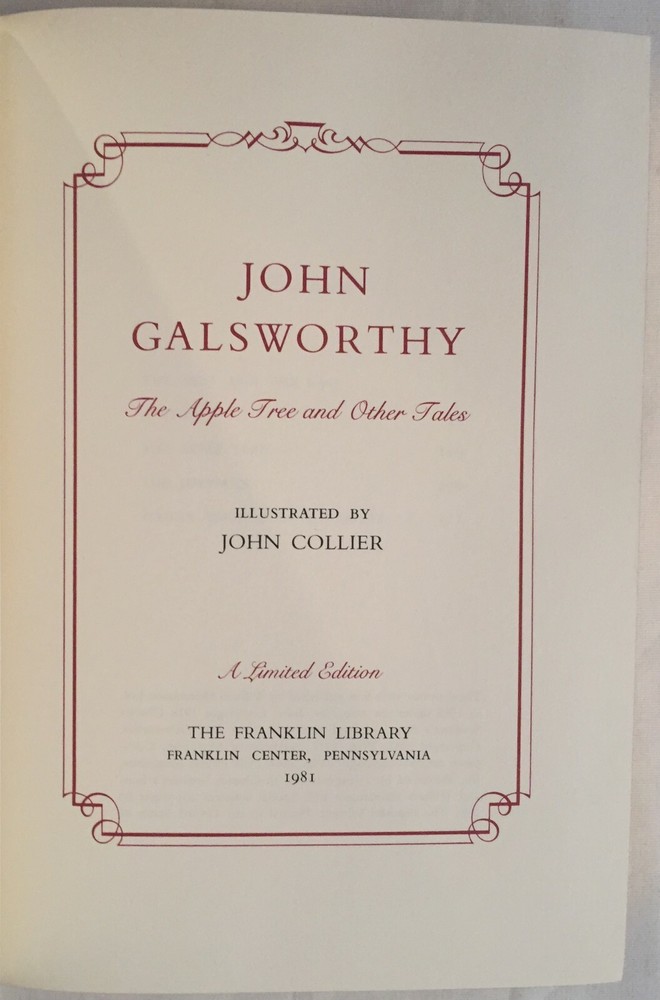 Franklin Library - The Apple Tree and Other Tales by John Galsworthy - Limited Edition Bound in full genuine red leather with 22kt gold trim. Luxury features include gilded page edges, a sewn-in satin bookmark, moire endpapers, raised bands on the spine, and archival quality paper that is sewn (not glued) into the binding. This is a tight unread copy. Title: The Apple Tree and Other Tales Author: John Galsworthy Illustrator: John Collier Series: The Collected Stories of the World's Greatest Writers Publisher: The Franklin Library, Franklin Center, Pennsylvania Publication Date: 1981 Edition: Limited Binding: Hardcover. Leather. Condition: Fine. Tight, unread. Dust Jacket: None issued