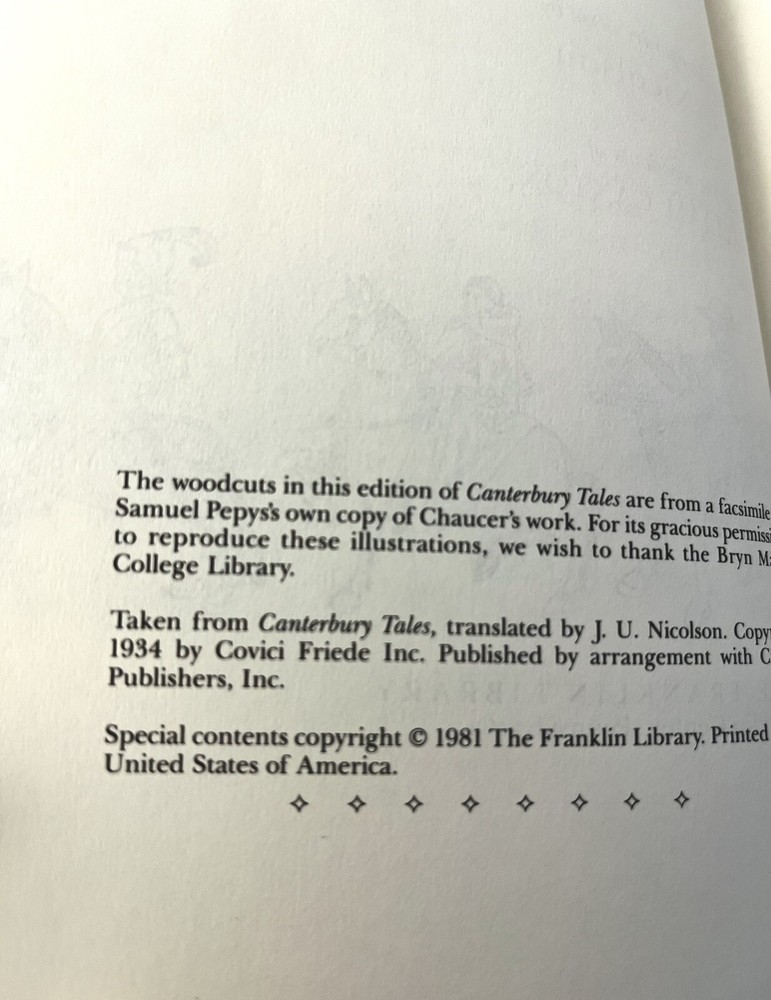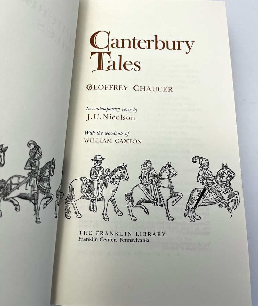 Offered in this collector’s edition by The Franklin Mint is the classic The Canterbury Tales (Middle English: Tales of Caunterbury). It is a collection of twenty-four stories that runs to over 17,000 lines written in Middle English by Geoffrey Chaucer between 1387 and 1400. It is widely regarded as Chaucer's magnum opus.