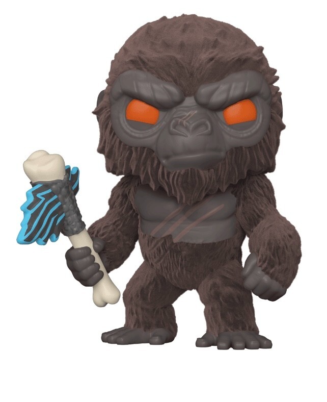 The product is a Funko Pop vinyl figure of King Kong from the movie "Godzilla vs. Kong." It features King Kong holding a battle axe and is an exclusive release from Books A Million. The figure is part of the Pop! product line and comes with a protector case.