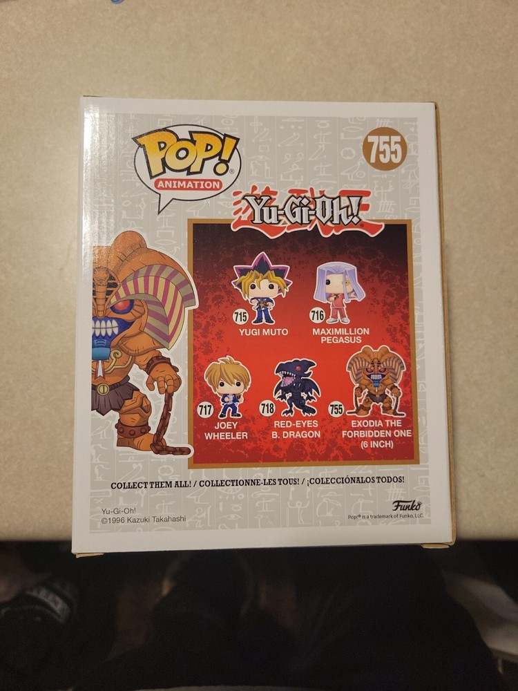 This Funko Pop! vinyl figure features Exodia, the Forbidden One from the popular Japanese anime and manga franchise, Yu-Gi-Oh! Measuring at 6 inches tall, this item is a must-have for any collector. The figure comes in its original packaging, unopened, and is in excellent condition. Along with the figure, a POP protector is included to ensure its safety during shipping and handling. Whether you're a fan of the show or simply a collector of vinyl figures, this Funko Pop! Exodia figure is a great addition to any collection.