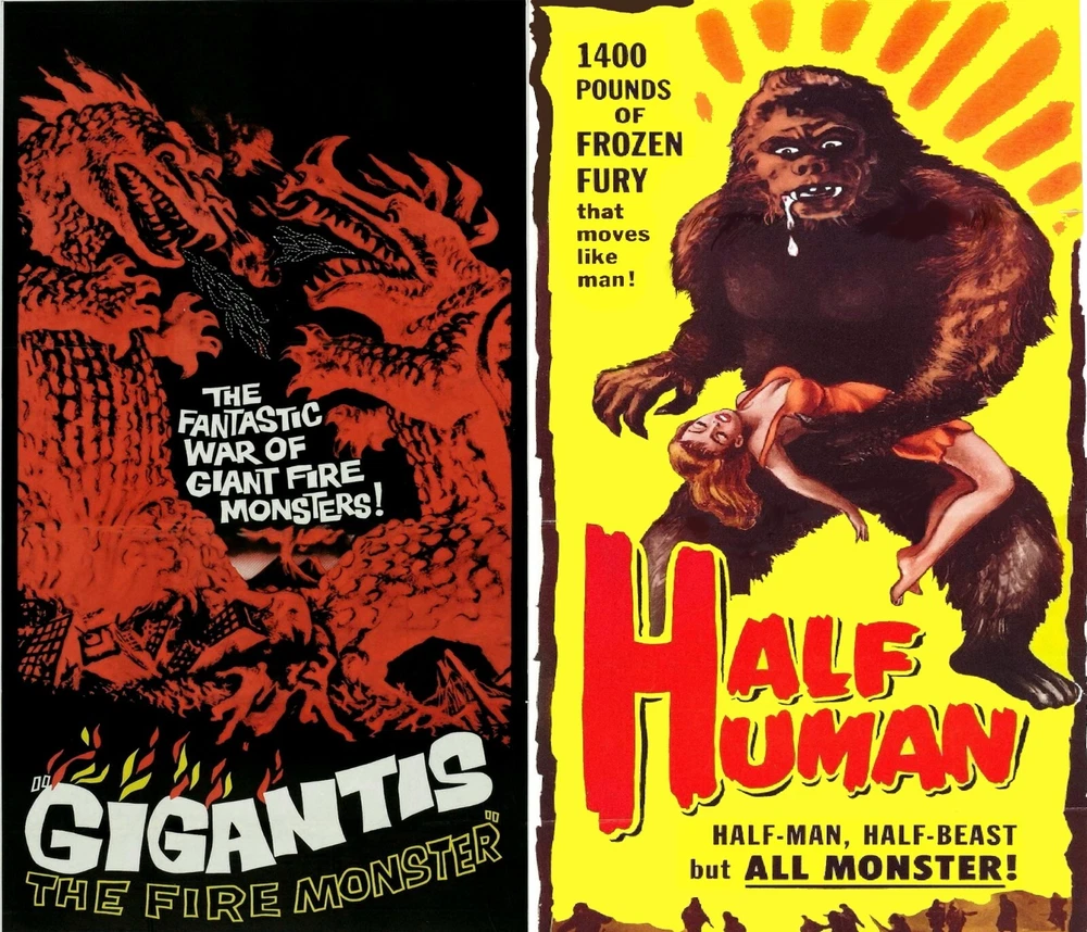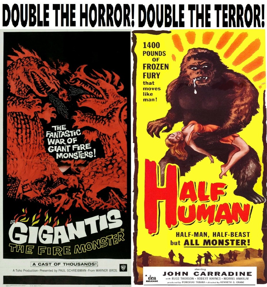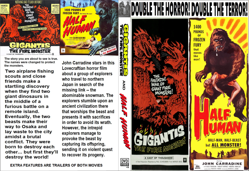 Welcome. you are bidding on a DVD-R Double feature Titled "GIGANTIS THE FIRE MONSTER" and "HALF-HUMAN" . These are the American version of Toho's "GODZILLA RAIDS AGAIN" and "THE SNOWMAN" which was cut to pieces and new scenes were added involving Key Luke and John Carradine as they narrates and narrates and narrates the movies to death. DVD-R is region-free and should play on any DVD or Blu-ray player. To the best of my Knowledge, these old movies I have collected are in the public domain. Along with these titles, there are trailers of the movies. This is NOT an expensive digitally remastered, fancy packaging store bought version. I have search high and low to find as many of these copies each in the best condition as possible. DVD has fun menu and Disc will be in DVD case with cool artwork. Note few samples from photos to see quality of print and fun menu . This DVD-R is coded (Zero) NTSC, to play anywhere in the world and is for collectors like myself. No international shipping and PayPal only. Thank you for looking and good luck.