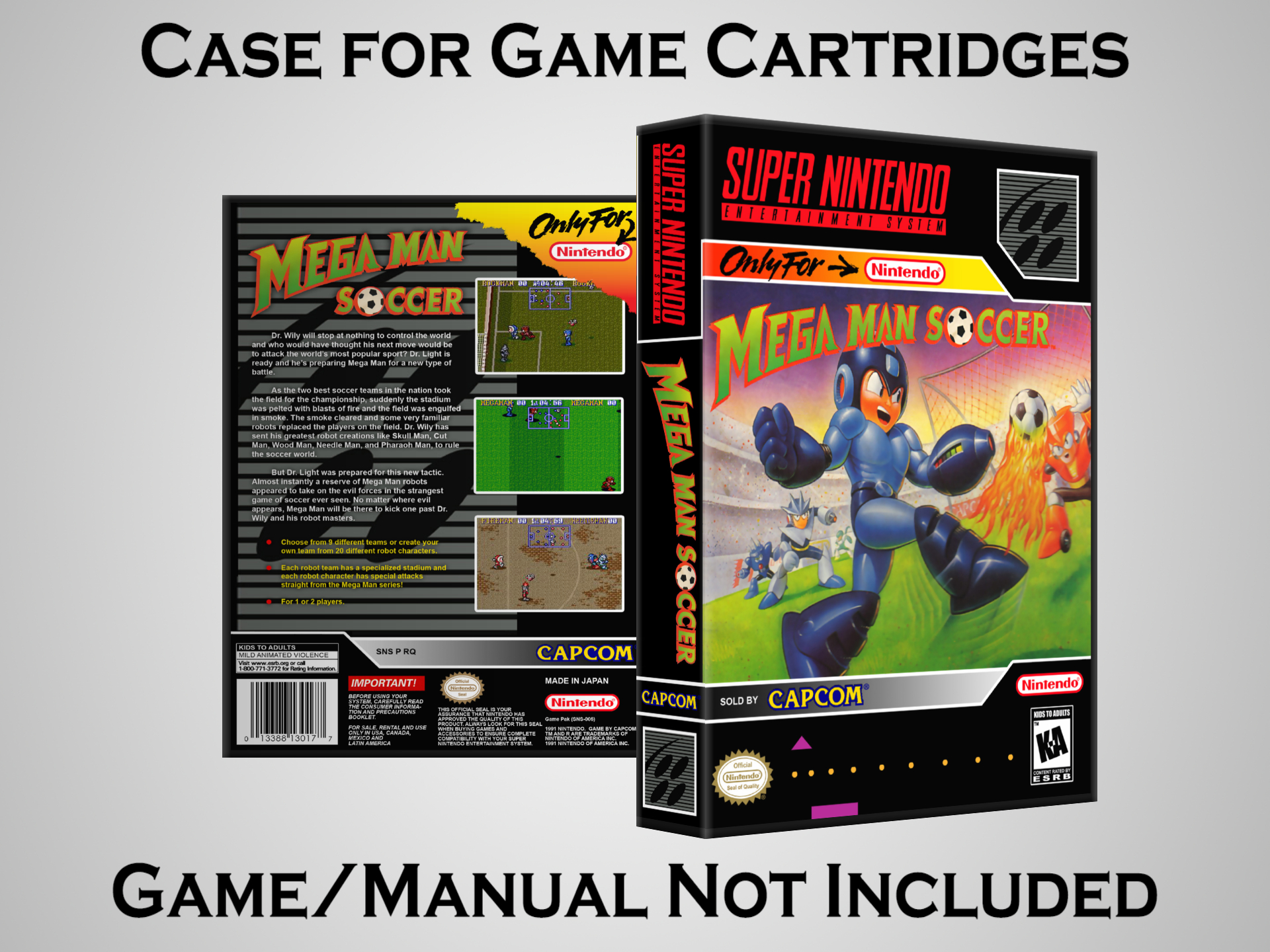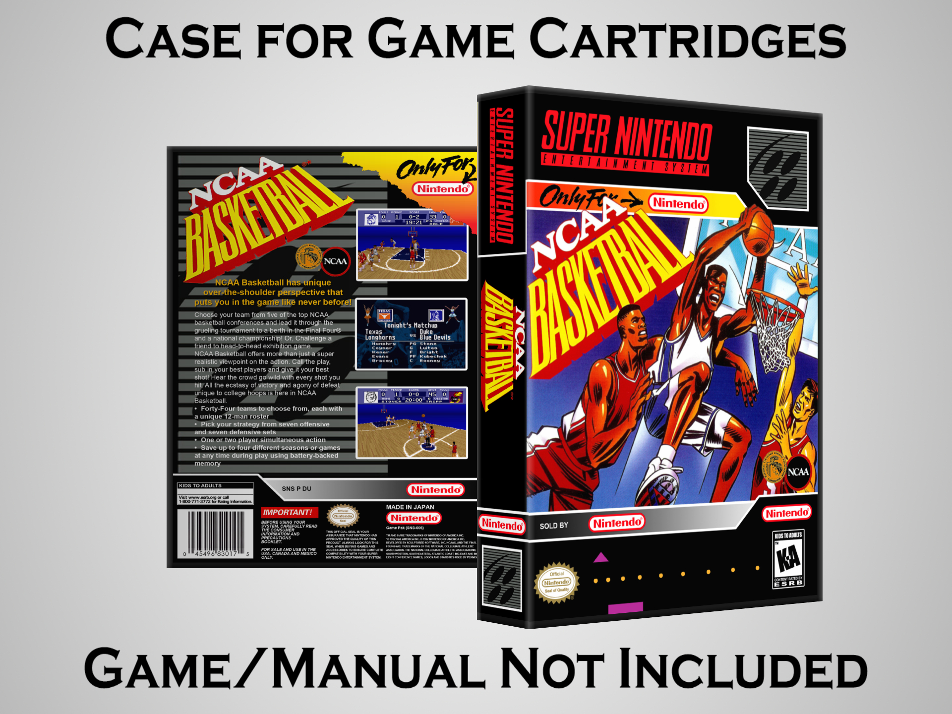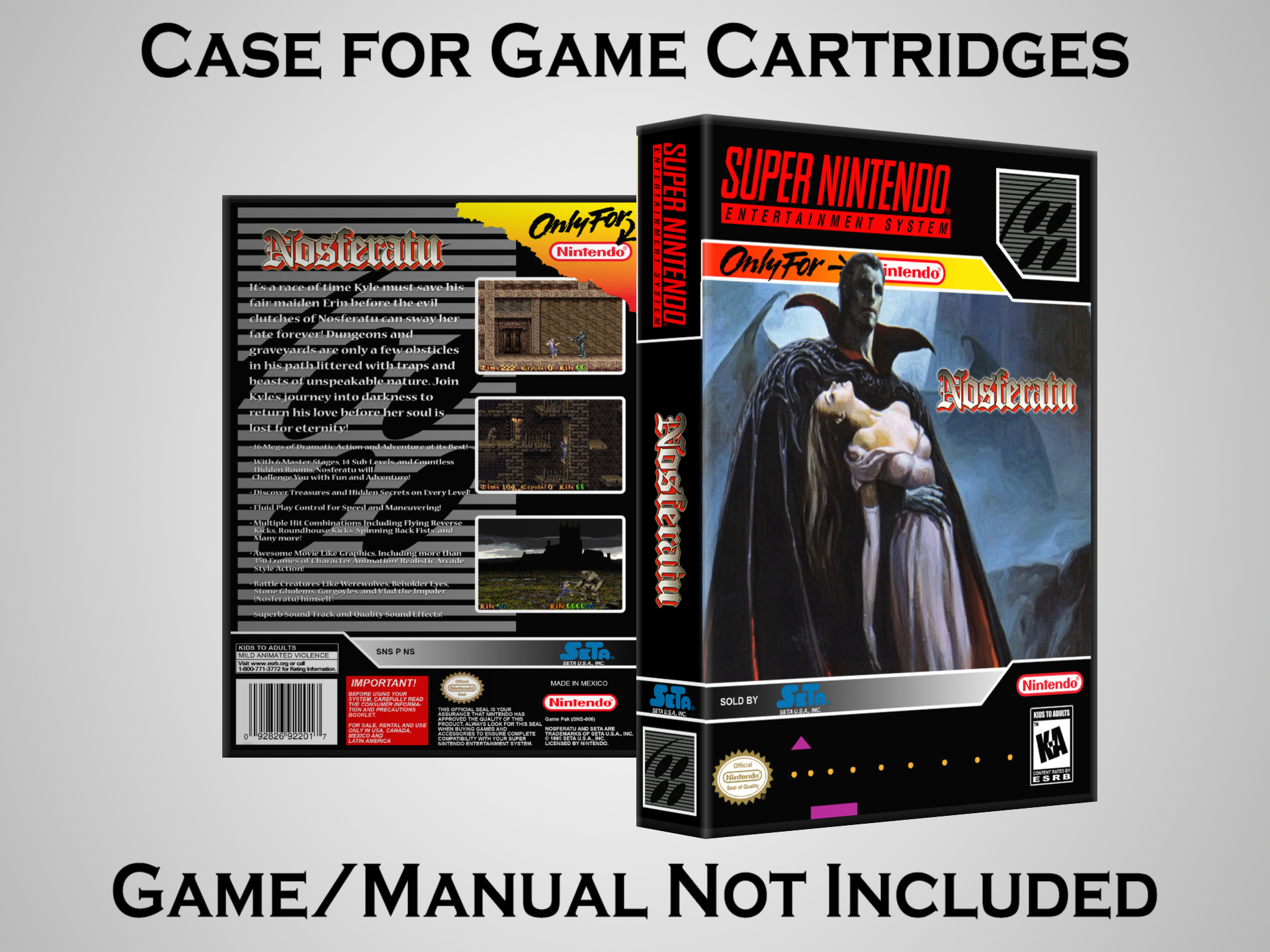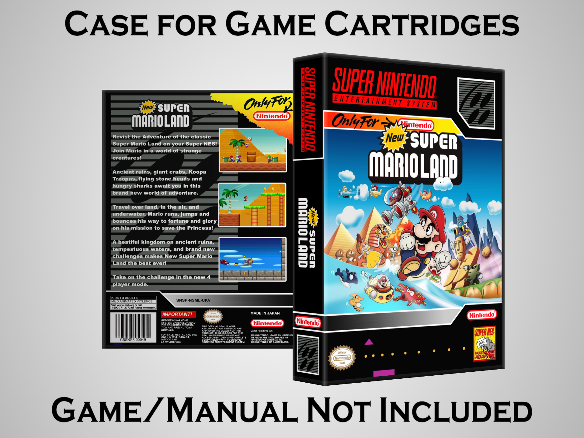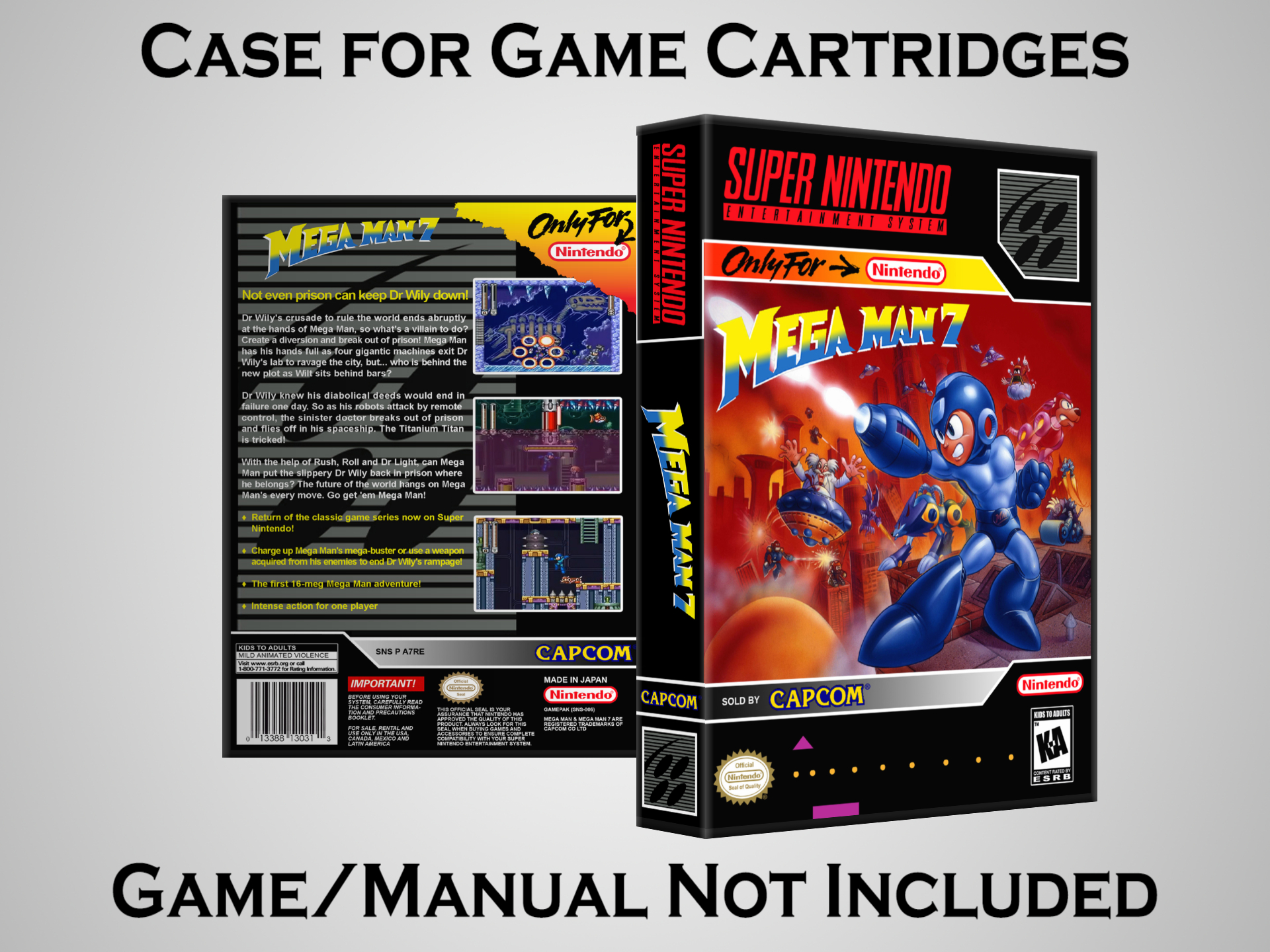 NO GAME OR MANUAL IS INCLUDED! This is NOT an original cardboard box. Case Dimensions : 7.25" x 5.25" x 1.125" Case Color : Dark Grey These cases are designed specifically to hold your Super Nintendo (SNES) cartridges. These are not the low quality Universal Game Cases that most other sellers offer. These firmly hold your cartridges in place, and include clips on the opposite side to hold the instruction manuals if you have them. Our Super Nintendo cases are split into multiple listings alphabetically due to the limit on options in one listing. You can find the rest of our cases in the following links: SNES Cases from # to F SNES Cases from G to N SNES Cases from O to S SNES Cases from T to Z Click here to find more cases in our eBay store!