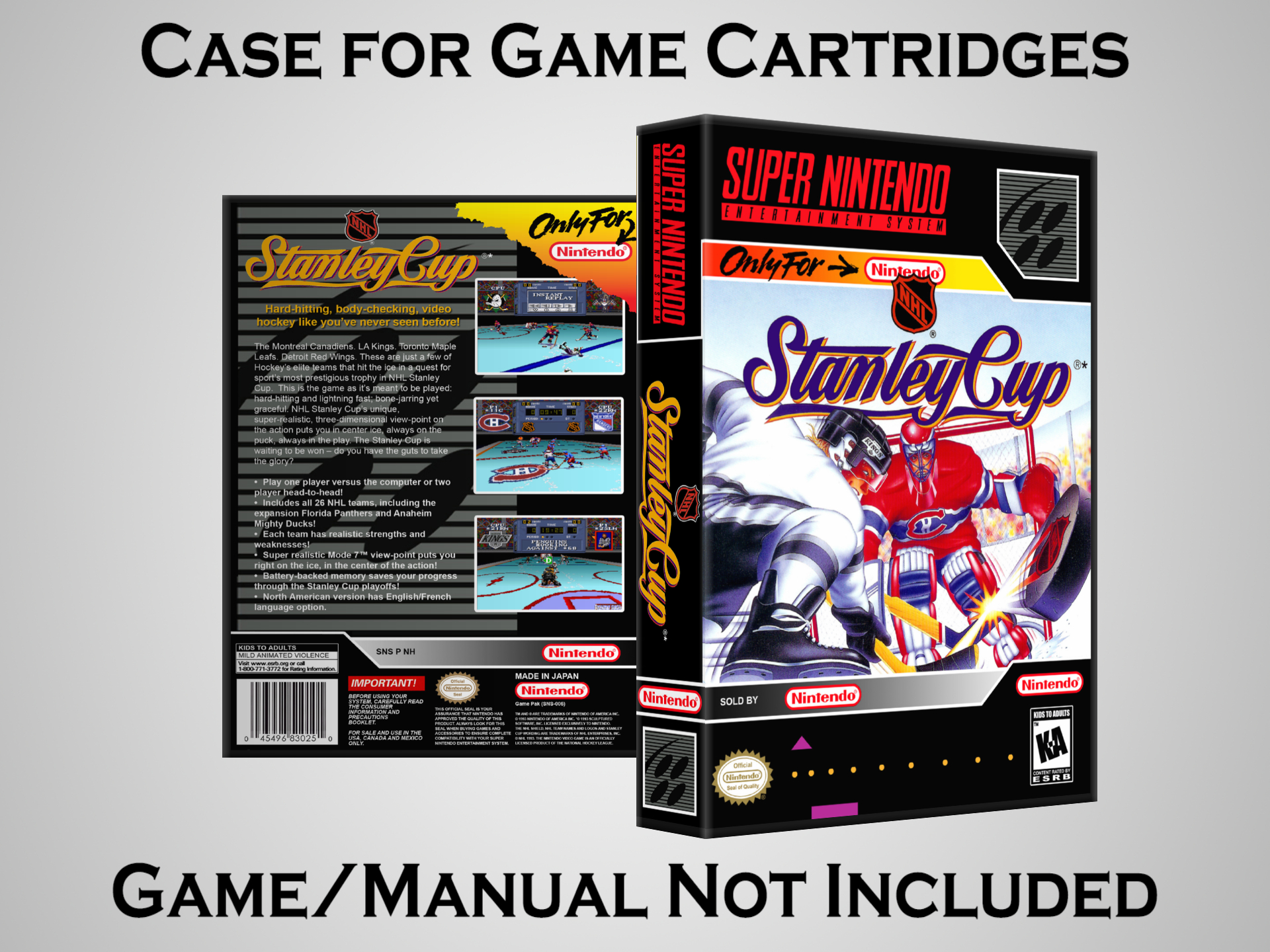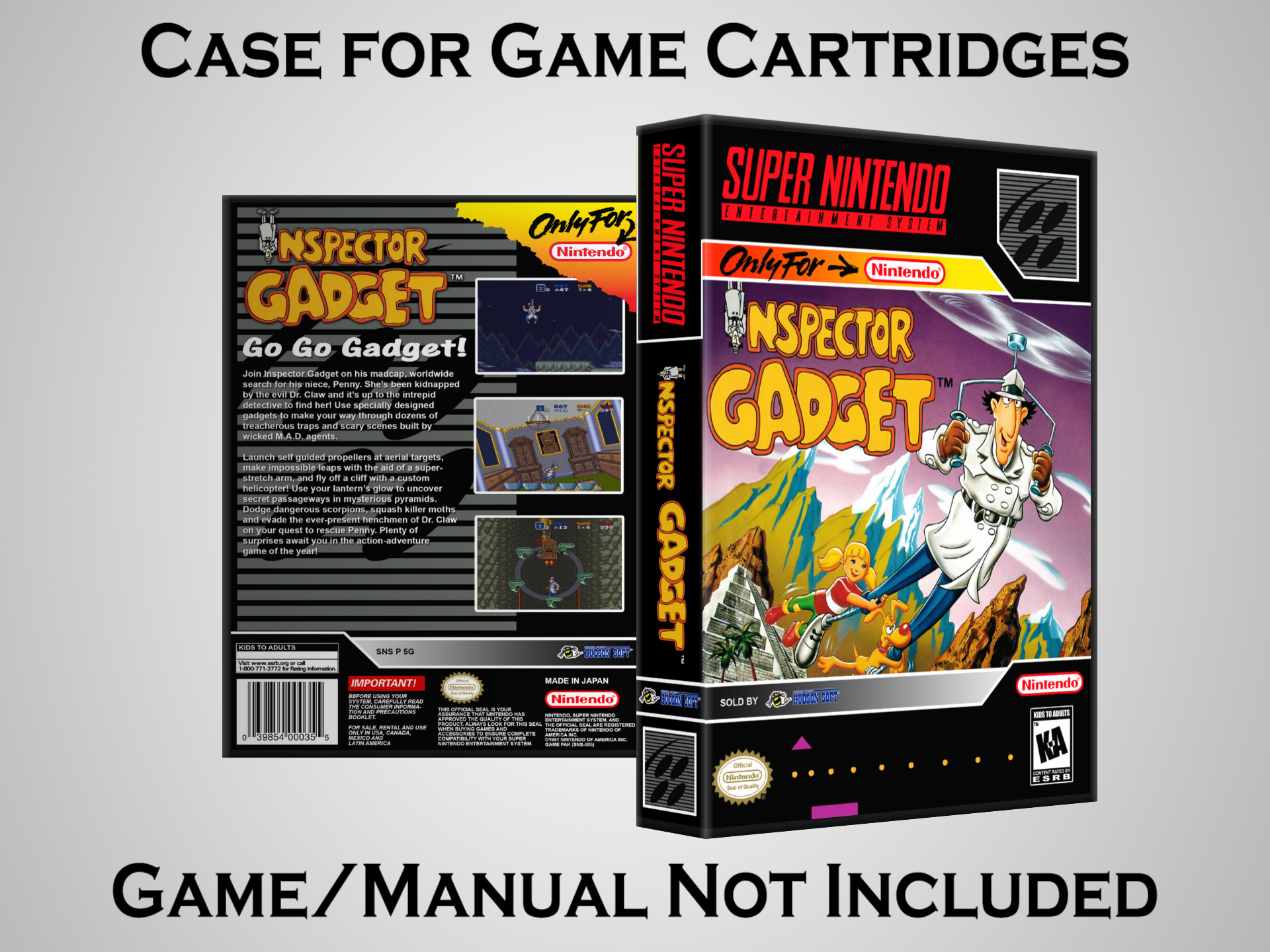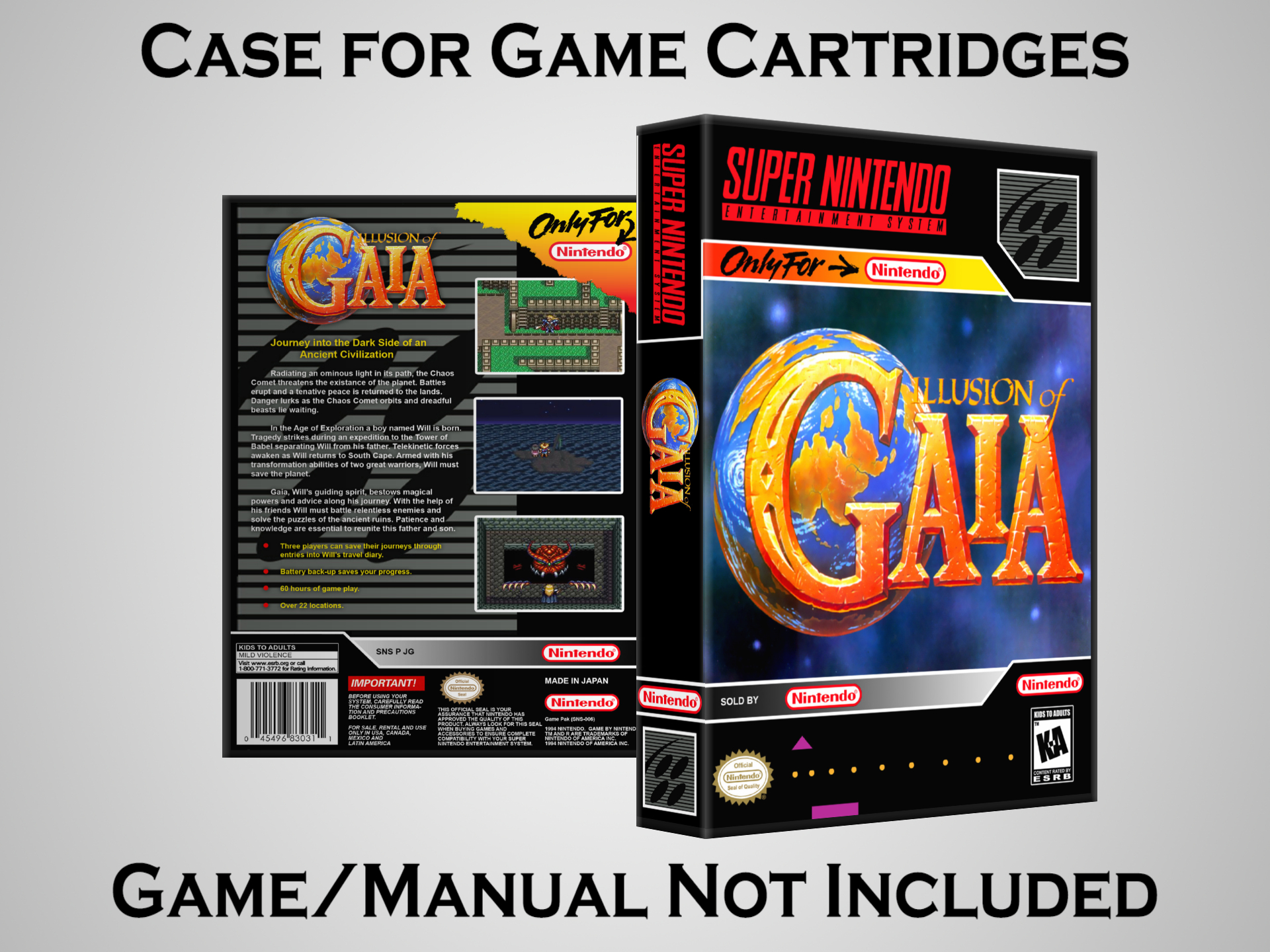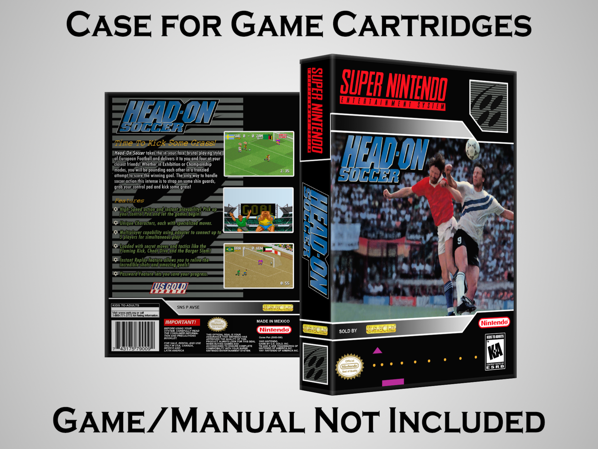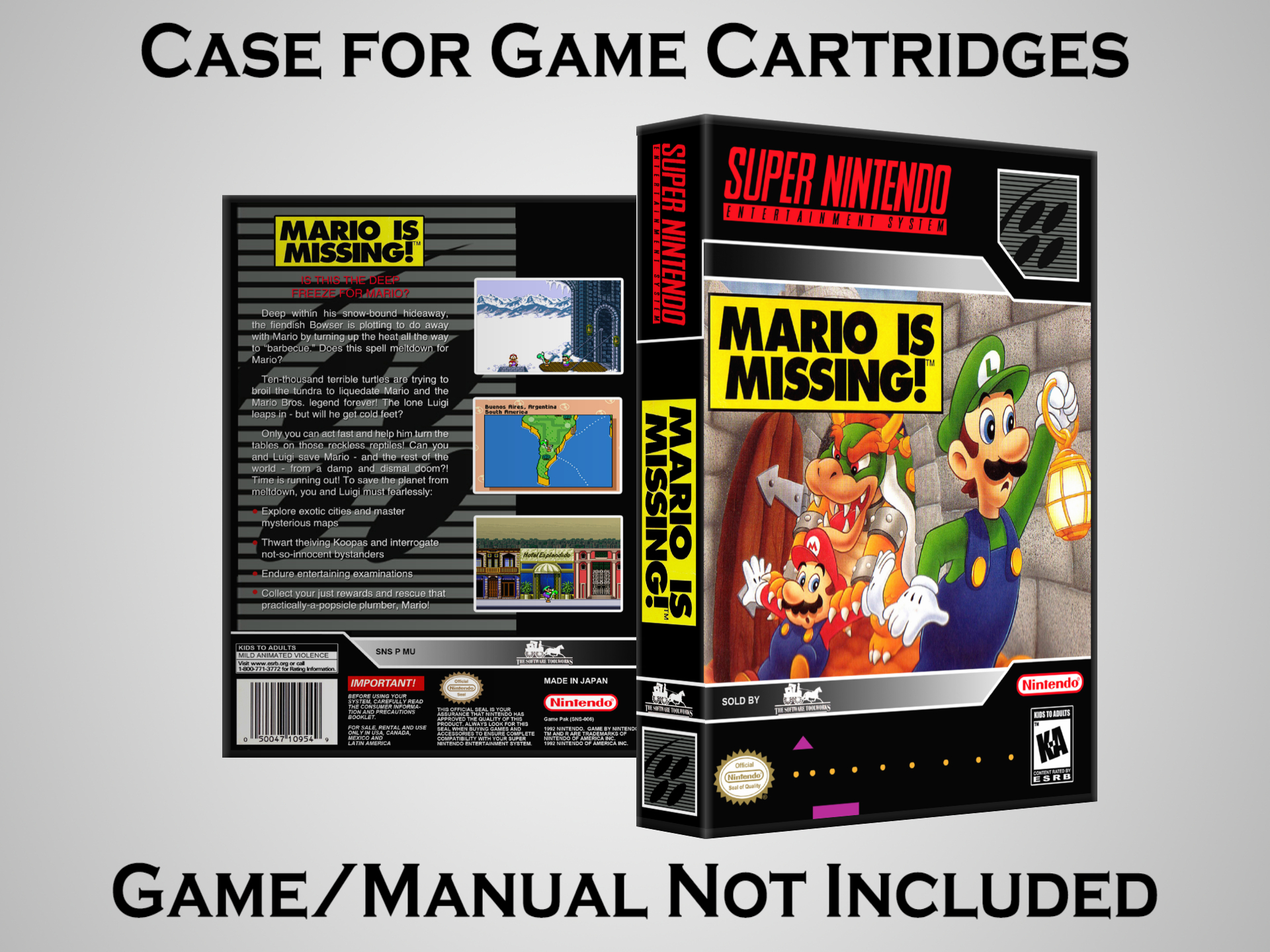 NO GAME OR MANUAL IS INCLUDED! This is NOT an original cardboard box. Case Dimensions : 7.25" x 5.25" x 1.125" Case Color : Dark Grey These cases are designed specifically to hold your Super Nintendo (SNES) cartridges. These are not the low quality Universal Game Cases that most other sellers offer. These firmly hold your cartridges in place, and include clips on the opposite side to hold the instruction manuals if you have them. Our Super Nintendo cases are split into multiple listings alphabetically due to the limit on options in one listing. You can find the rest of our cases in the following links: SNES Cases from # to F SNES Cases from G to N SNES Cases from O to S SNES Cases from T to Z Click here to find more cases in our eBay store!