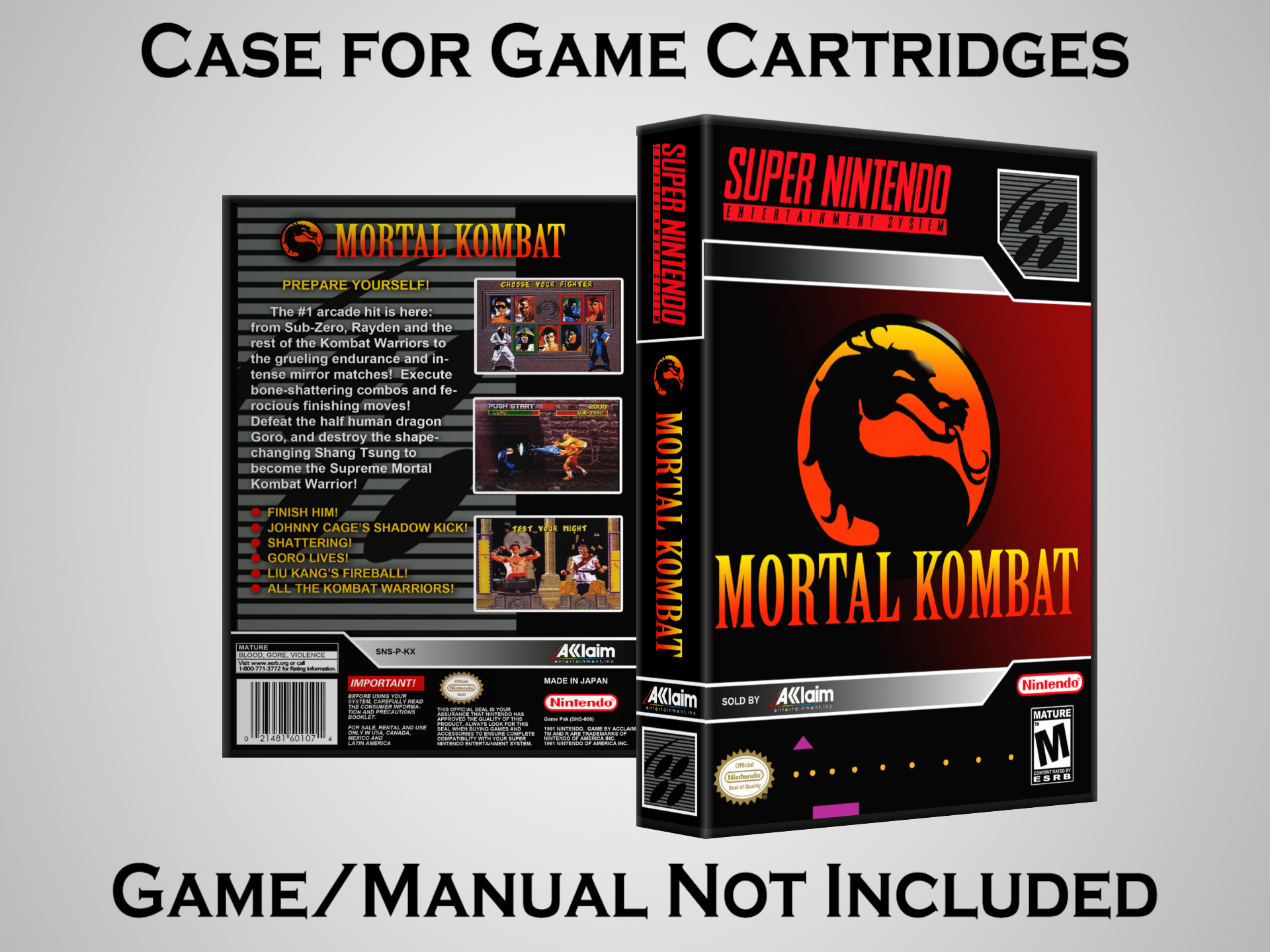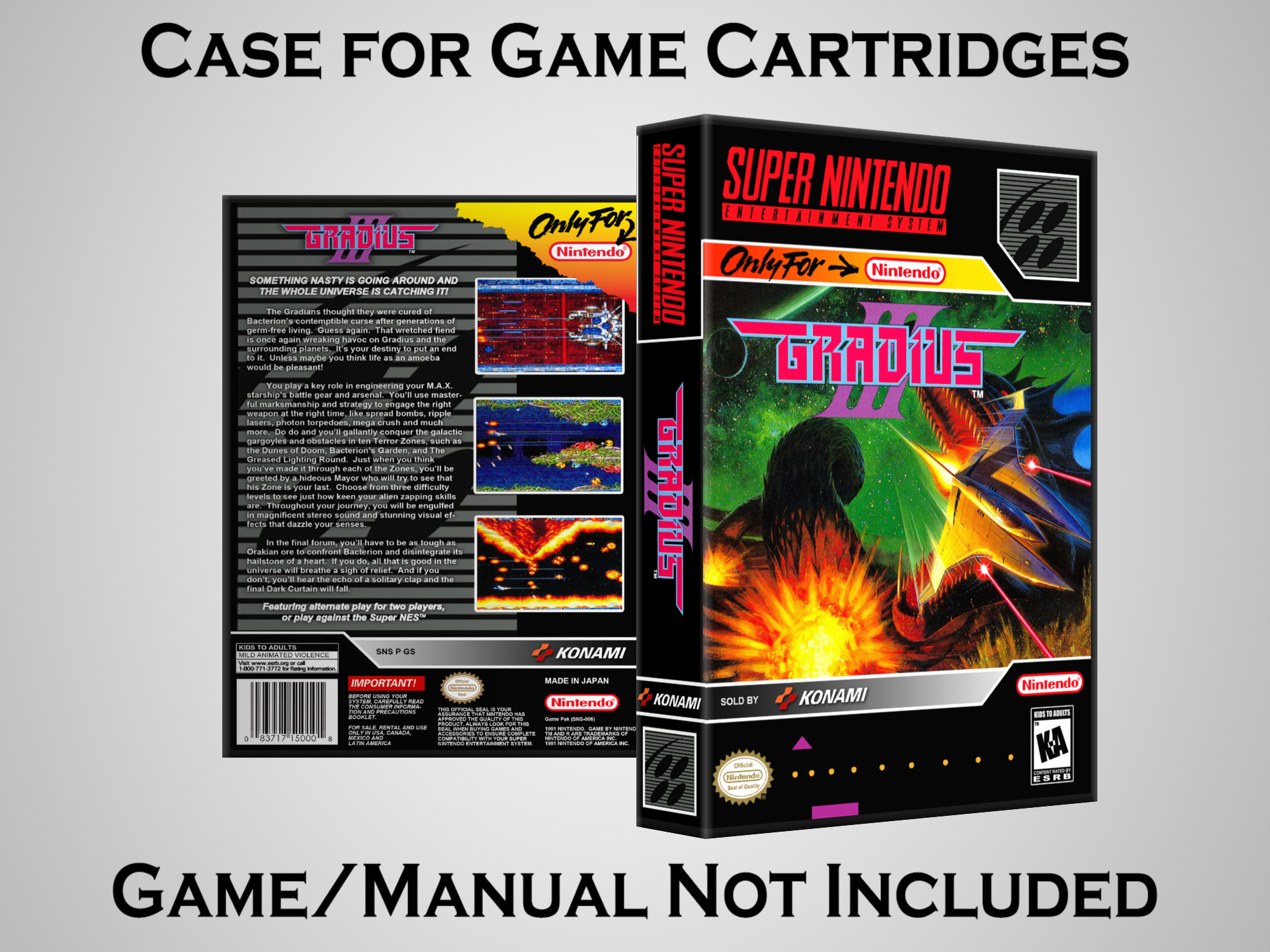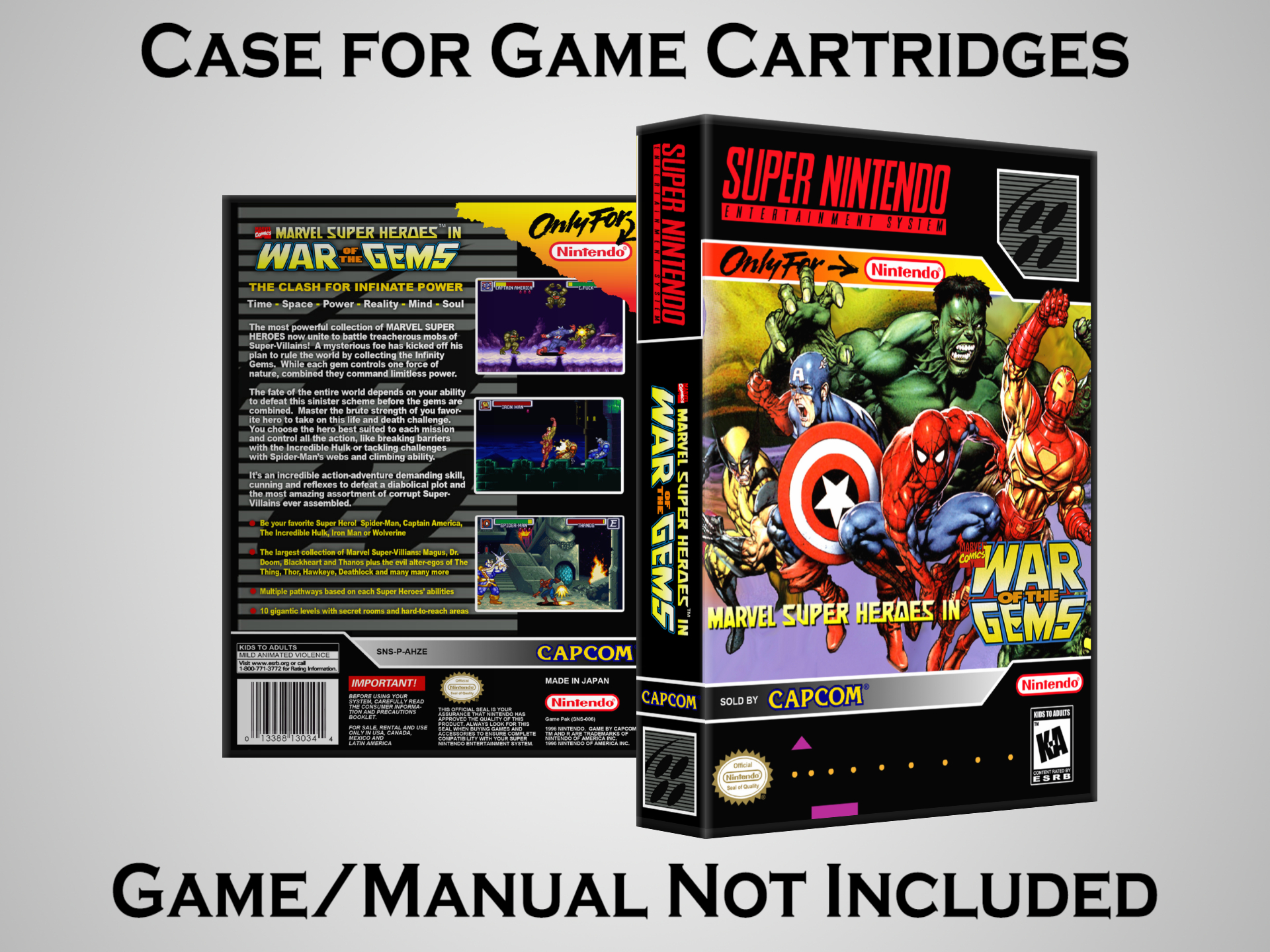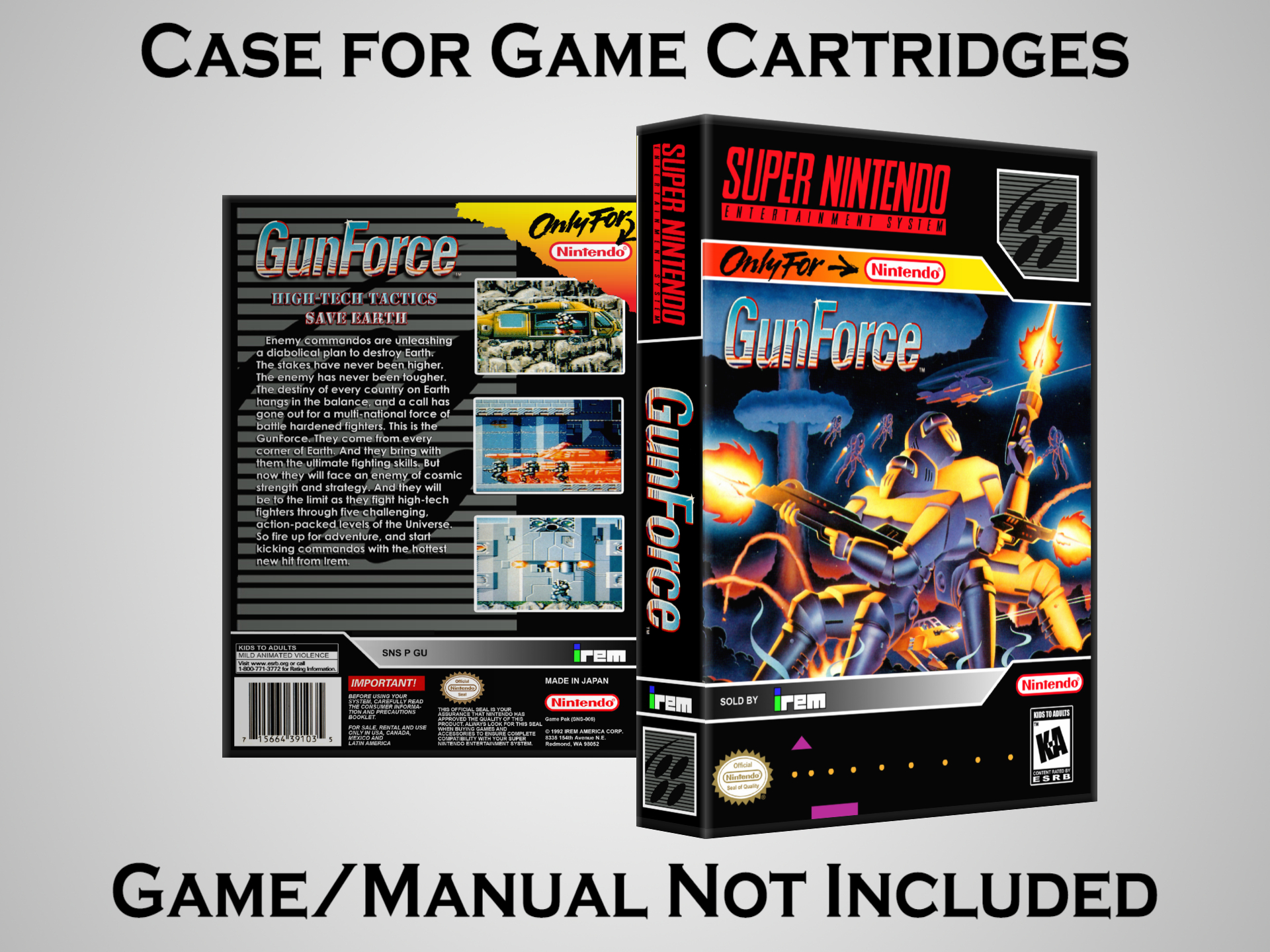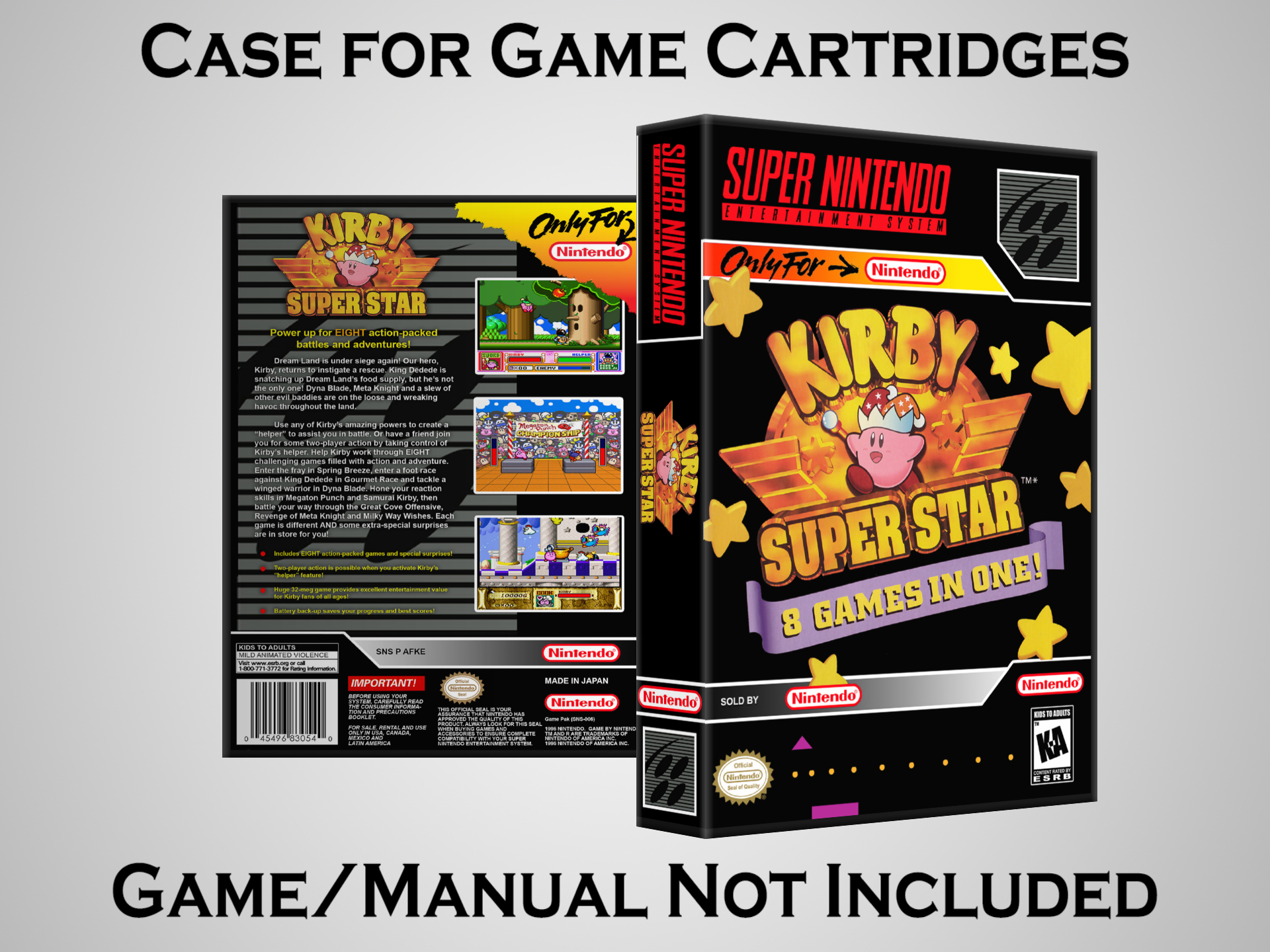 NO GAME OR MANUAL IS INCLUDED! This is NOT an original cardboard box. Case Dimensions : 7.25" x 5.25" x 1.125" Case Color : Dark Grey These cases are designed specifically to hold your Super Nintendo (SNES) cartridges. These are not the low quality Universal Game Cases that most other sellers offer. These firmly hold your cartridges in place, and include clips on the opposite side to hold the instruction manuals if you have them. Our Super Nintendo cases are split into multiple listings alphabetically due to the limit on options in one listing. You can find the rest of our cases in the following links: SNES Cases from # to F SNES Cases from G to N SNES Cases from O to S SNES Cases from T to Z Click here to find more cases in our eBay store!