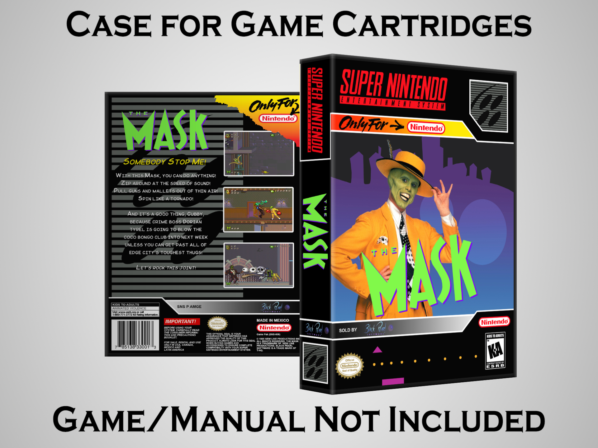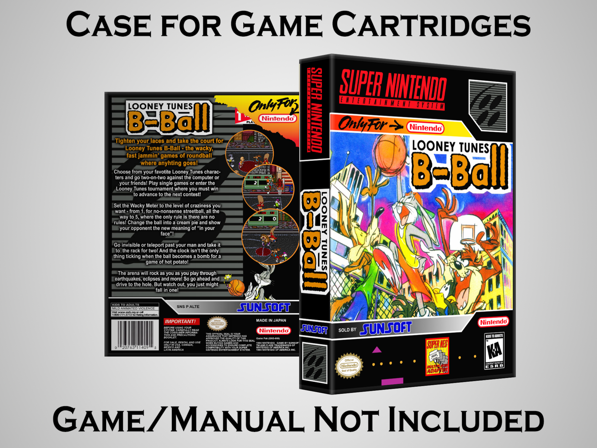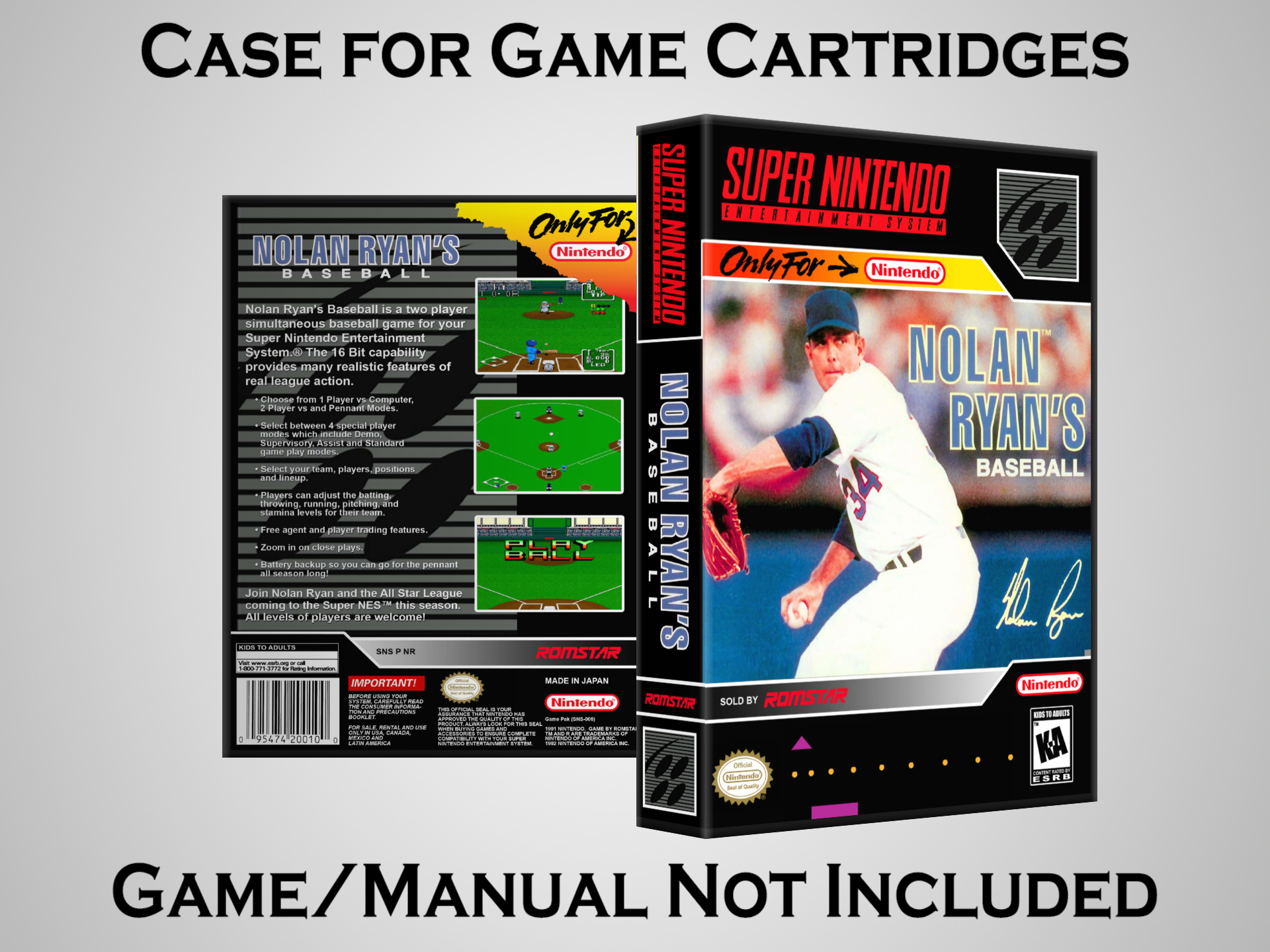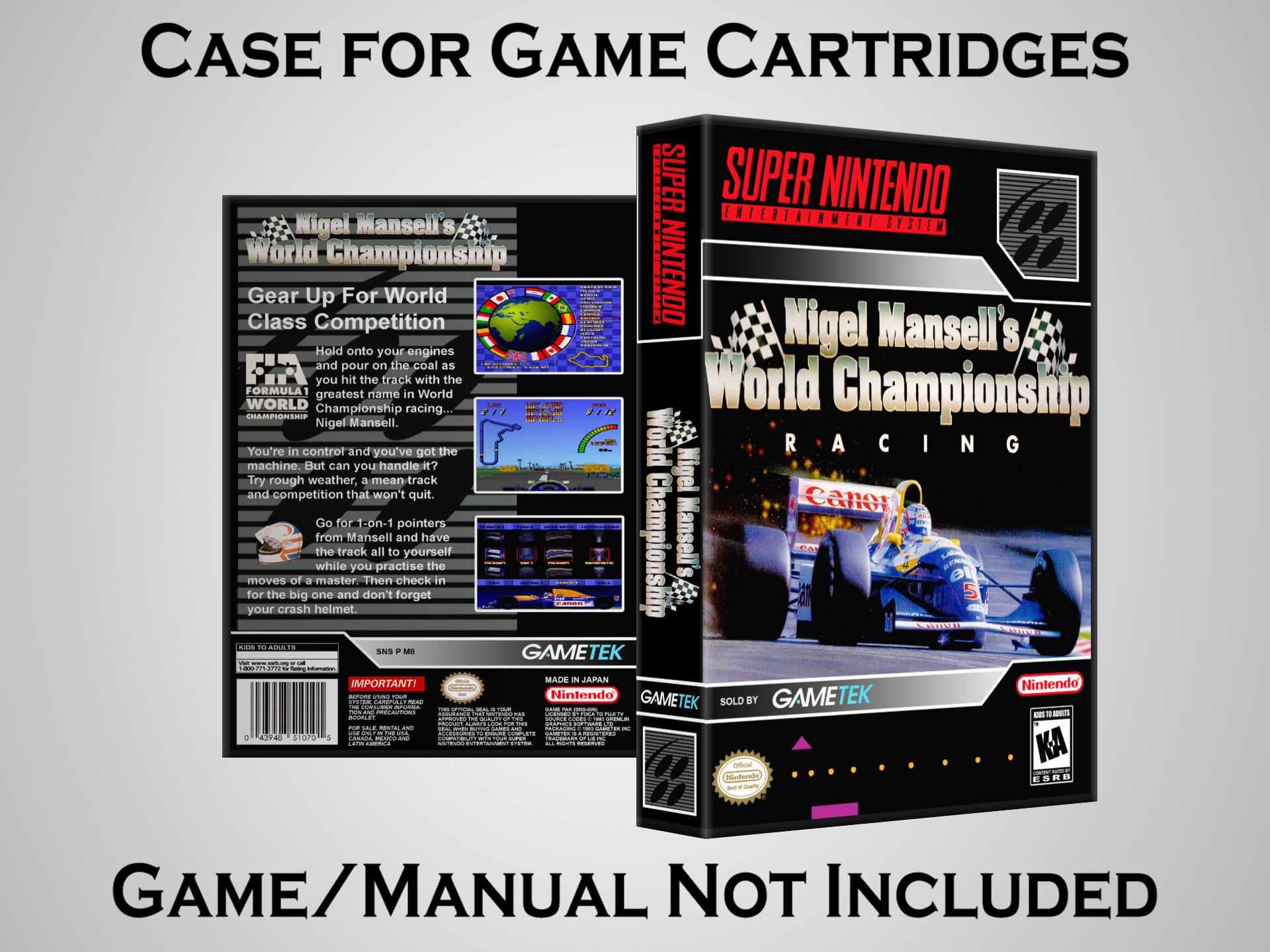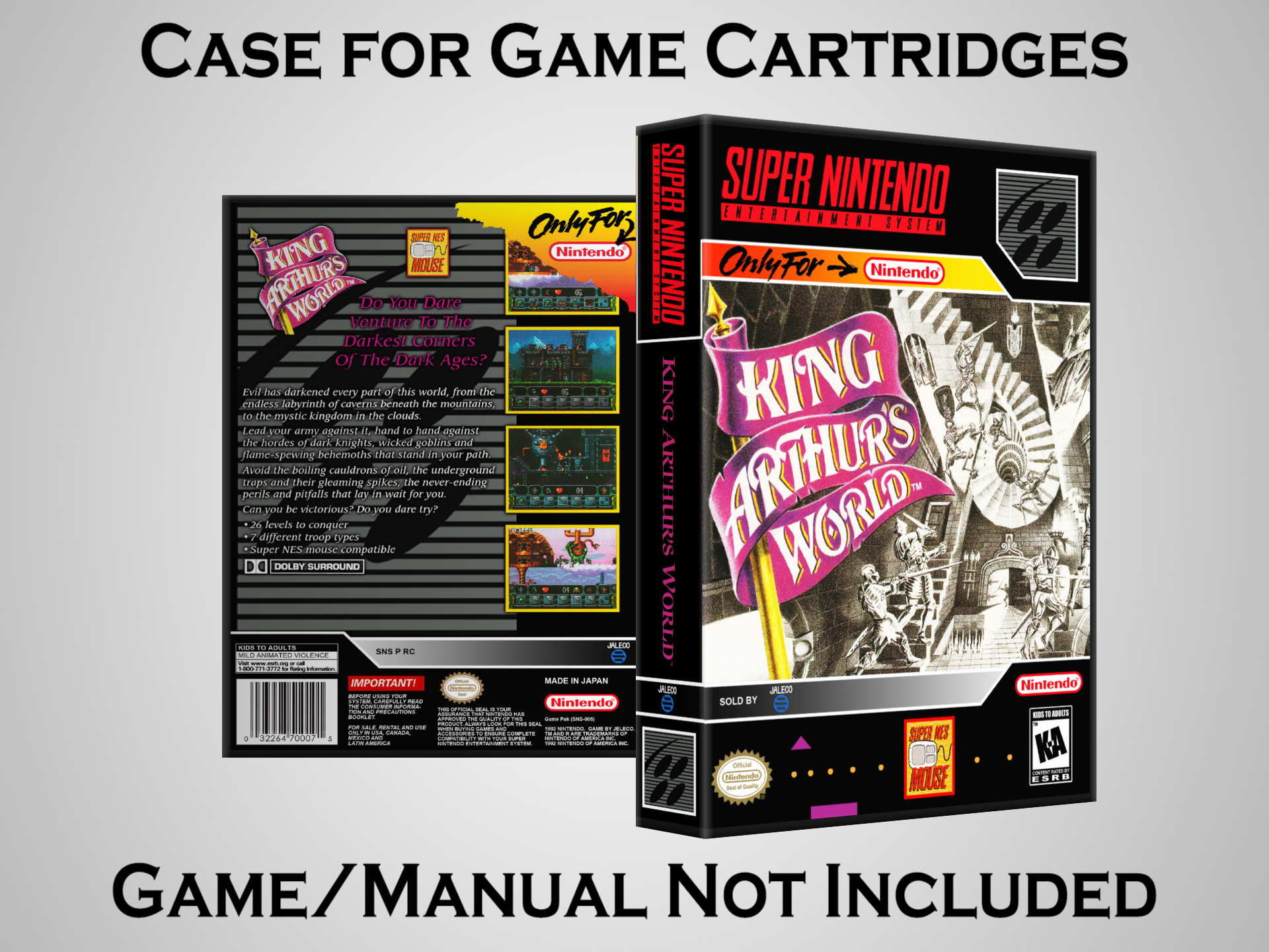 NO GAME OR MANUAL IS INCLUDED! This is NOT an original cardboard box. Case Dimensions : 7.25" x 5.25" x 1.125" Case Color : Dark Grey These cases are designed specifically to hold your Super Nintendo (SNES) cartridges. These are not the low quality Universal Game Cases that most other sellers offer. These firmly hold your cartridges in place, and include clips on the opposite side to hold the instruction manuals if you have them. Our Super Nintendo cases are split into multiple listings alphabetically due to the limit on options in one listing. You can find the rest of our cases in the following links: SNES Cases from # to F SNES Cases from G to N SNES Cases from O to S SNES Cases from T to Z Click here to find more cases in our eBay store!