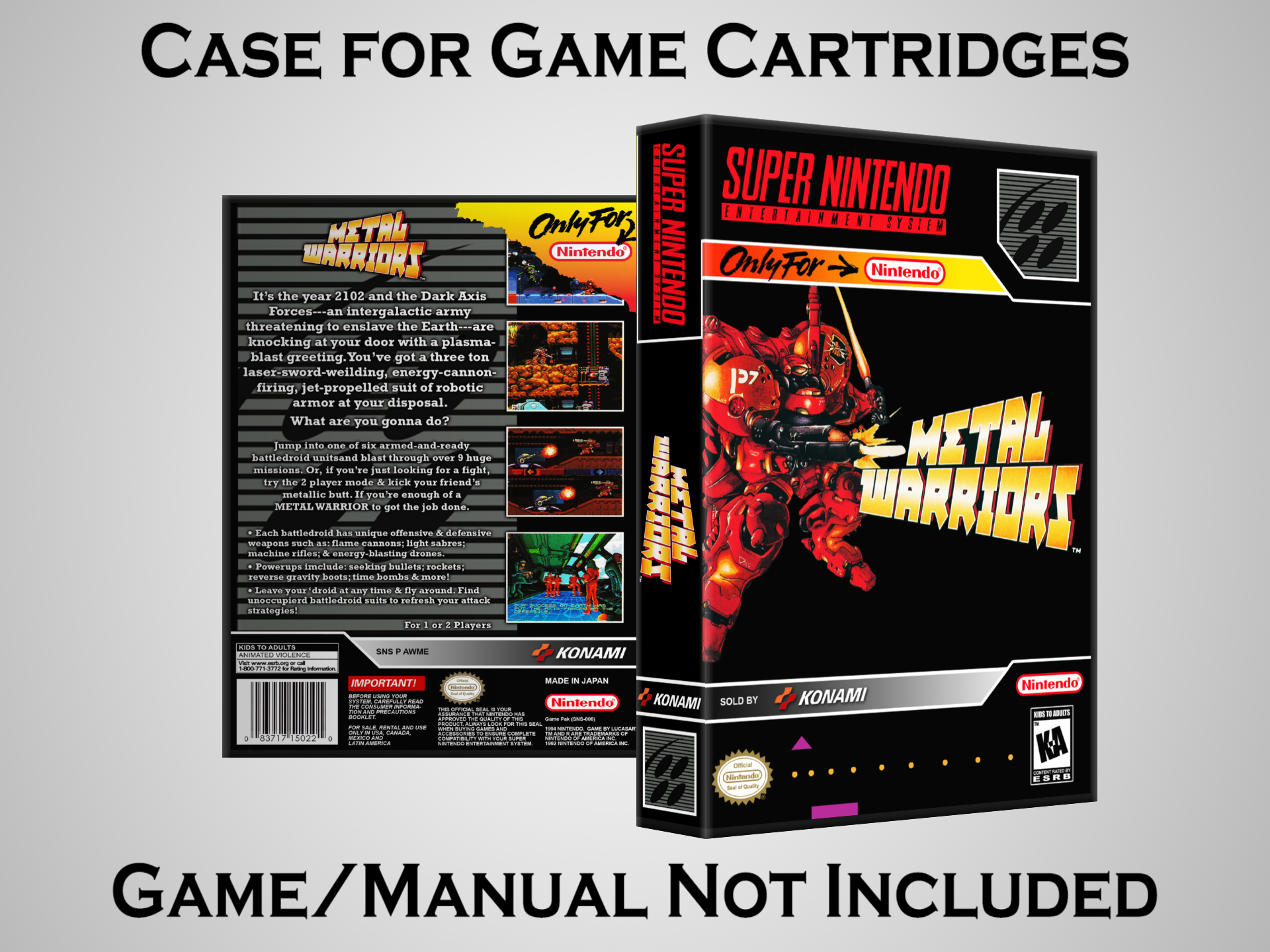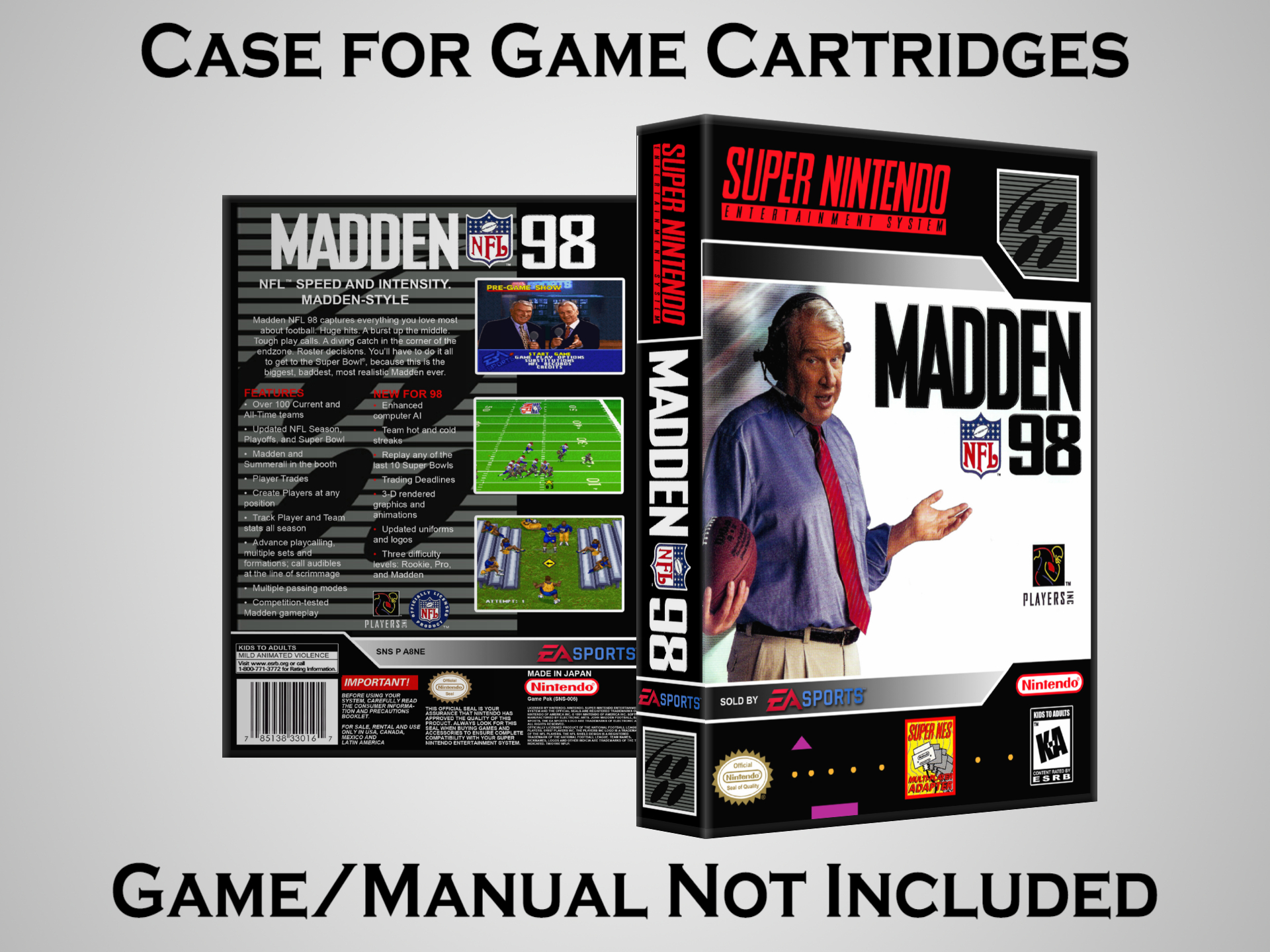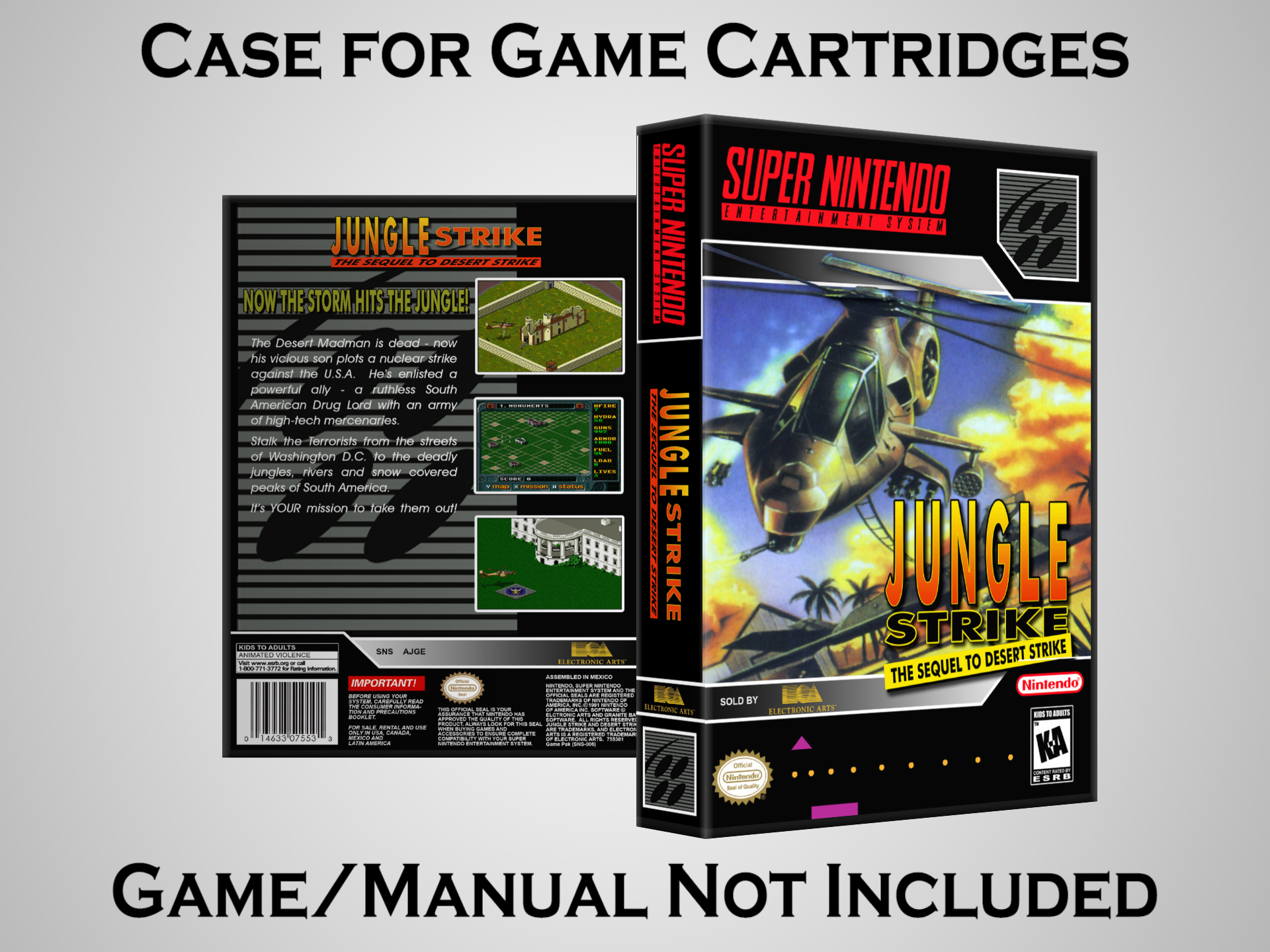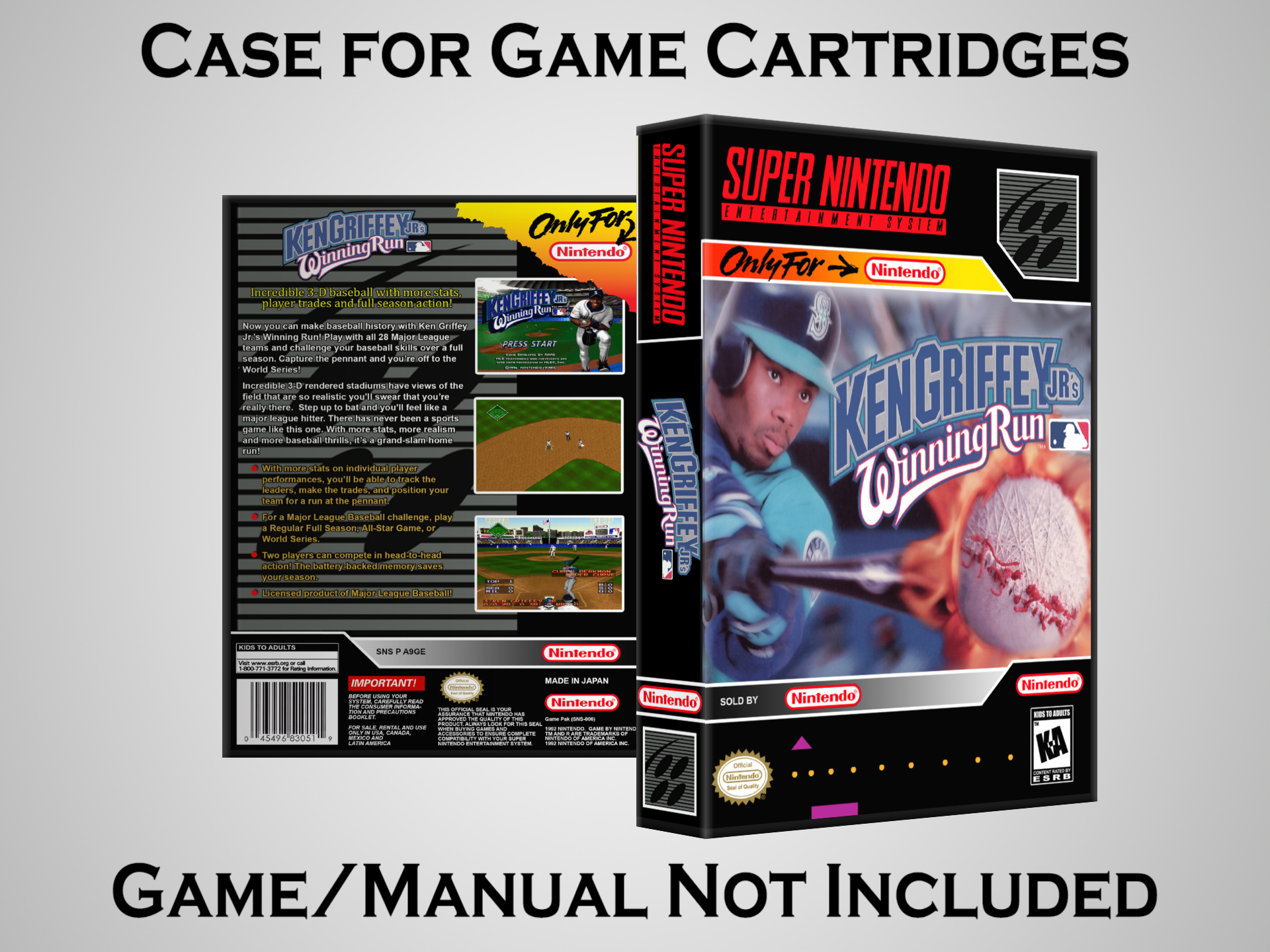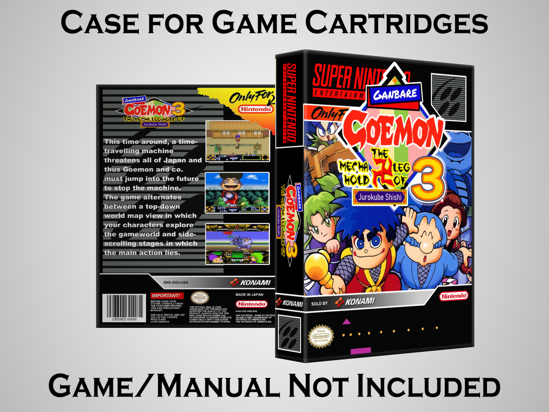 NO GAME OR MANUAL IS INCLUDED! This is NOT an original cardboard box. Case Dimensions : 7.25" x 5.25" x 1.125" Case Color : Dark Grey These cases are designed specifically to hold your Super Nintendo (SNES) cartridges. These are not the low quality Universal Game Cases that most other sellers offer. These firmly hold your cartridges in place, and include clips on the opposite side to hold the instruction manuals if you have them. Our Super Nintendo cases are split into multiple listings alphabetically due to the limit on options in one listing. You can find the rest of our cases in the following links: SNES Cases from # to F SNES Cases from G to N SNES Cases from O to S SNES Cases from T to Z Click here to find more cases in our eBay store!