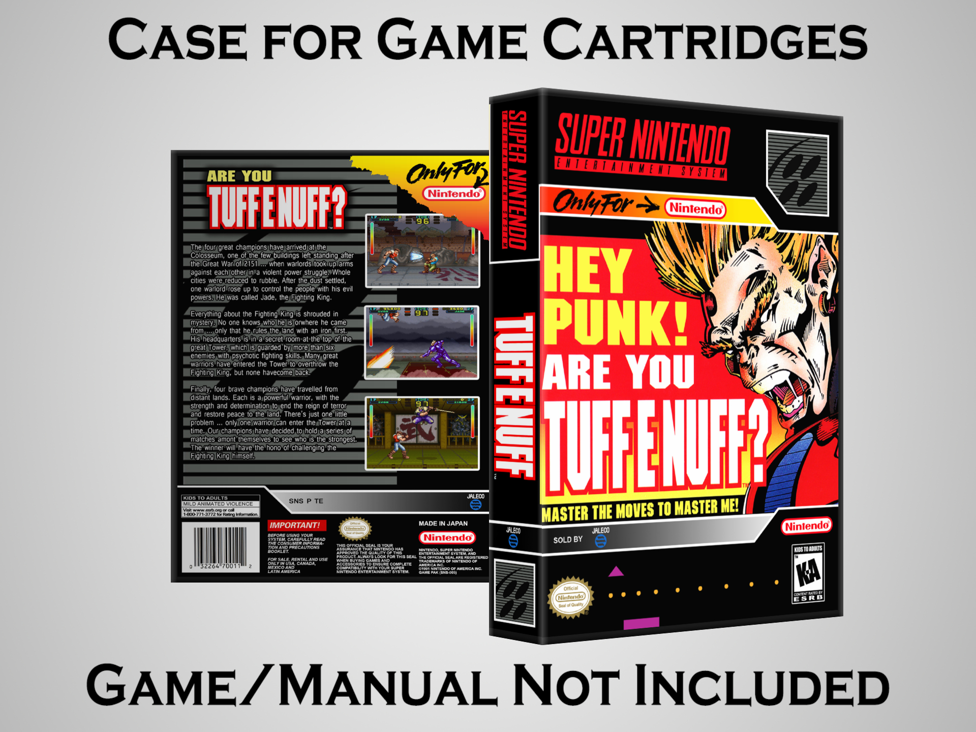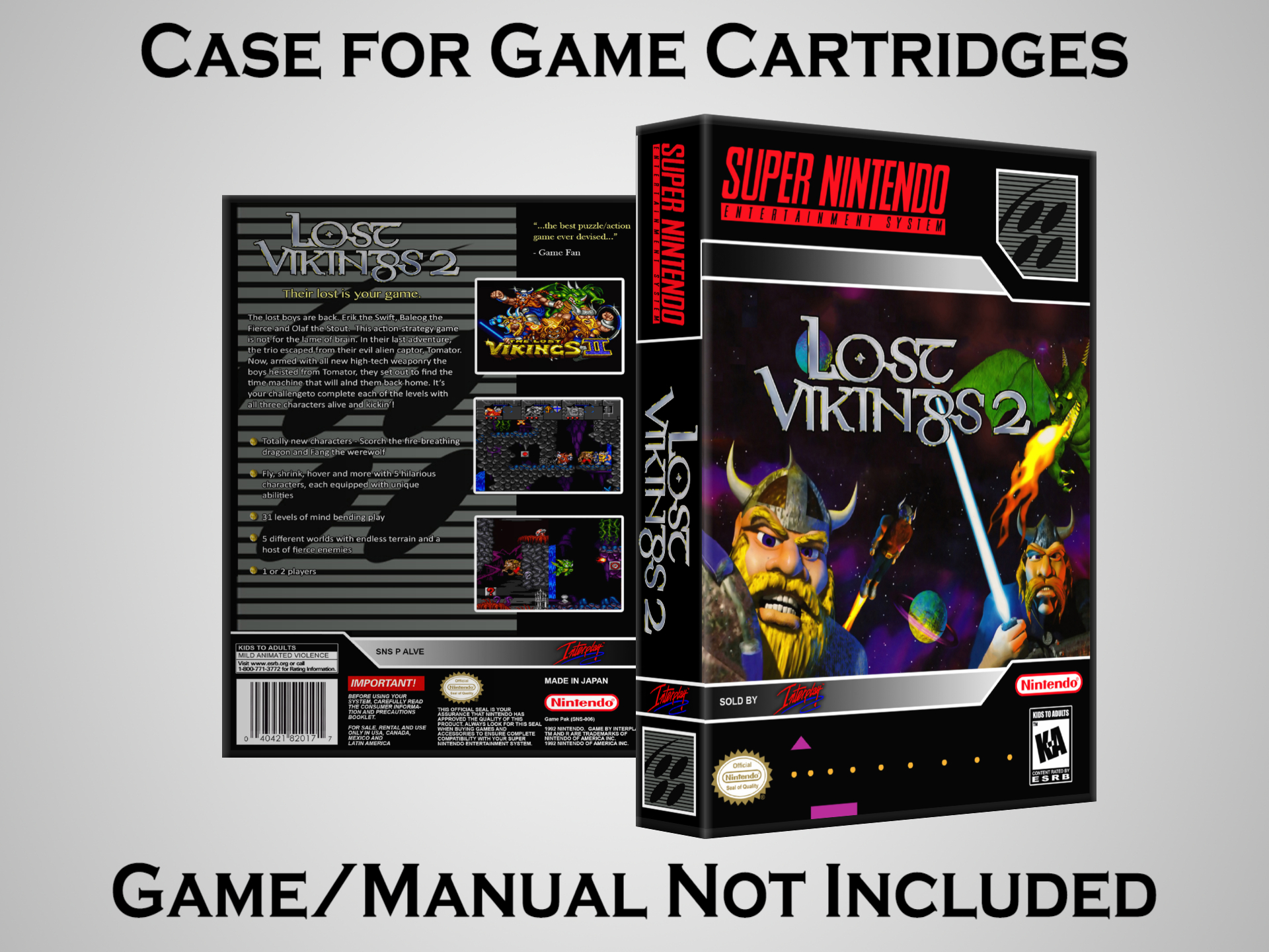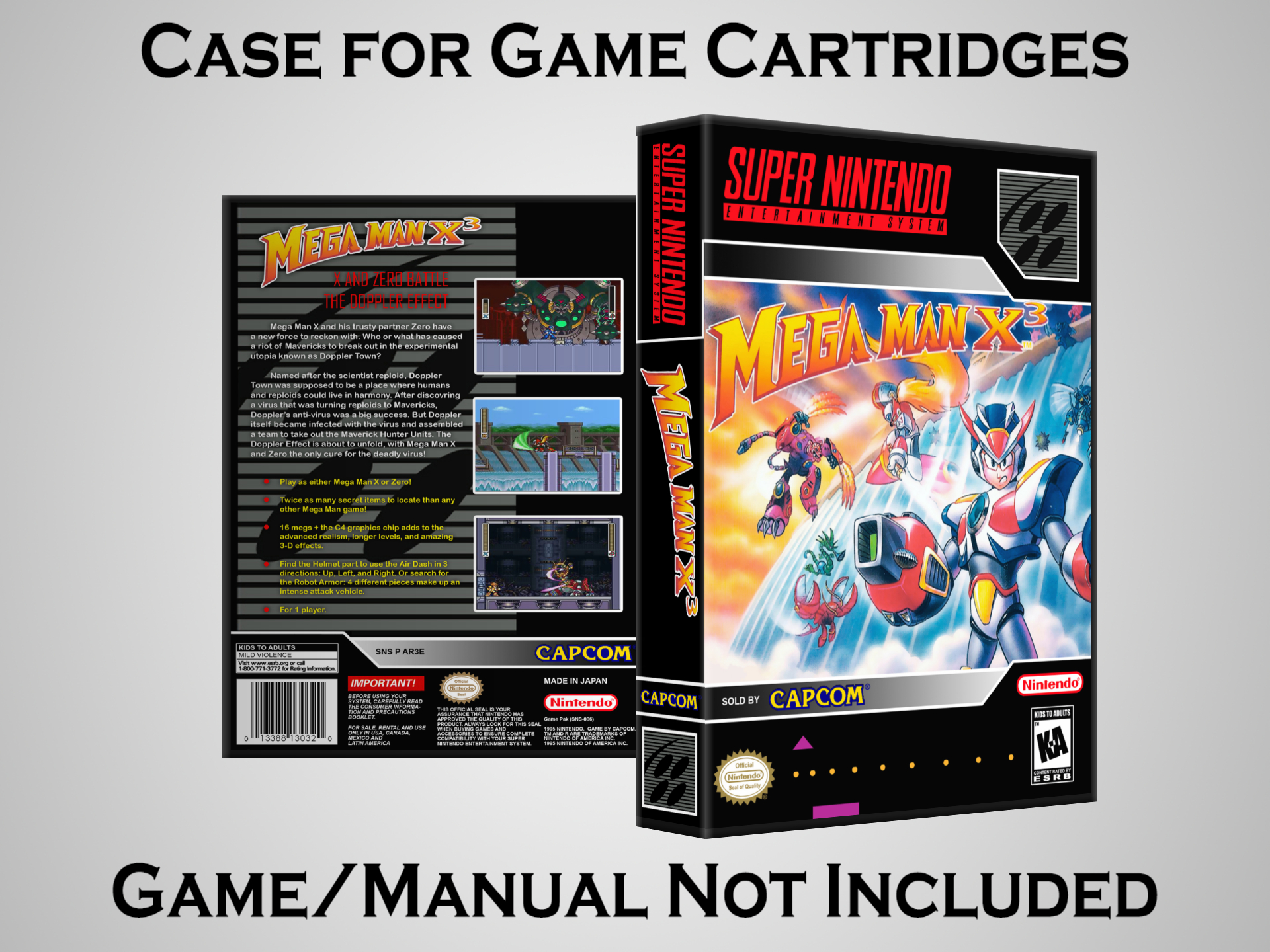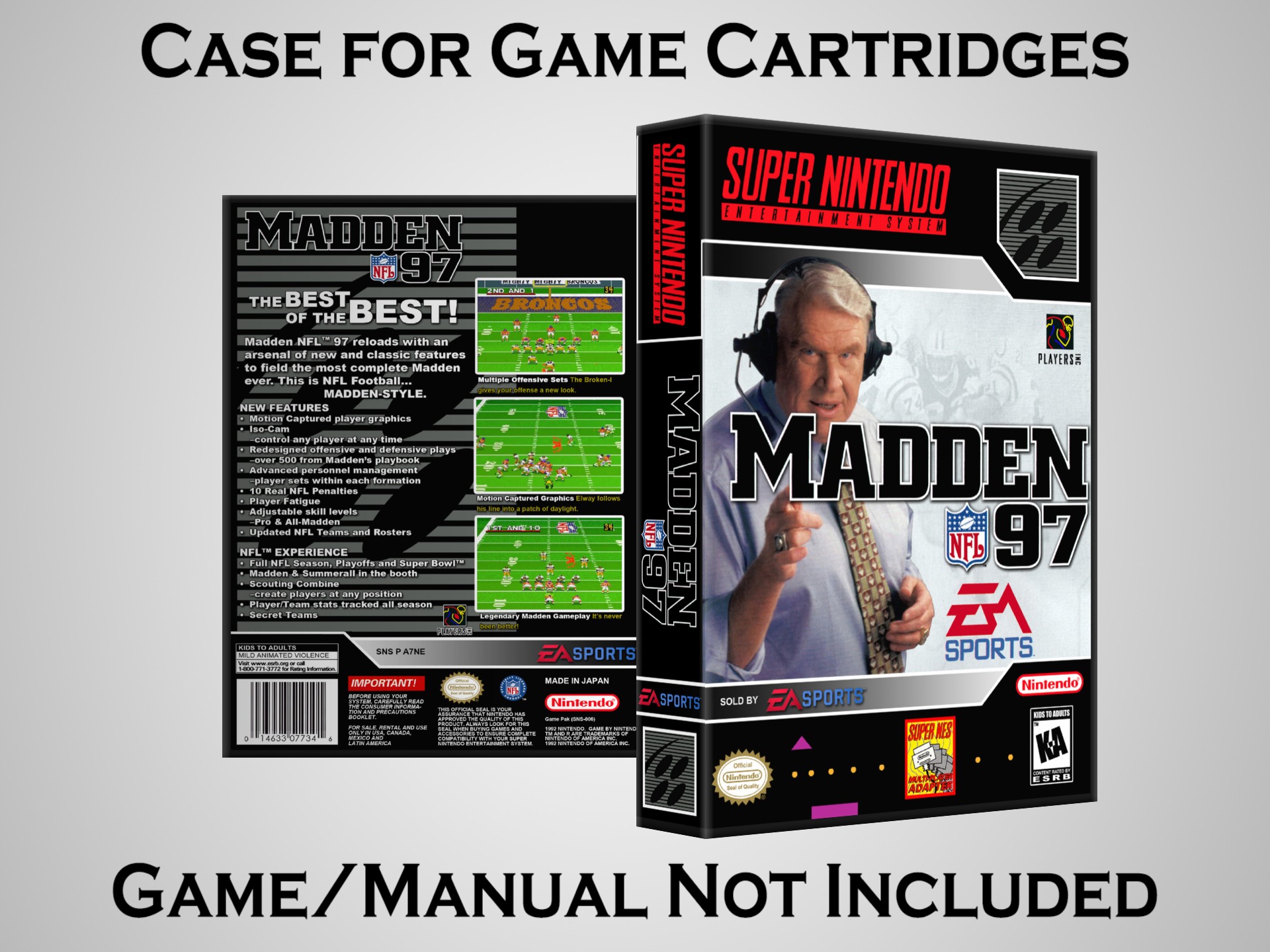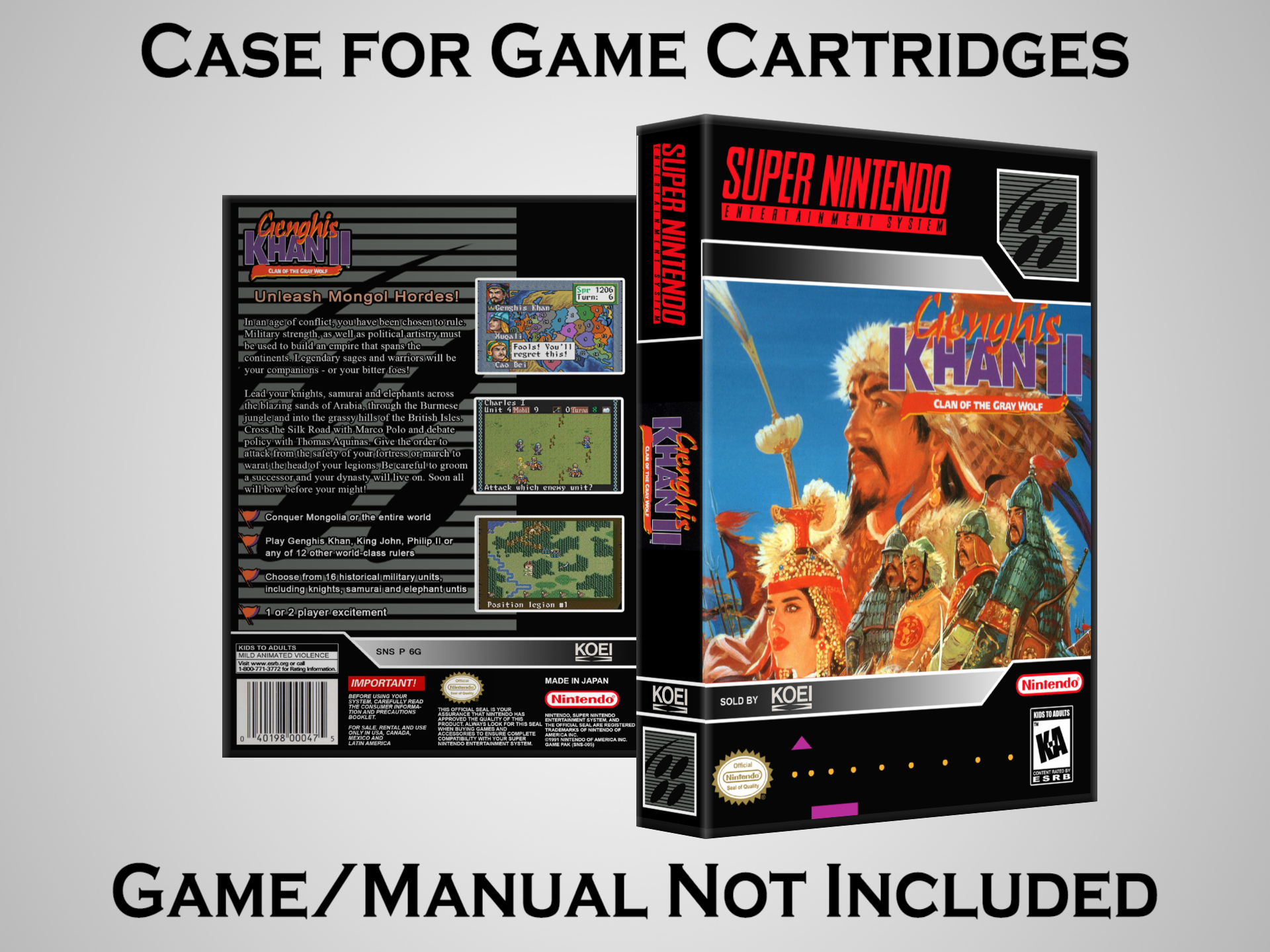NO GAME OR MANUAL IS INCLUDED! This is NOT an original cardboard box. Case Dimensions : 7.25" x 5.25" x 1.125" Case Color : Dark Grey These cases are designed specifically to hold your Super Nintendo (SNES) cartridges. These are not the low quality Universal Game Cases that most other sellers offer. These firmly hold your cartridges in place, and include clips on the opposite side to hold the instruction manuals if you have them. Our Super Nintendo cases are split into multiple listings alphabetically due to the limit on options in one listing. You can find the rest of our cases in the following links: SNES Cases from # to F SNES Cases from G to N SNES Cases from O to S SNES Cases from T to Z Click here to find more cases in our eBay store!