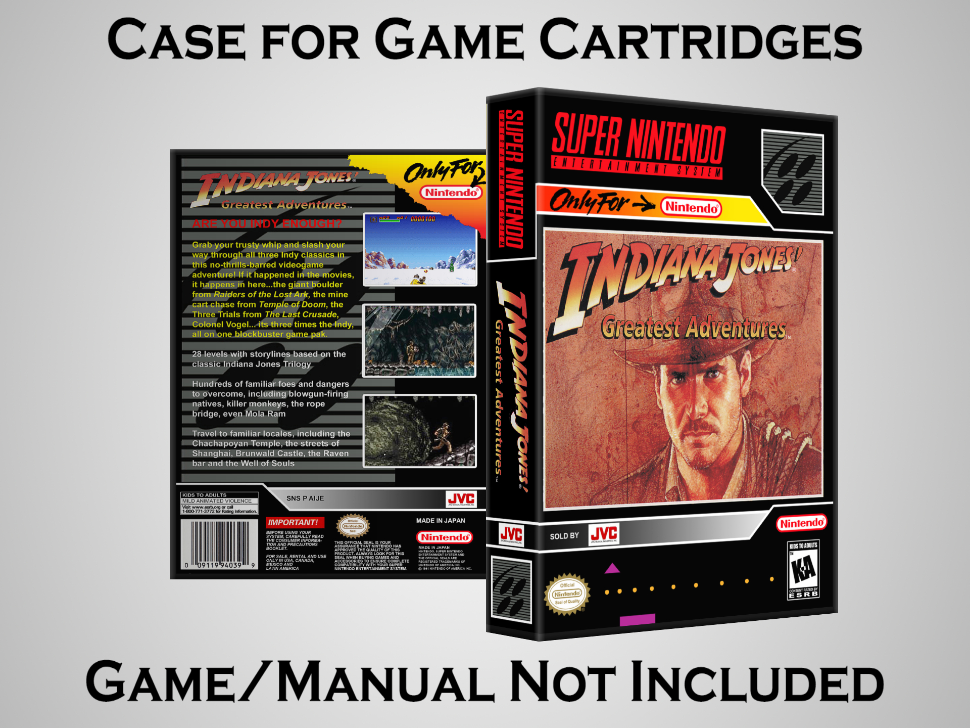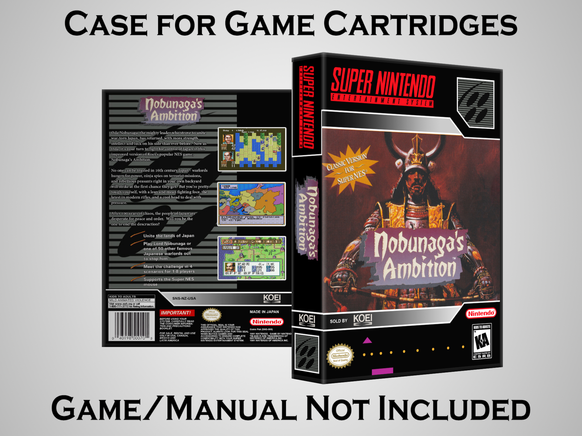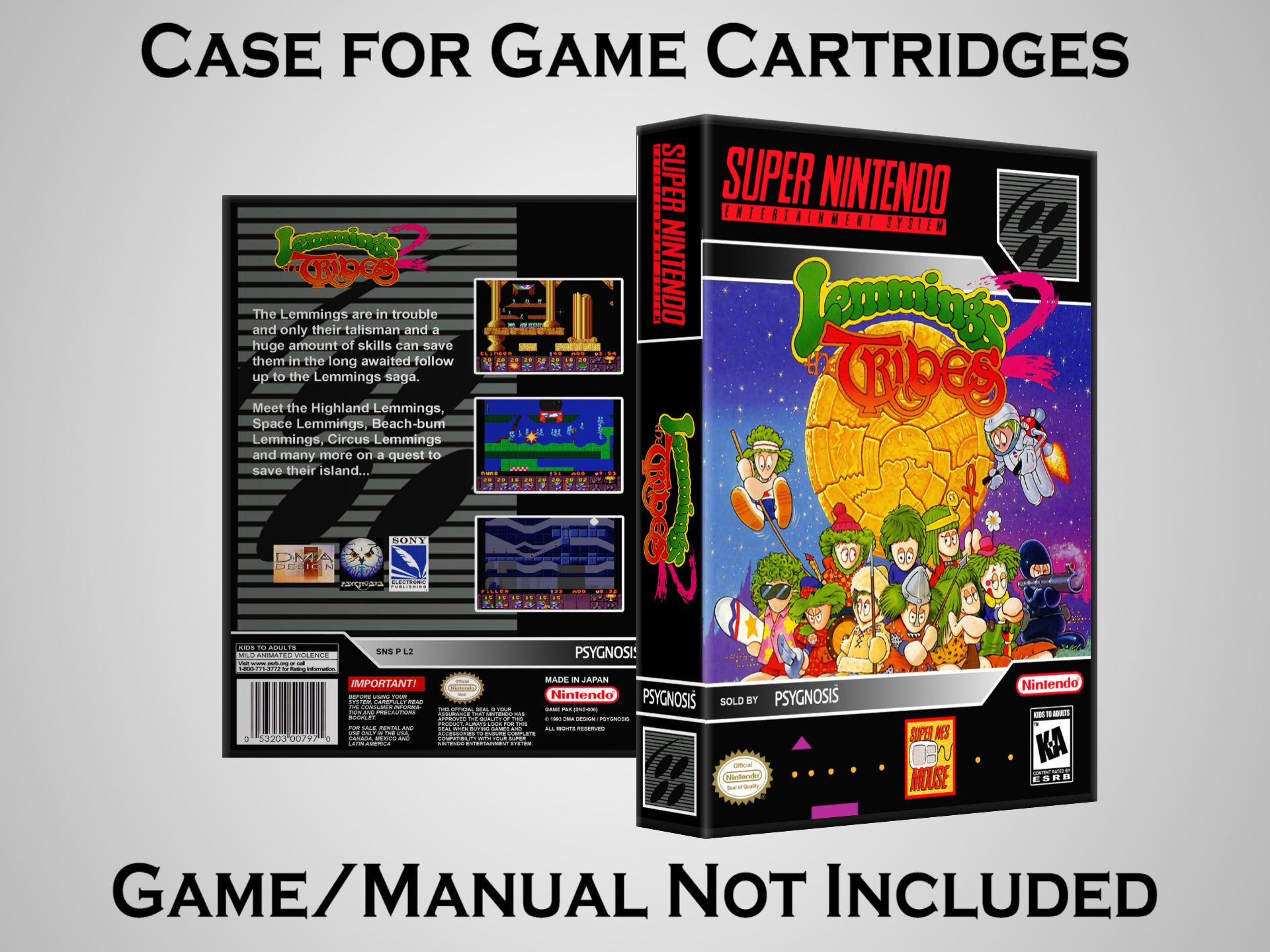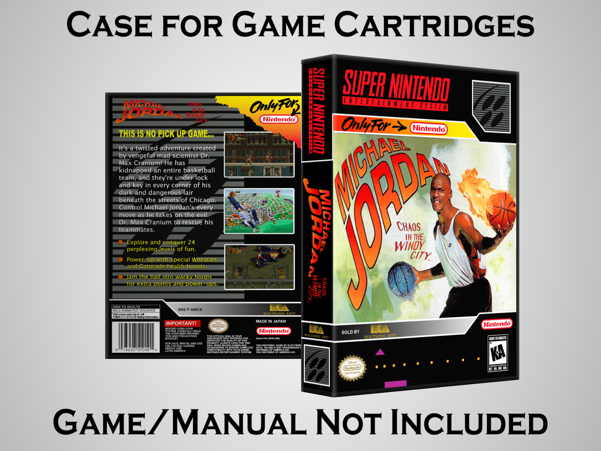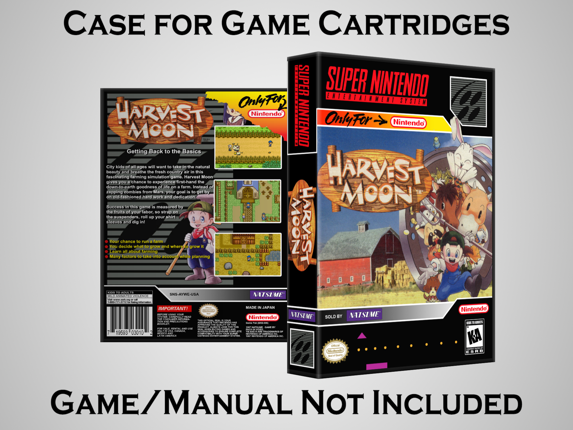 NO GAME OR MANUAL IS INCLUDED! This is NOT an original cardboard box. Case Dimensions : 7.25" x 5.25" x 1.125" Case Color : Dark Grey These cases are designed specifically to hold your Super Nintendo (SNES) cartridges. These are not the low quality Universal Game Cases that most other sellers offer. These firmly hold your cartridges in place, and include clips on the opposite side to hold the instruction manuals if you have them. Our Super Nintendo cases are split into multiple listings alphabetically due to the limit on options in one listing. You can find the rest of our cases in the following links: SNES Cases from # to F SNES Cases from G to N SNES Cases from O to S SNES Cases from T to Z Click here to find more cases in our eBay store!