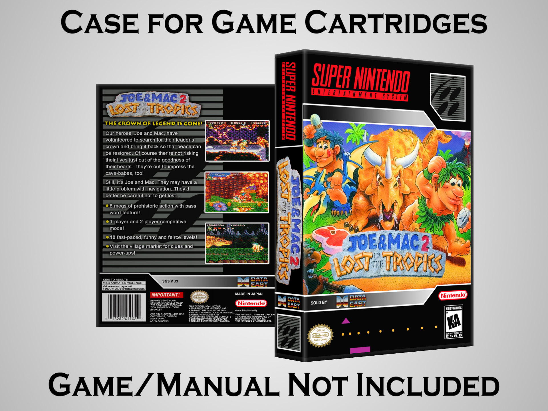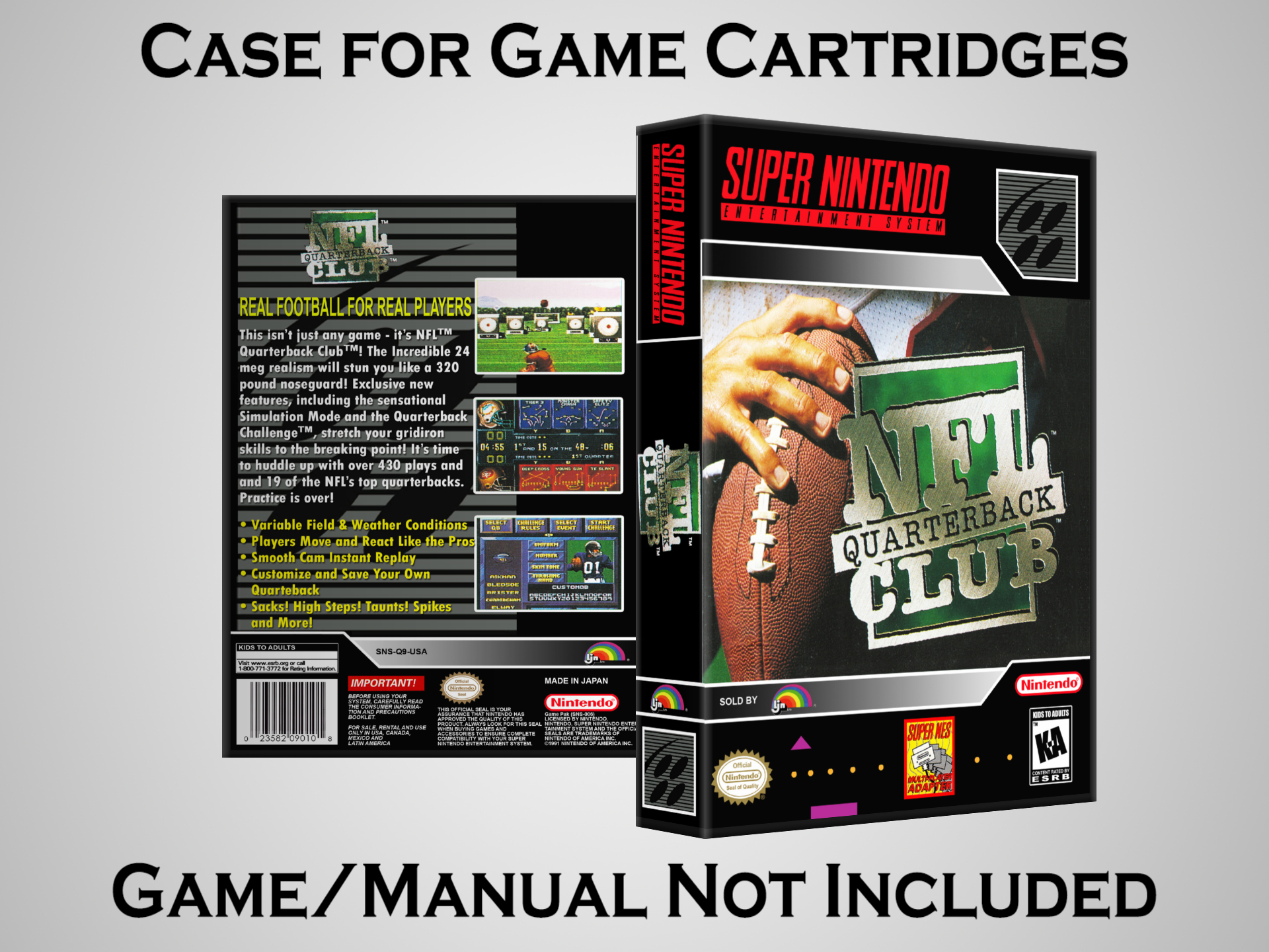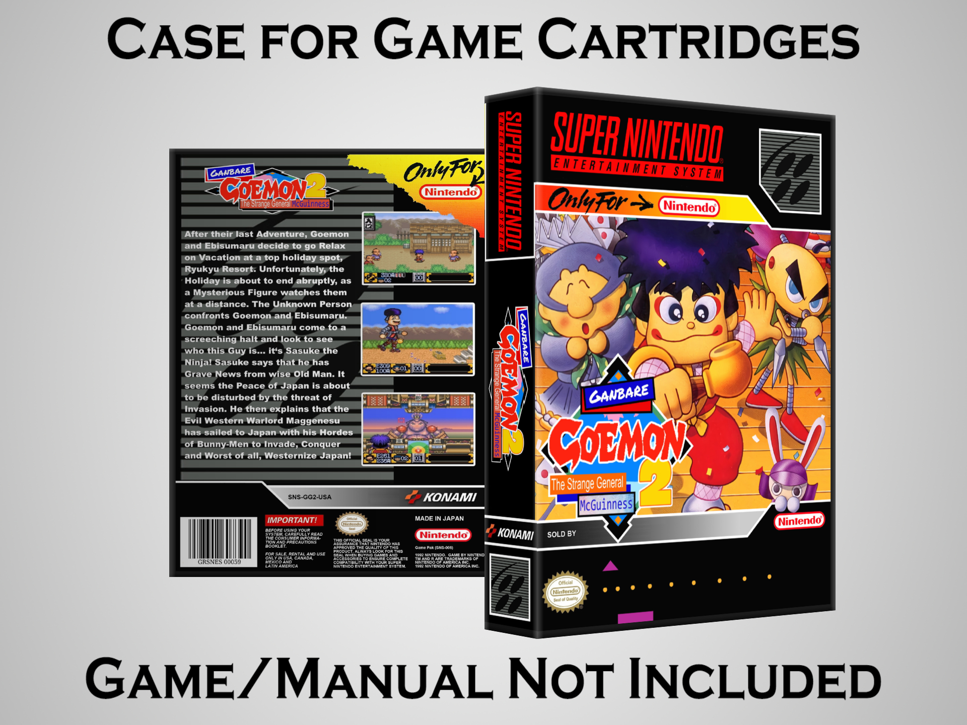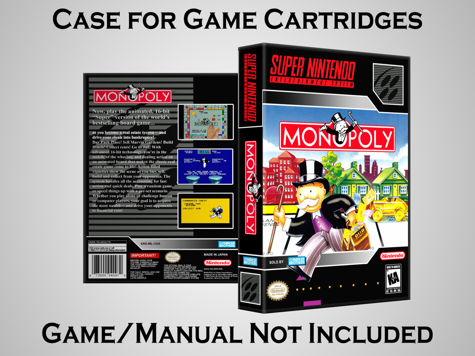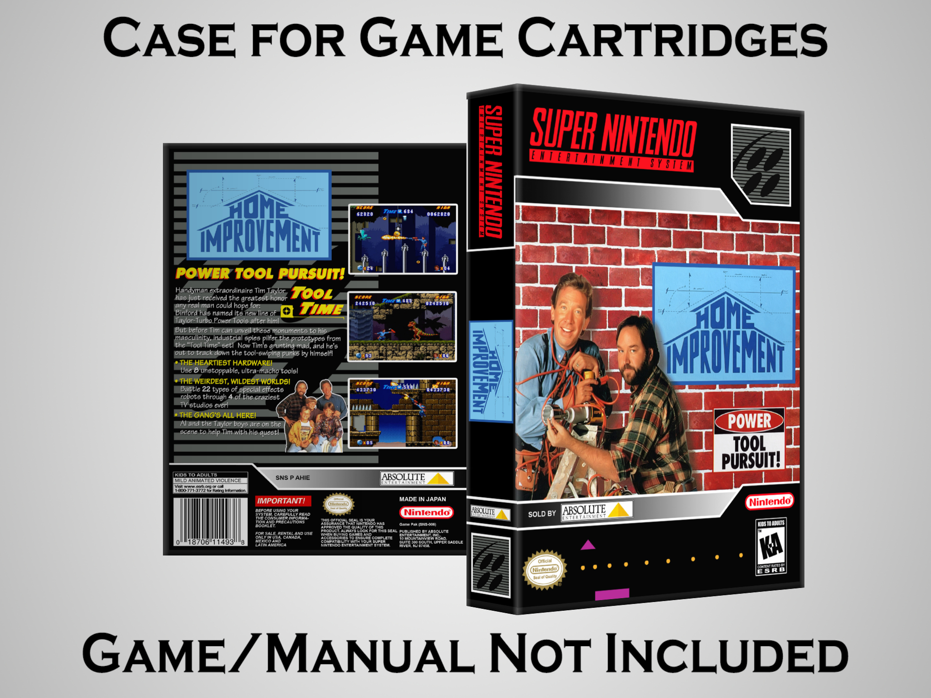 NO GAME OR MANUAL IS INCLUDED! This is NOT an original cardboard box. Case Dimensions : 7.25" x 5.25" x 1.125" Case Color : Dark Grey These cases are designed specifically to hold your Super Nintendo (SNES) cartridges. These are not the low quality Universal Game Cases that most other sellers offer. These firmly hold your cartridges in place, and include clips on the opposite side to hold the instruction manuals if you have them. Our Super Nintendo cases are split into multiple listings alphabetically due to the limit on options in one listing. You can find the rest of our cases in the following links: SNES Cases from # to F SNES Cases from G to N SNES Cases from O to S SNES Cases from T to Z Click here to find more cases in our eBay store!