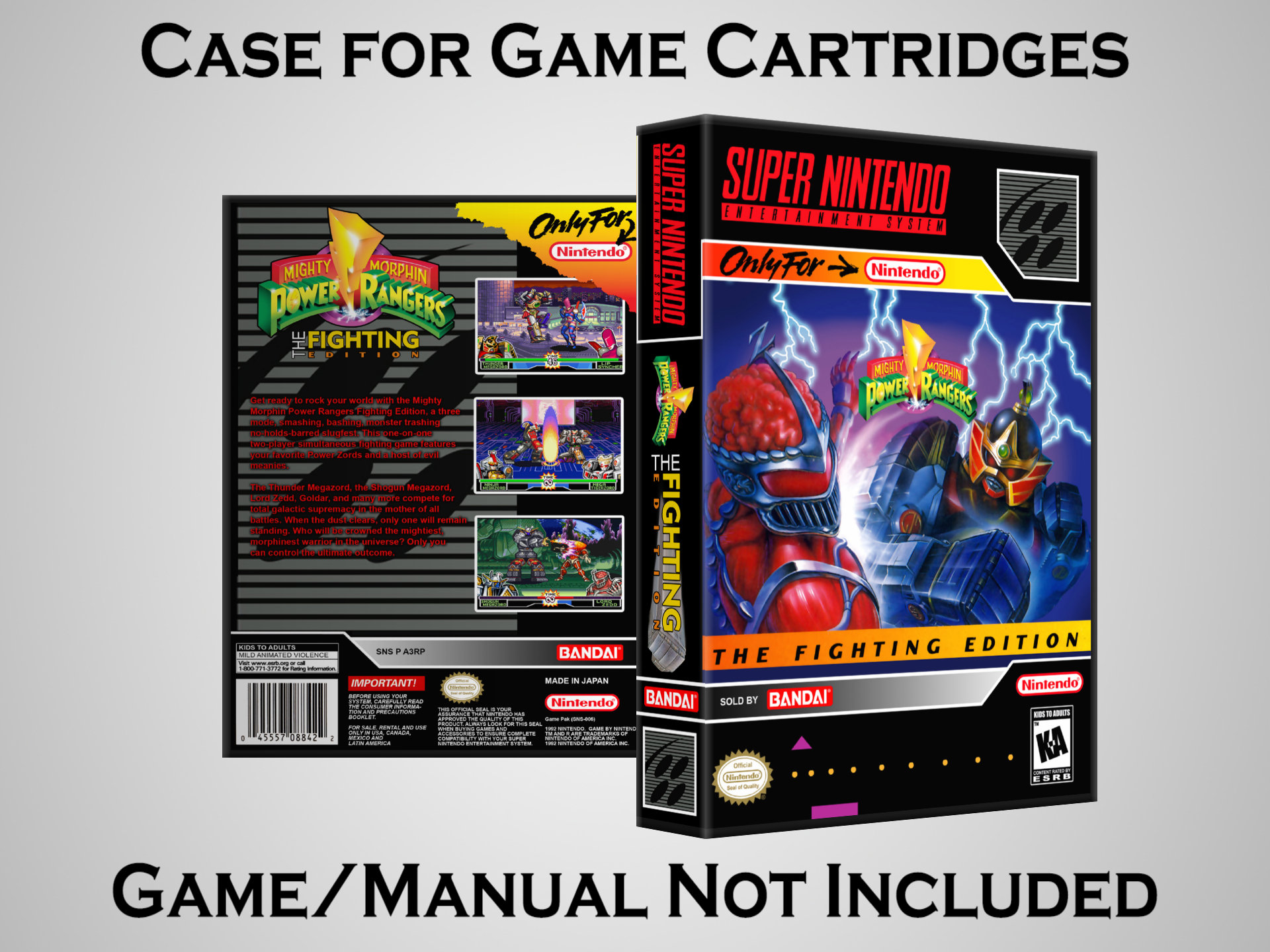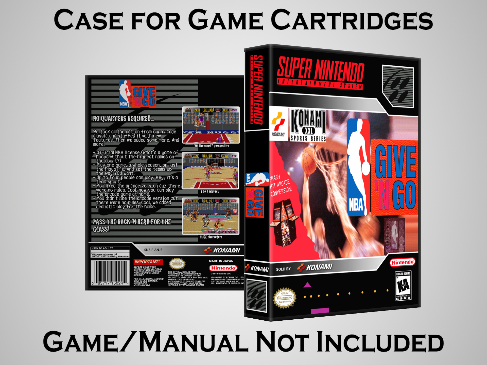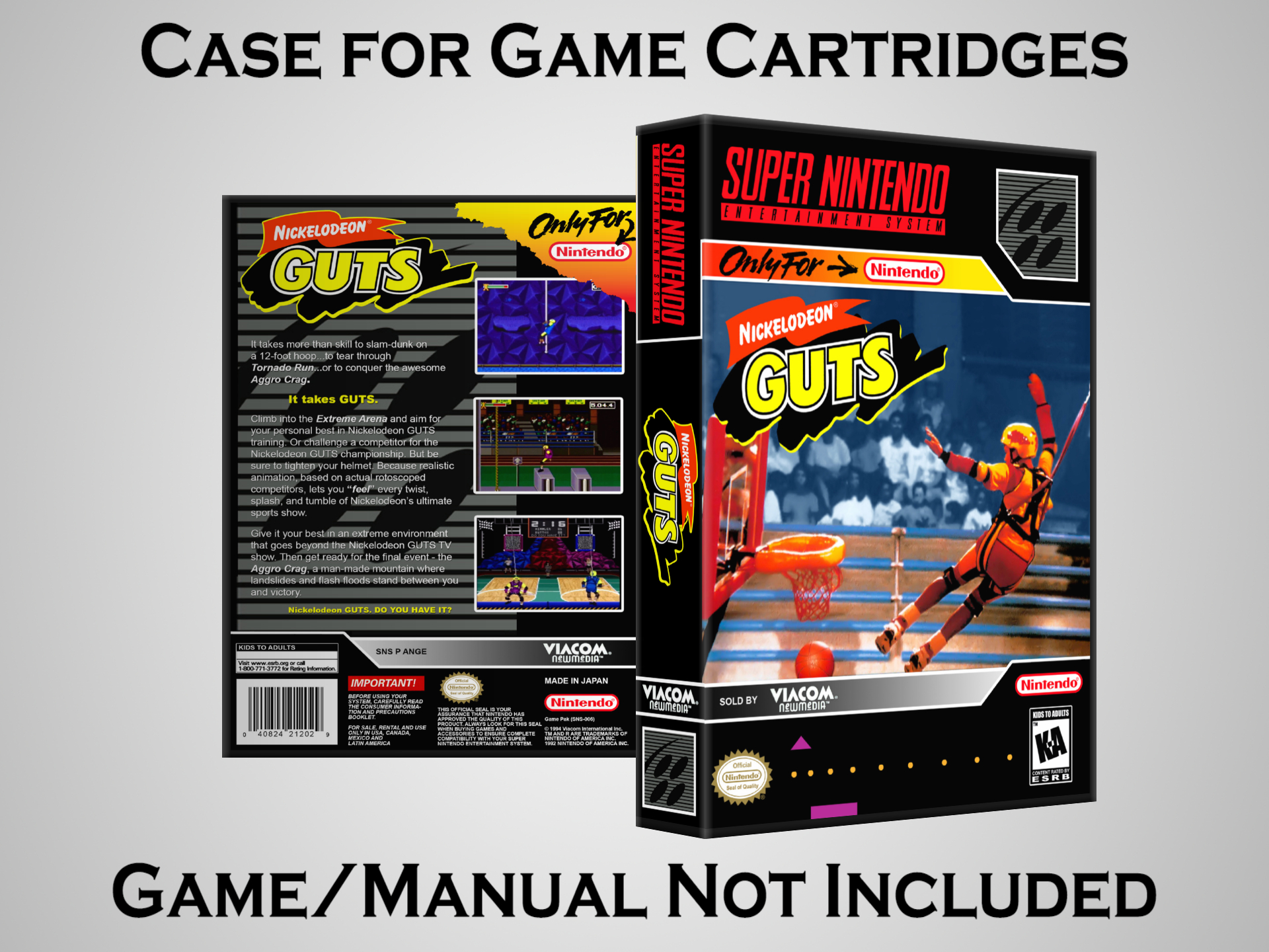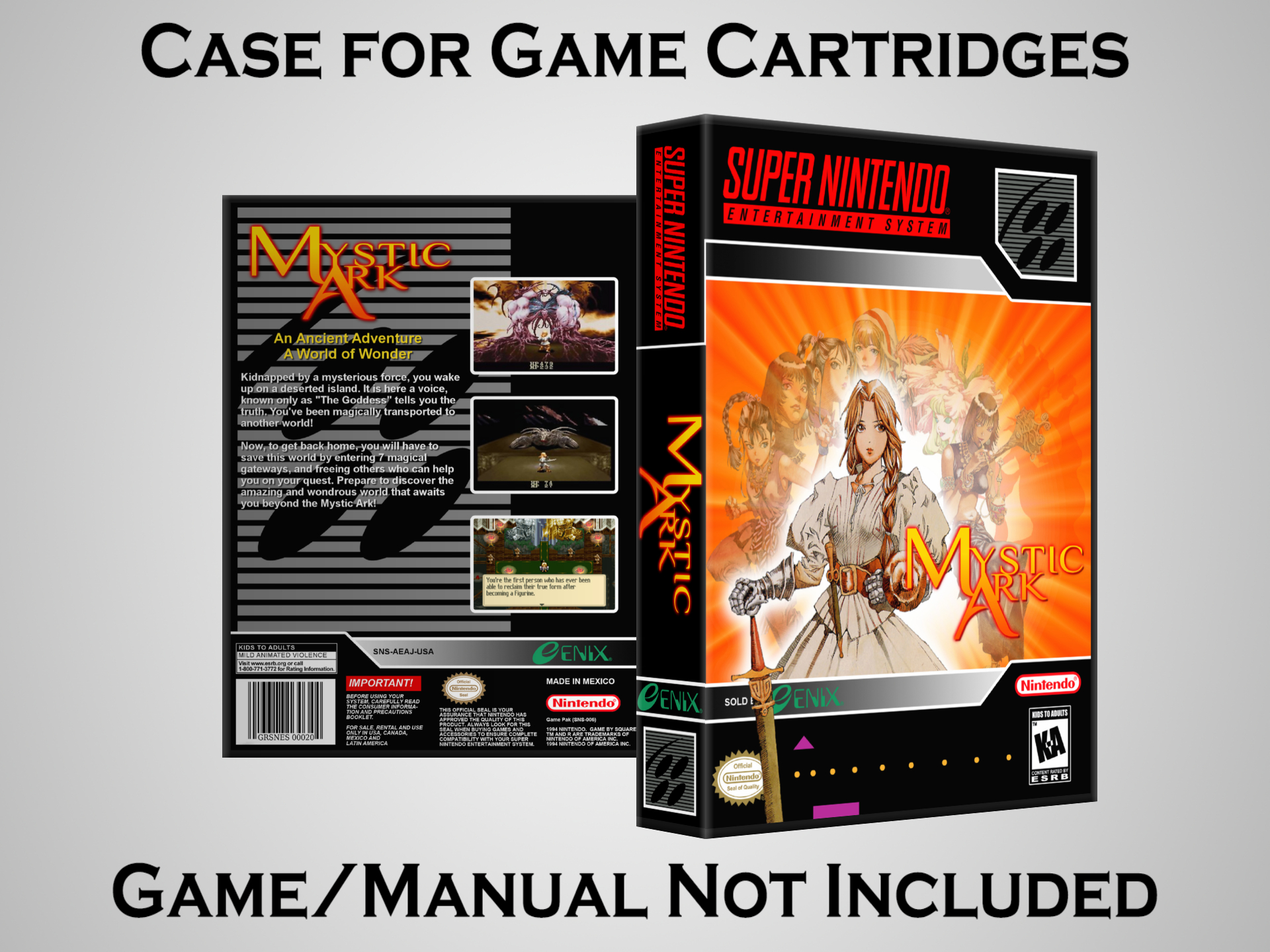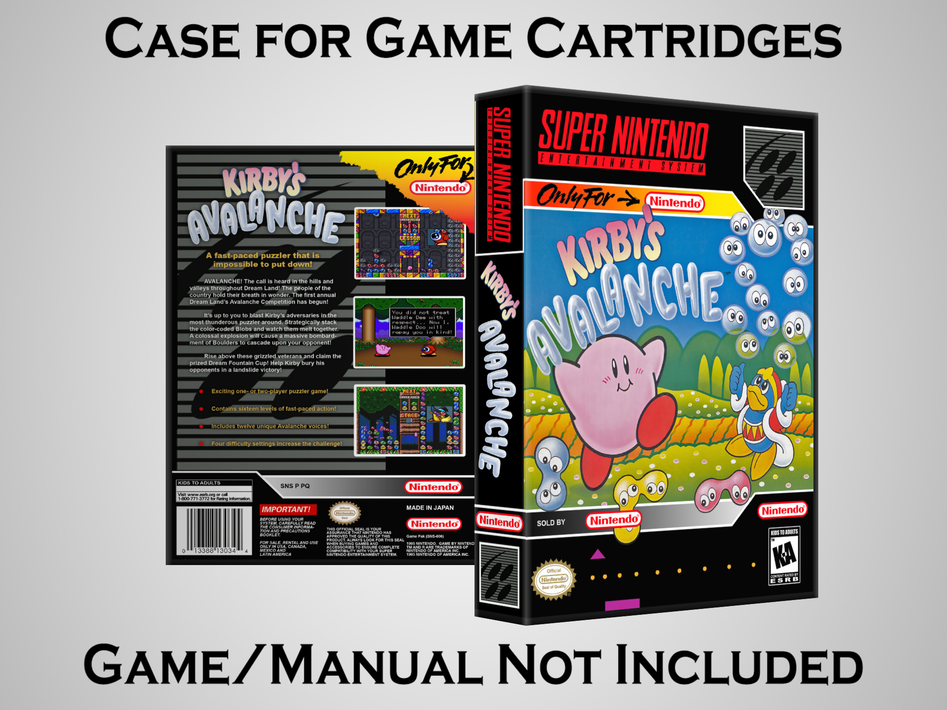 NO GAME OR MANUAL IS INCLUDED! This is NOT an original cardboard box. Case Dimensions : 7.25" x 5.25" x 1.125" Case Color : Dark Grey These cases are designed specifically to hold your Super Nintendo (SNES) cartridges. These are not the low quality Universal Game Cases that most other sellers offer. These firmly hold your cartridges in place, and include clips on the opposite side to hold the instruction manuals if you have them. Our Super Nintendo cases are split into multiple listings alphabetically due to the limit on options in one listing. You can find the rest of our cases in the following links: SNES Cases from # to F SNES Cases from G to N SNES Cases from O to S SNES Cases from T to Z Click here to find more cases in our eBay store!