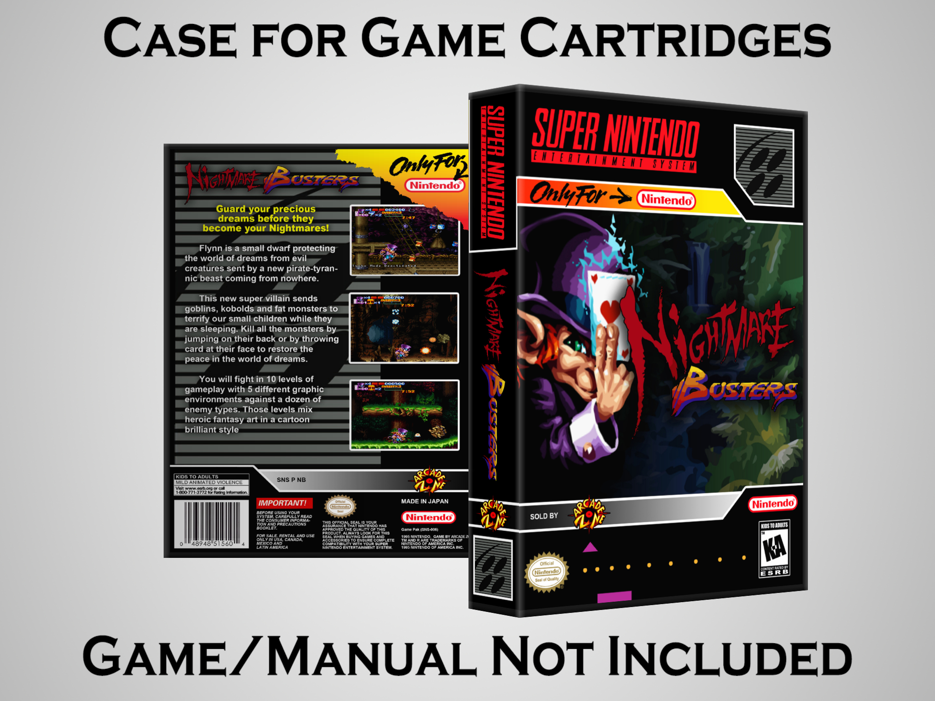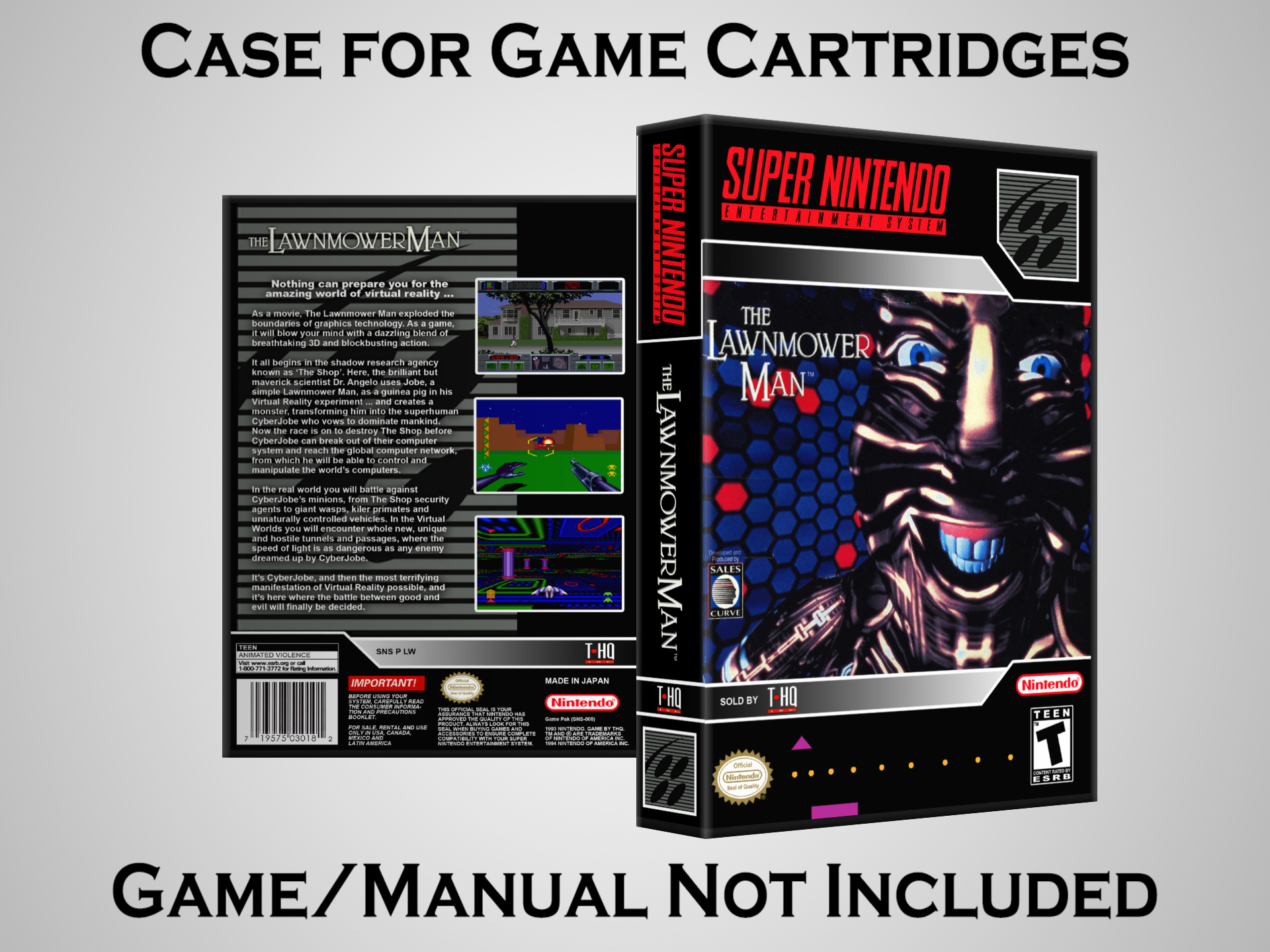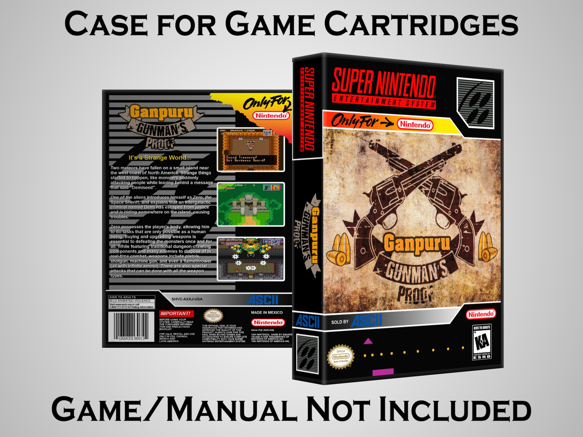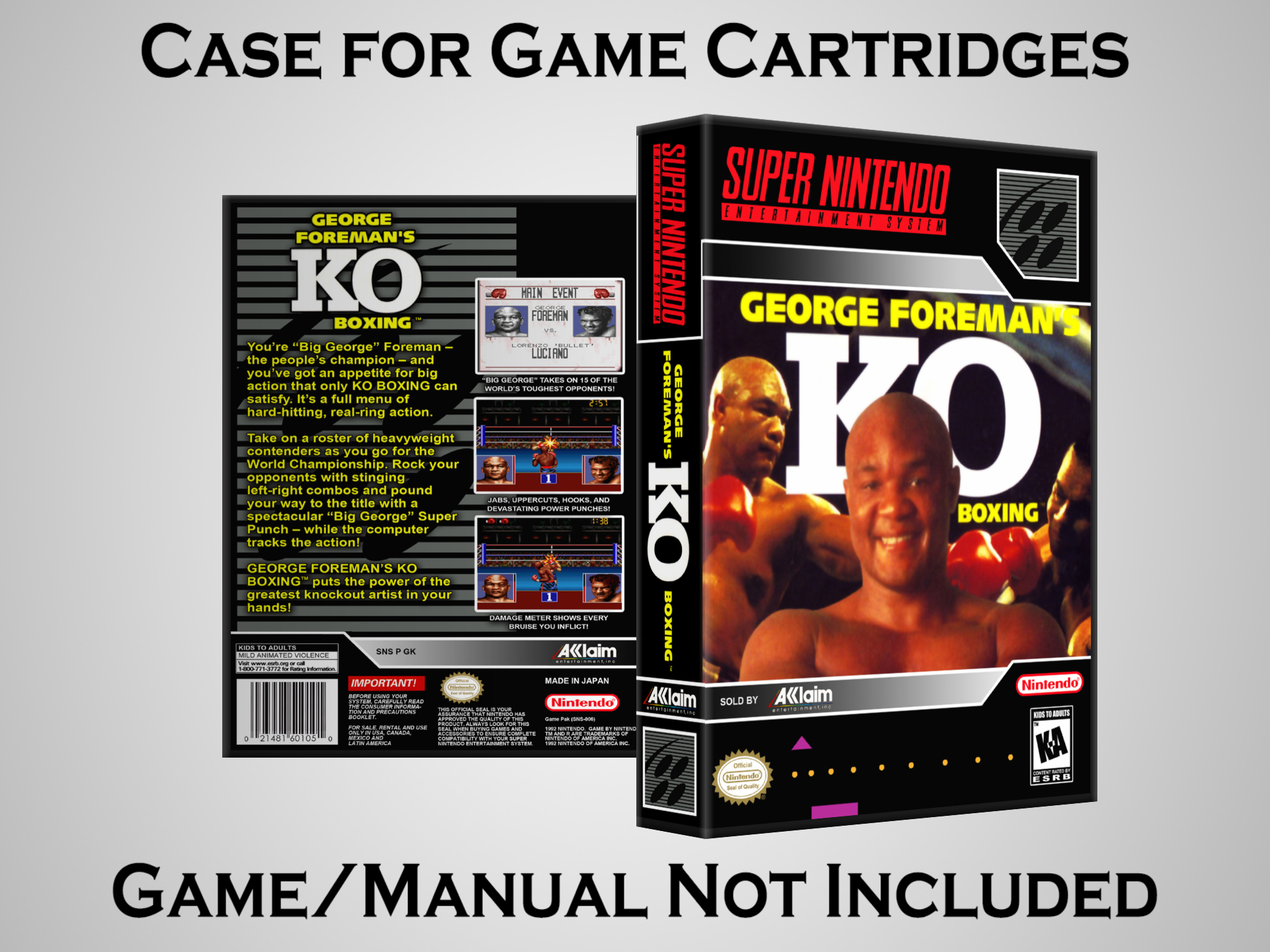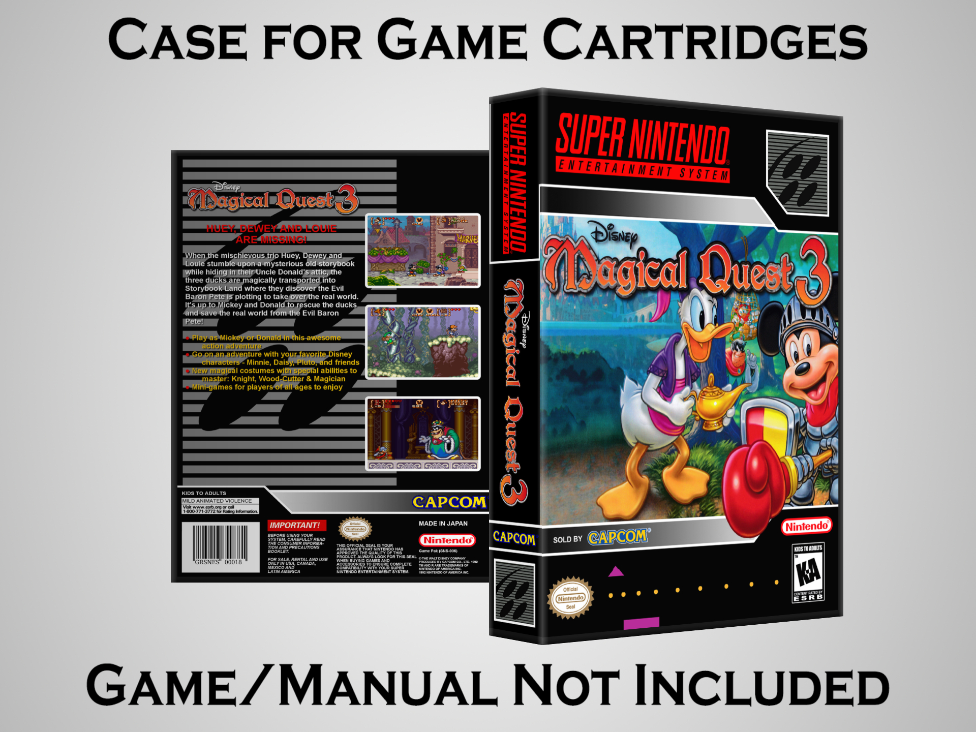 NO GAME OR MANUAL IS INCLUDED! This is NOT an original cardboard box. Case Dimensions : 7.25" x 5.25" x 1.125" Case Color : Dark Grey These cases are designed specifically to hold your Super Nintendo (SNES) cartridges. These are not the low quality Universal Game Cases that most other sellers offer. These firmly hold your cartridges in place, and include clips on the opposite side to hold the instruction manuals if you have them. Our Super Nintendo cases are split into multiple listings alphabetically due to the limit on options in one listing. You can find the rest of our cases in the following links: SNES Cases from # to F SNES Cases from G to N SNES Cases from O to S SNES Cases from T to Z Click here to find more cases in our eBay store!