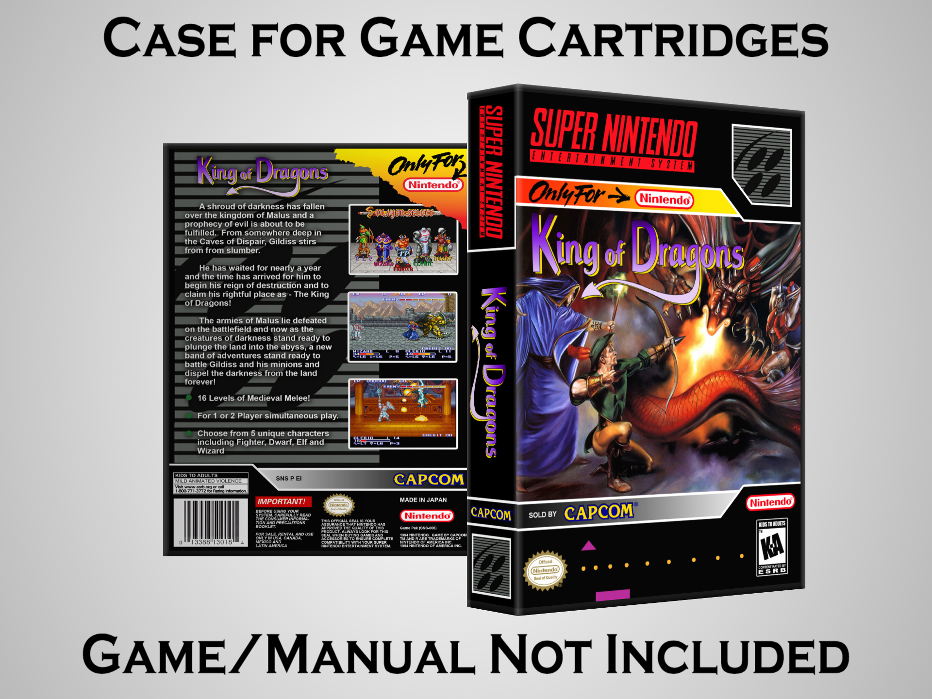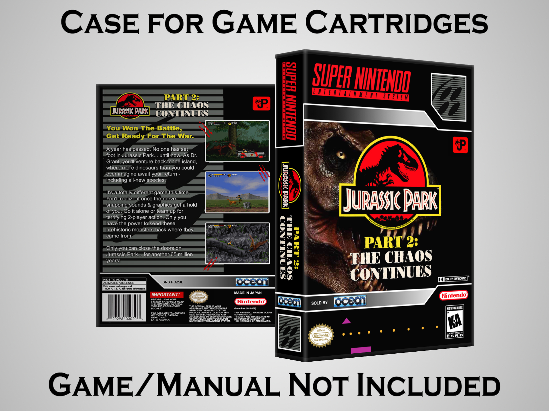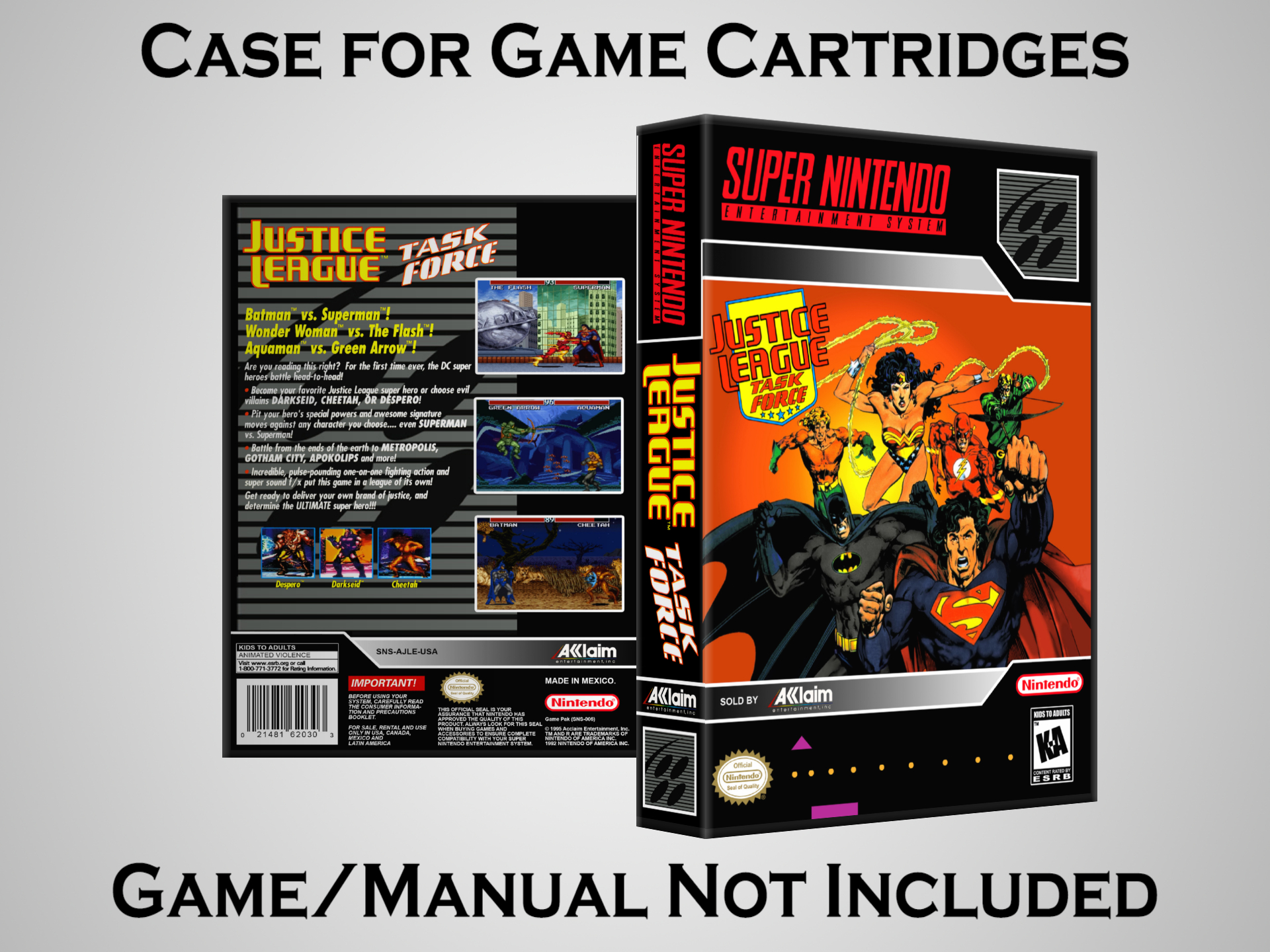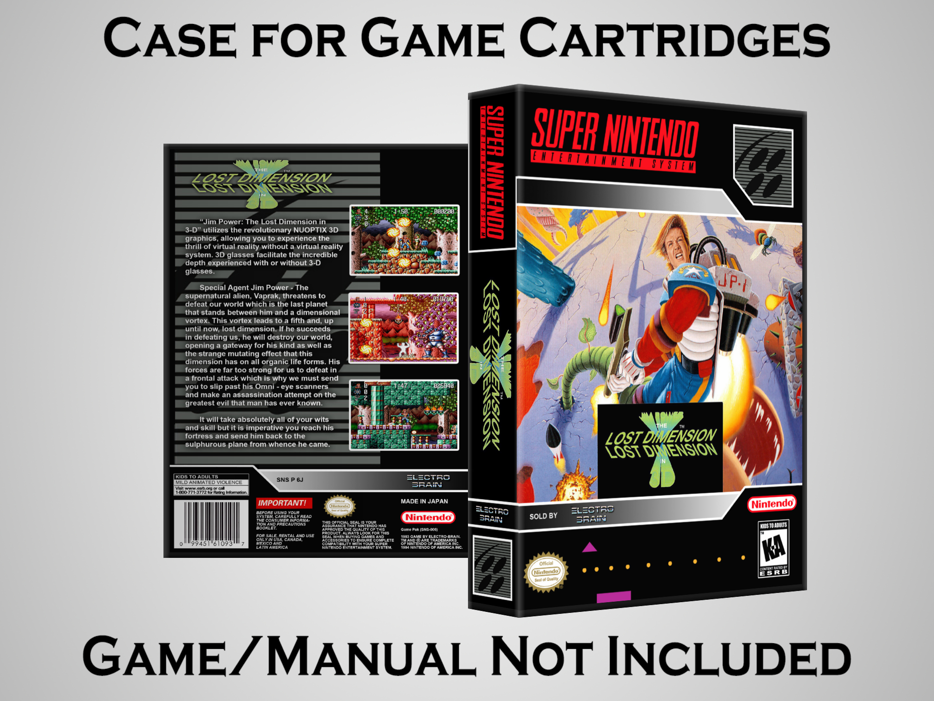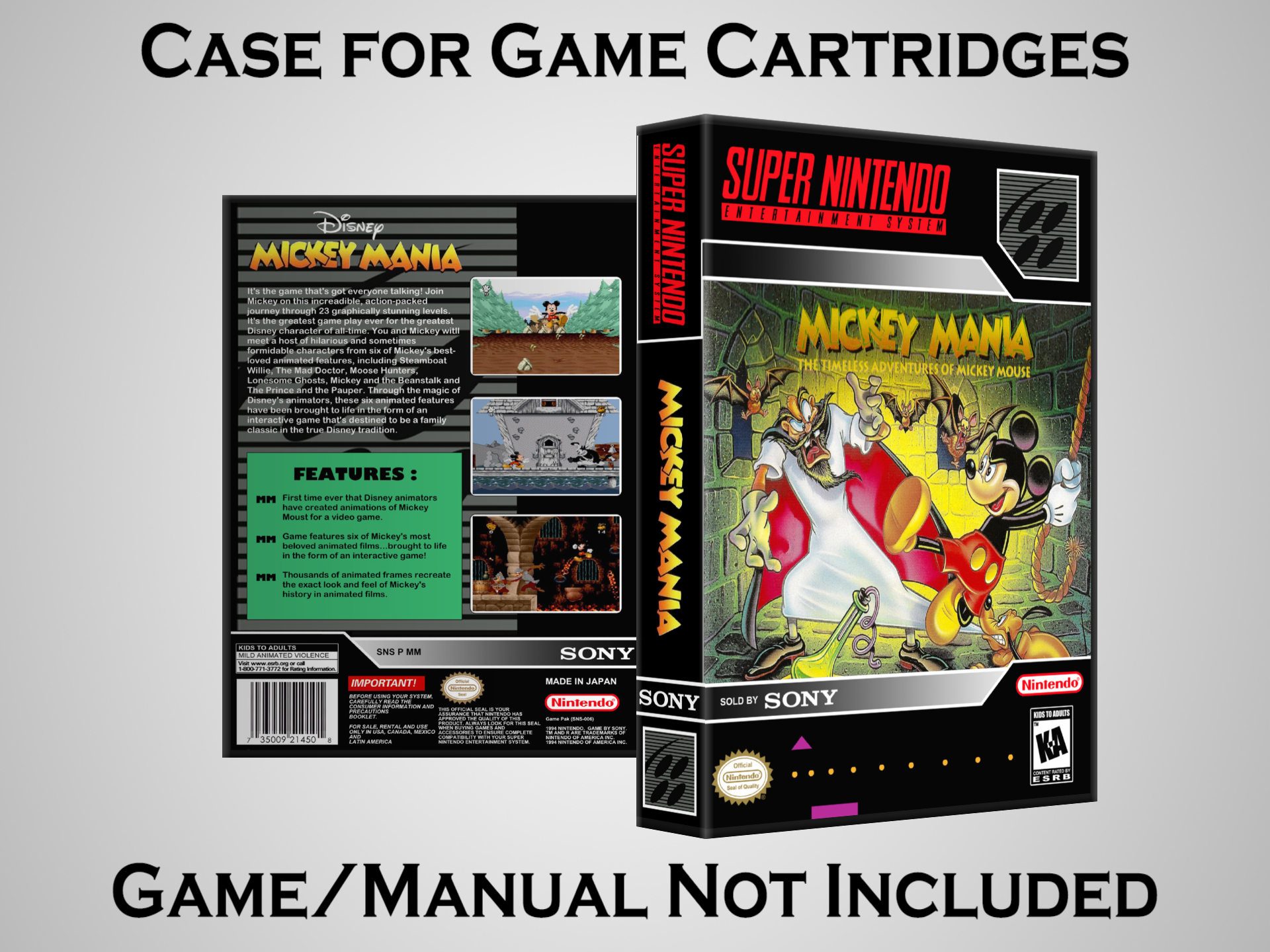 NO GAME OR MANUAL IS INCLUDED! This is NOT an original cardboard box. Case Dimensions : 7.25" x 5.25" x 1.125" Case Color : Dark Grey These cases are designed specifically to hold your Super Nintendo (SNES) cartridges. These are not the low quality Universal Game Cases that most other sellers offer. These firmly hold your cartridges in place, and include clips on the opposite side to hold the instruction manuals if you have them. Our Super Nintendo cases are split into multiple listings alphabetically due to the limit on options in one listing. You can find the rest of our cases in the following links: SNES Cases from # to F SNES Cases from G to N SNES Cases from O to S SNES Cases from T to Z Click here to find more cases in our eBay store!